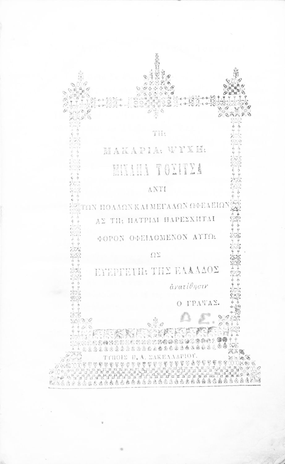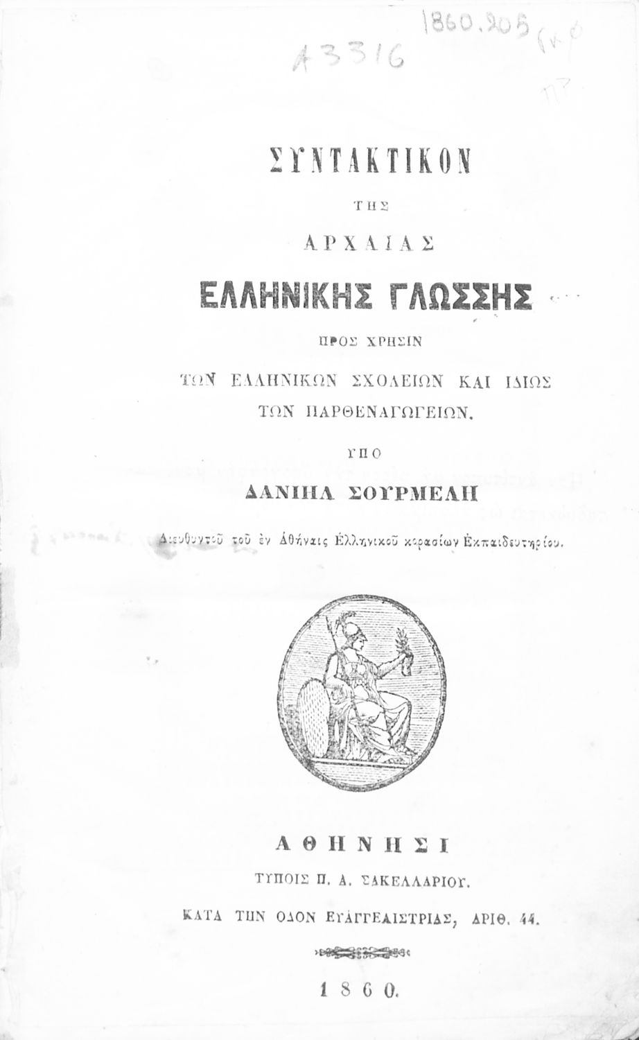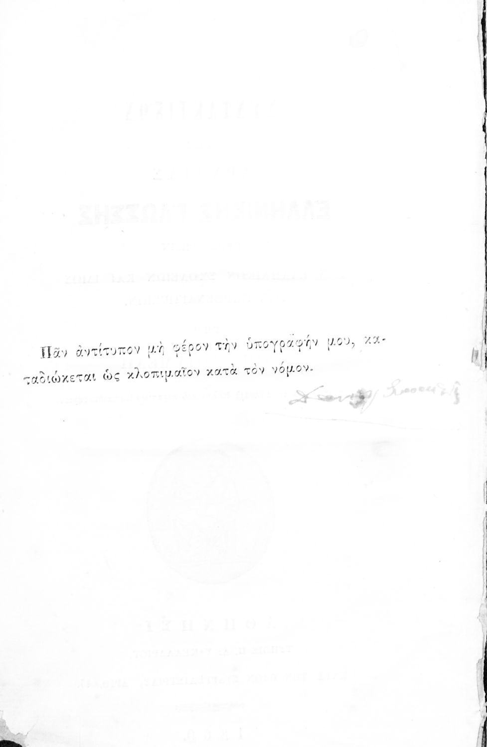 Εκδότης: Π.Α. Σακελλαρίου Έτος έκδοσης: 1860 Τόπος έκδοσης: Αθήνα |