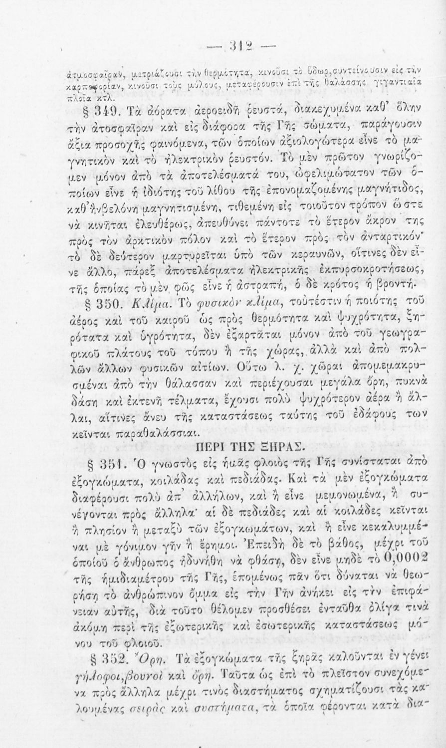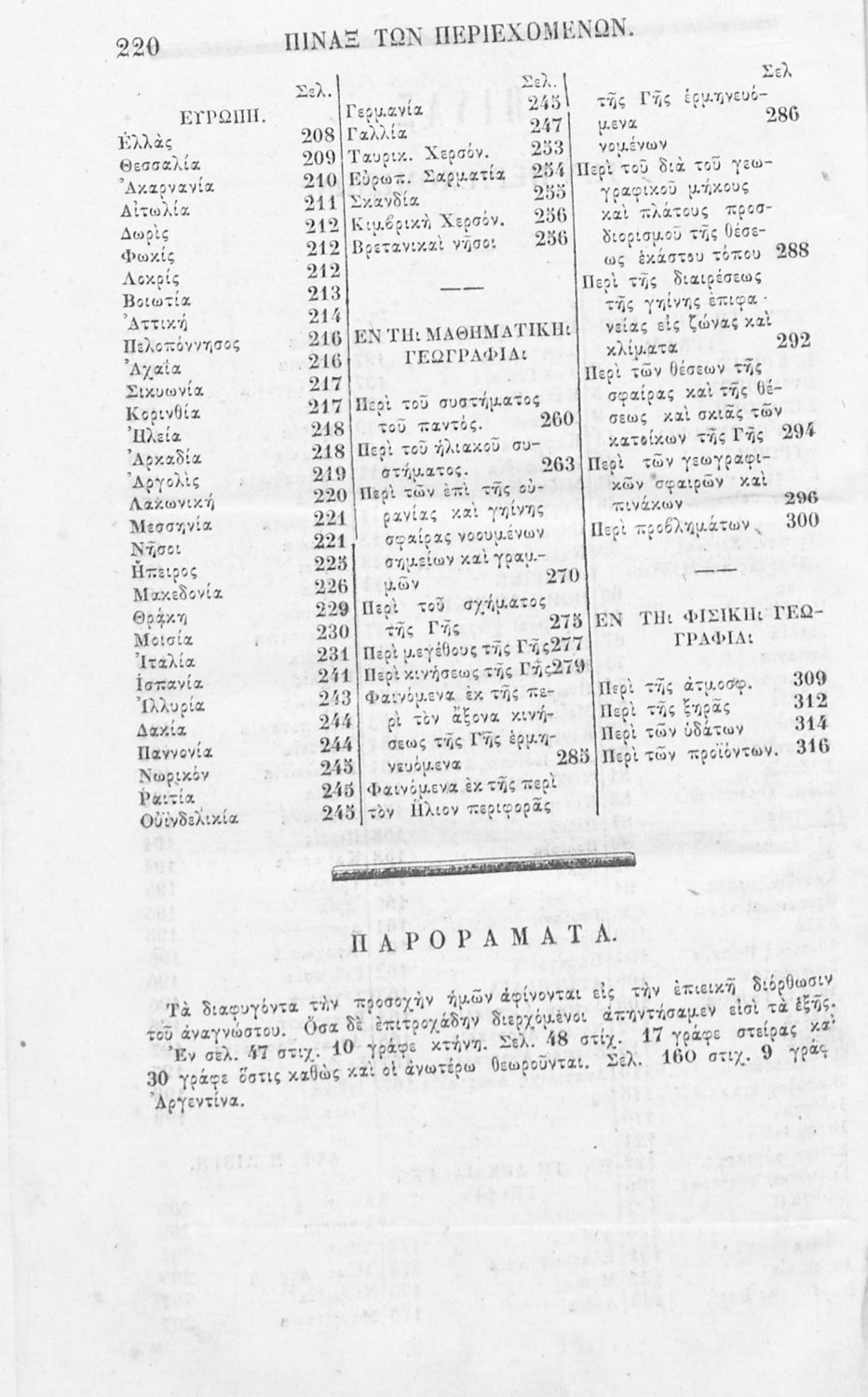 Σχολικό εγχειρίδιο Γεωγραφίας για τα Ελληνικά Σχολεία που περιλαμβάνει στοιχεία φυσικής, μαθηματικής και γεωπολιτικής γεωγραφίας και ανθρωπογεωγραφίας και αναλύει τις πέντε ηπείρους, την Ελλάδα αλλά και τη Φρυγία, τη Λυδία, τη Βιθυνία και τη Φοινίκη.