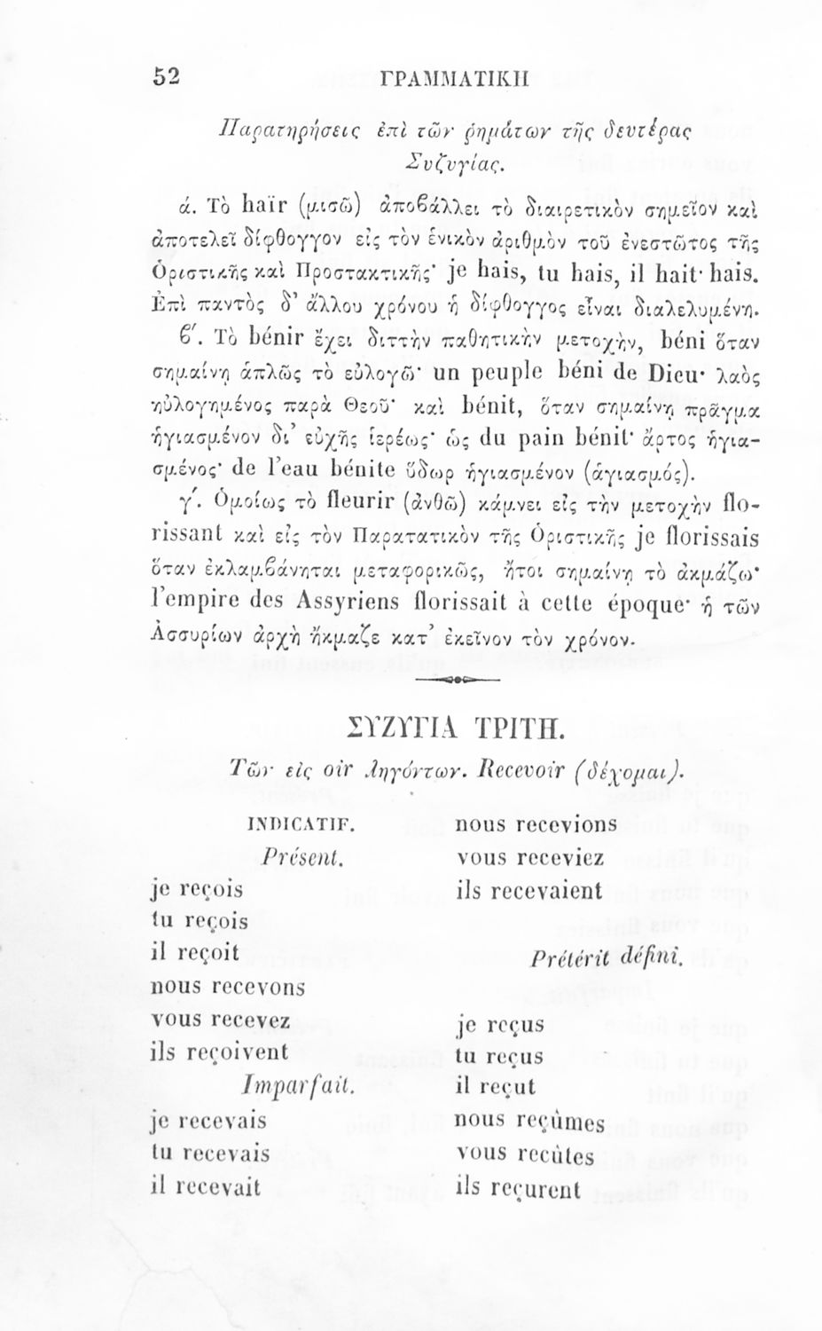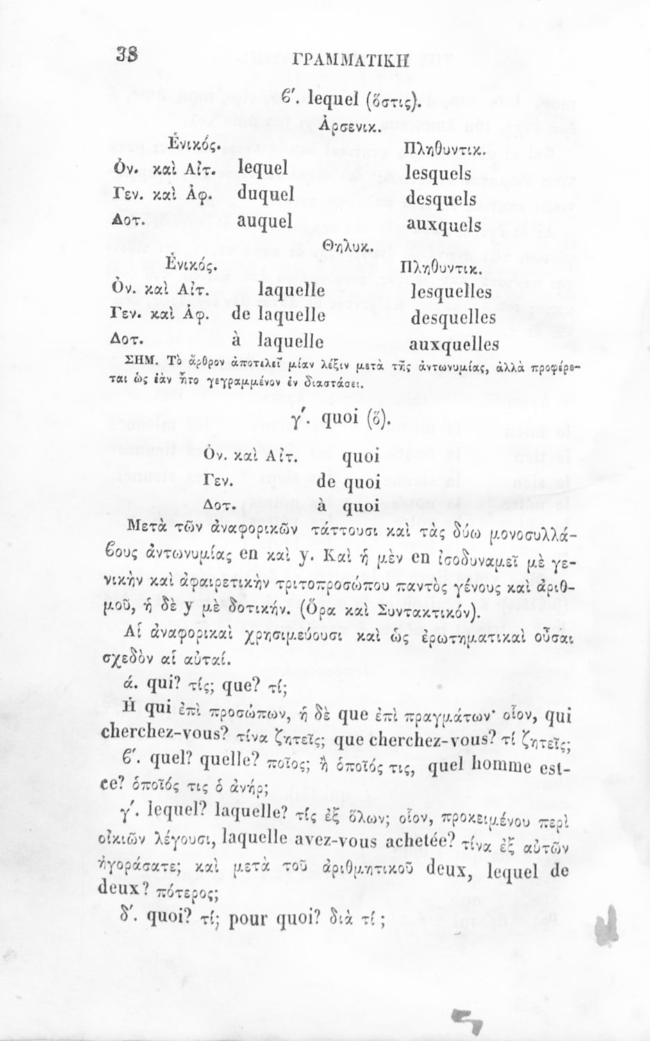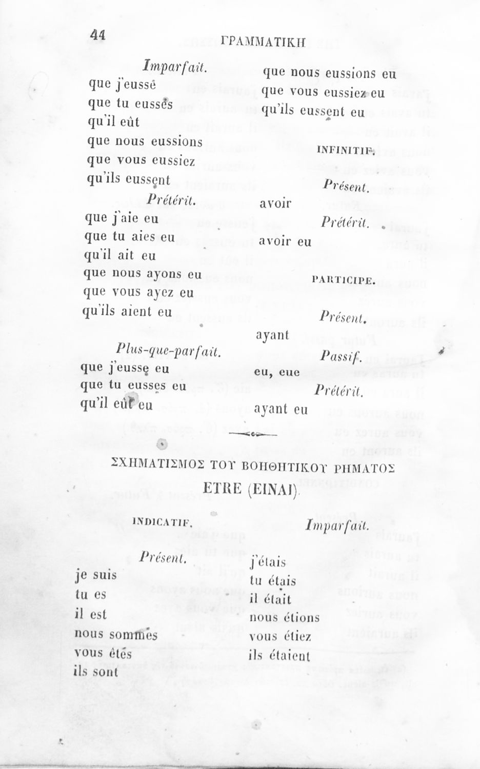 Κωδικός αναγνώρισης: 02-03092 Τίτλος: Γραμματική της γαλλικής γλώσσης, συνταχθείσα προς χρήσιν των Γυμνασίων και σχολείων της Ελλάδος Συγγραφέας: Ιωάννης Δ. Καρασούτσας Μέγεθος και υπόστρωμα: Σχολικό εγχειρίδιο, μαλακό εξώφυλλο, 174 σελίδες. |