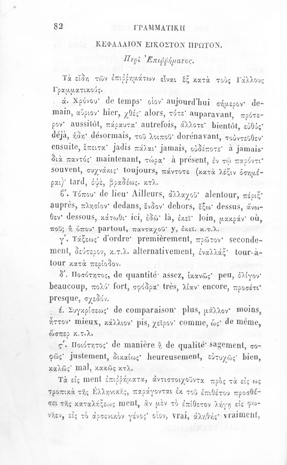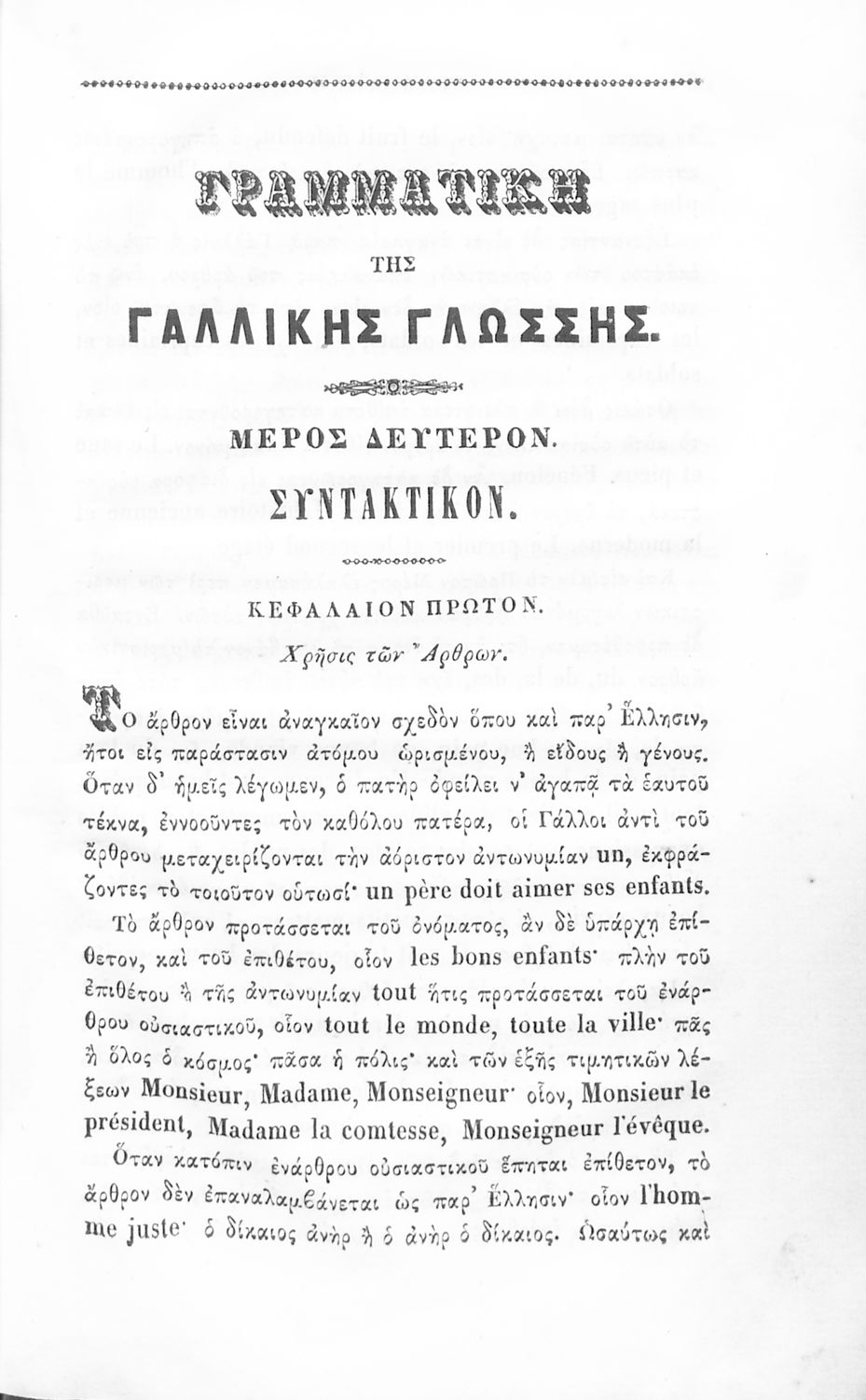 Κωδικός αναγνώρισης: 02-03092 Τίτλος: Γραμματική της γαλλικής γλώσσης, συνταχθείσα προς χρήσιν των Γυμνασίων και σχολείων της Ελλάδος Συγγραφέας: Ιωάννης Δ. Καρασούτσας Μέγεθος και υπόστρωμα: Σχολικό εγχειρίδιο, μαλακό εξώφυλλο, 174 σελίδες. |