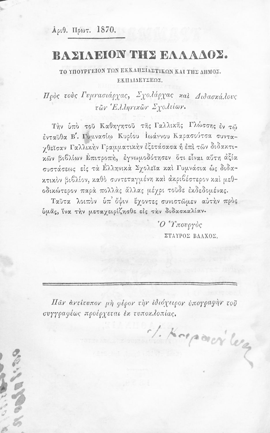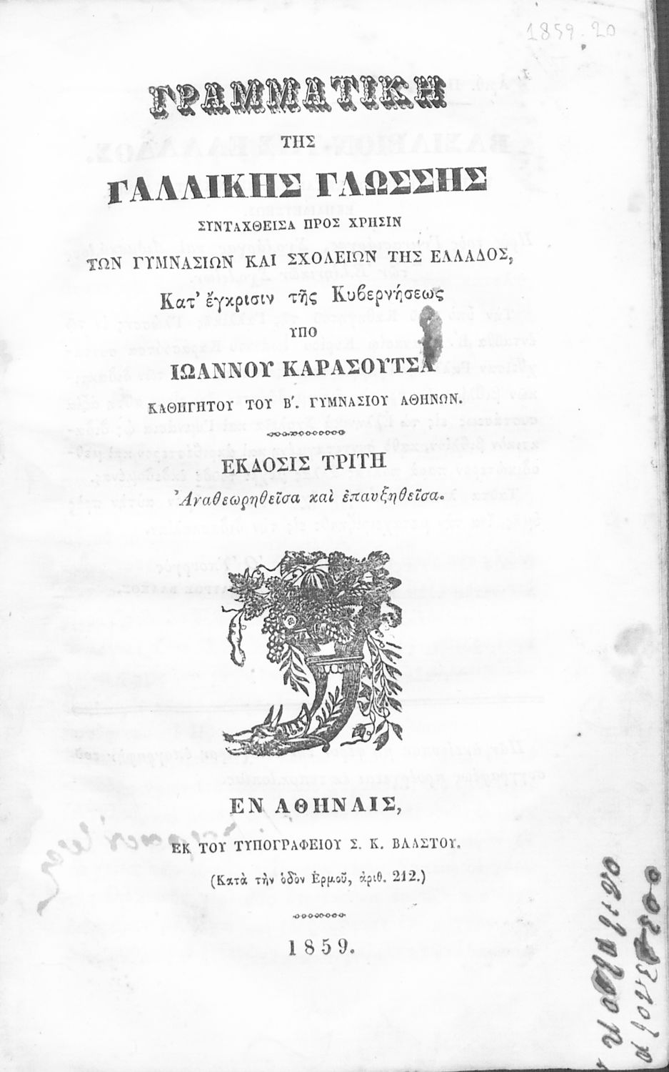 Τίτλος: Γραμματική της γαλλικής γλώσσης, συνταχθείσα προς χρήσιν των Γυμνασίων και σχολείων της Ελλάδος