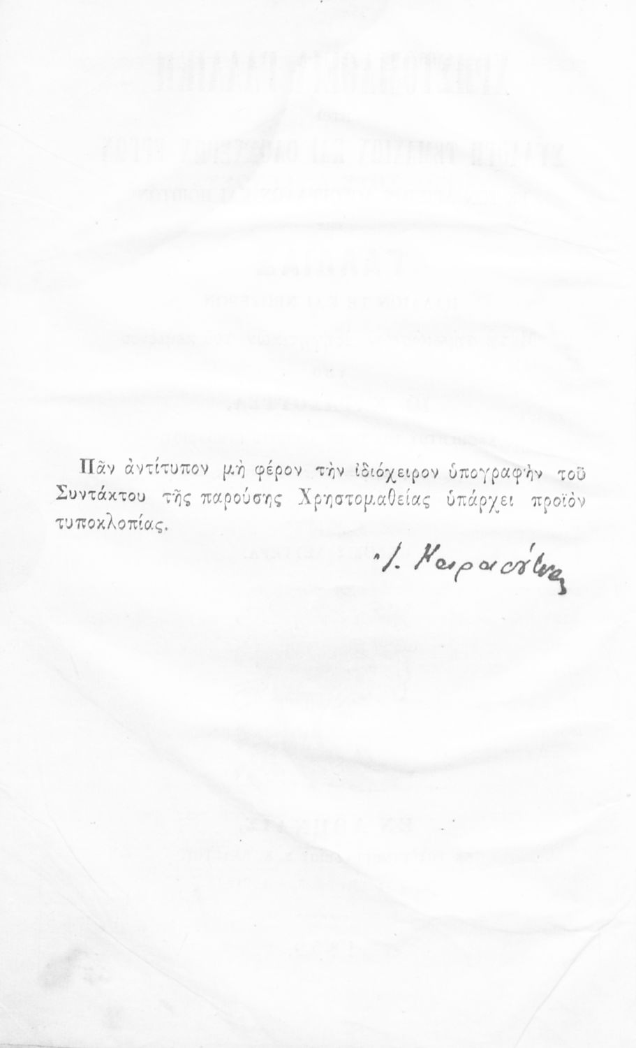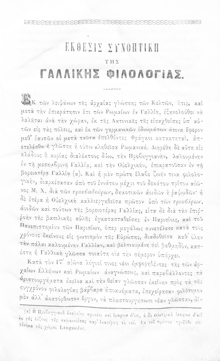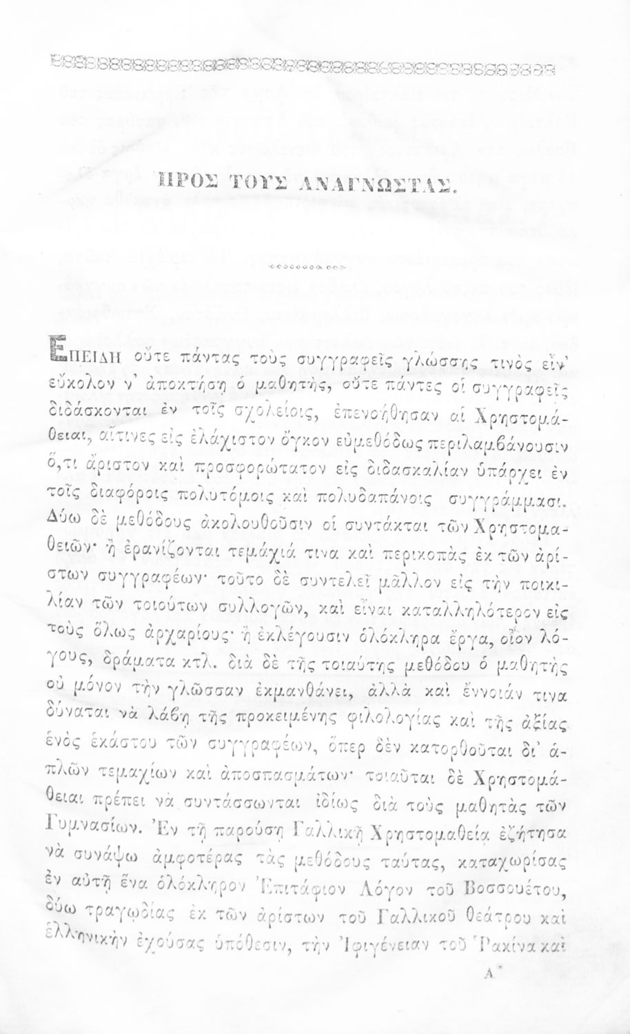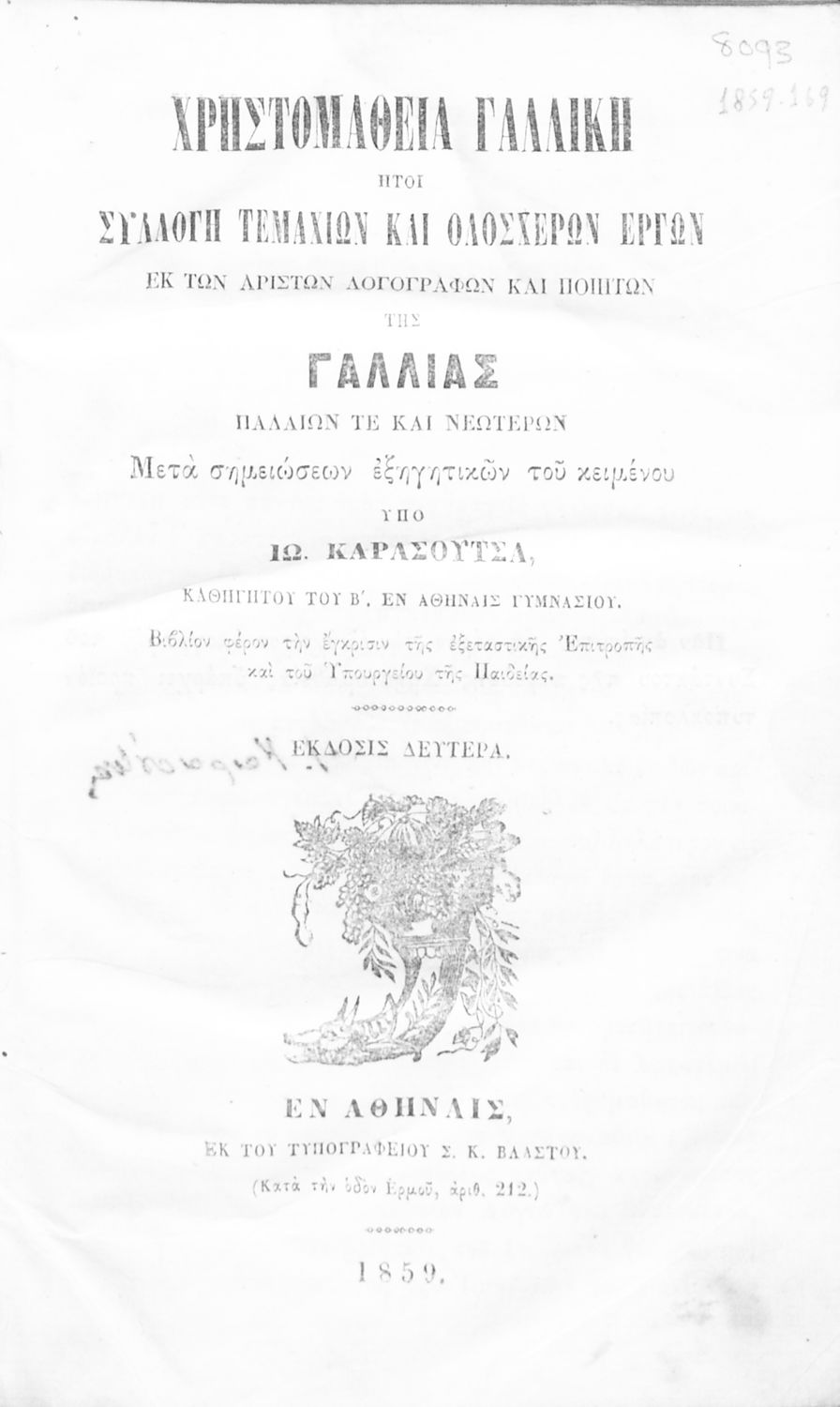 Τίτλος: Χρηστομάθεια γαλλική ήτοι συλλογή τεμαχίων και ολοσχερών έργων εκ των αρίστων λογογράφων και ποιητών της Γαλλίας παλαιών τε και νεωτέρων, μετά σημειώσεων εξηγητικών του κειμένου
