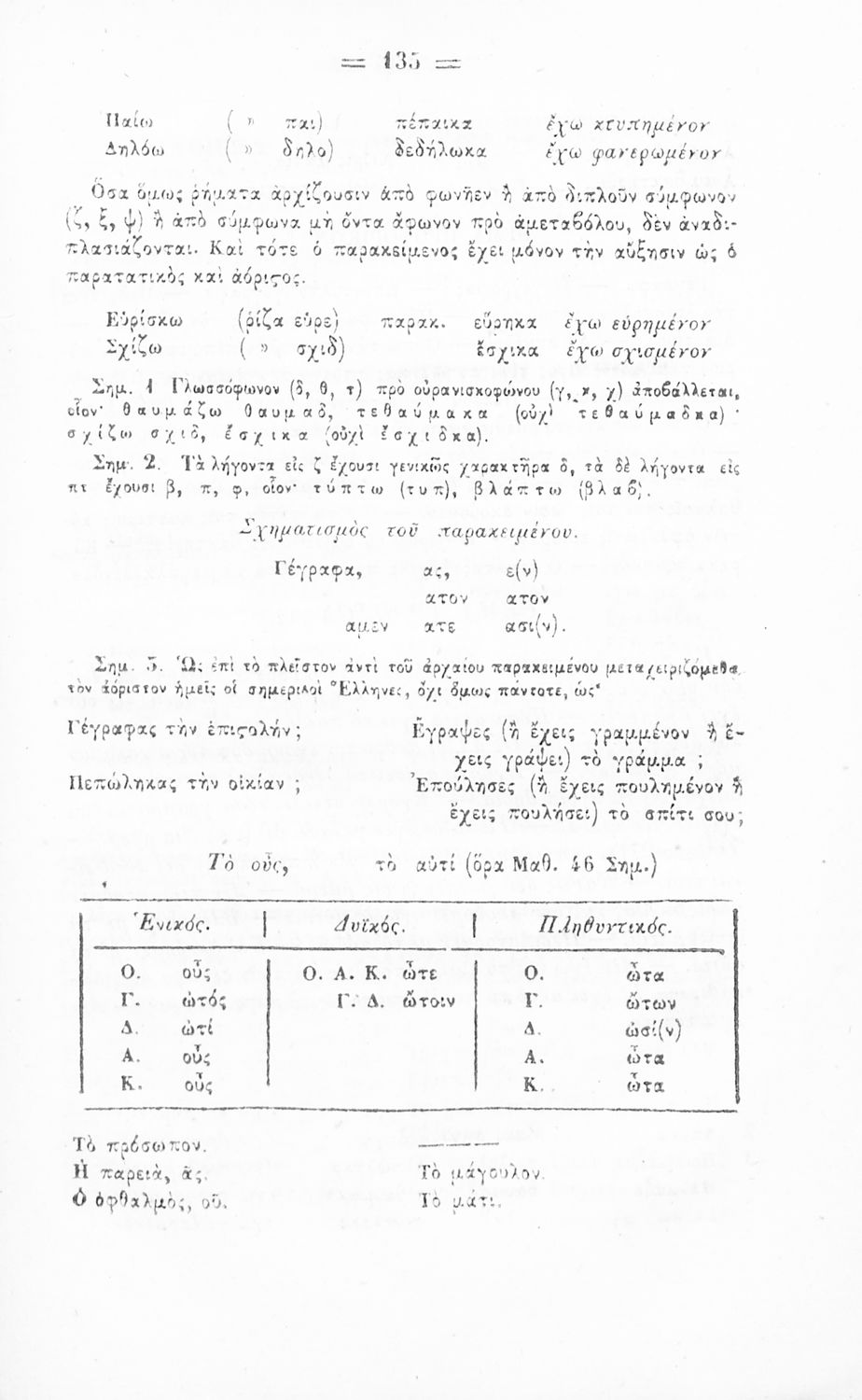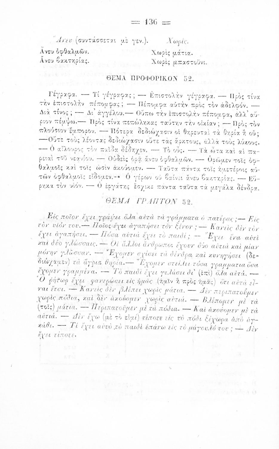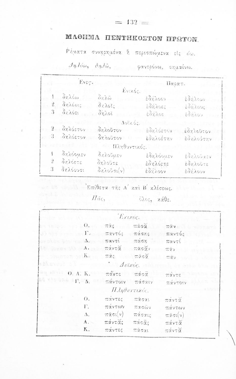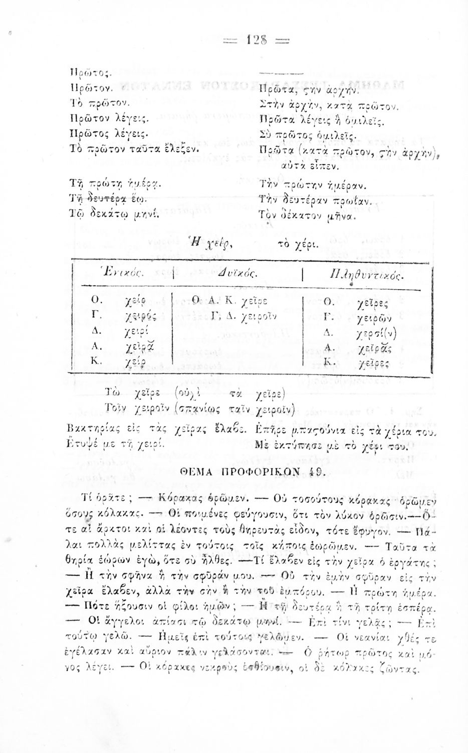 Σχολικό εγχειρίδιο Αρχαίων Ελληνικών για τα Ελληνικά Σχολεία και Παρθεναγωγεία που περιέχει τους κανόνες γραμματικής και είναι χωρισμένο σε φθογγολογικό, τυπολογικό και ετυμολογικό μέρος.