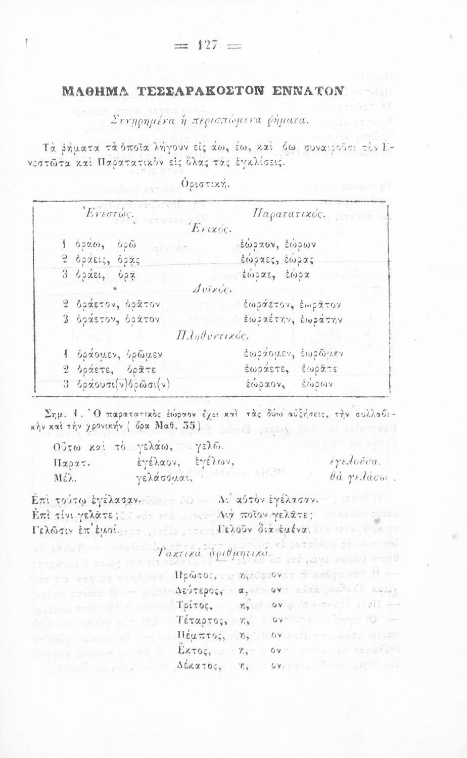 Μαθητικό βοήθημα Αρχαίων Ελληνικών Γυμνασίου, Ελληνικού Σχολείου και Παρθεναγωγείου που περιέχει τα ανώμαλα ρήματα της αττικής διαλέκτου και γραμματικές σημειώσεις.