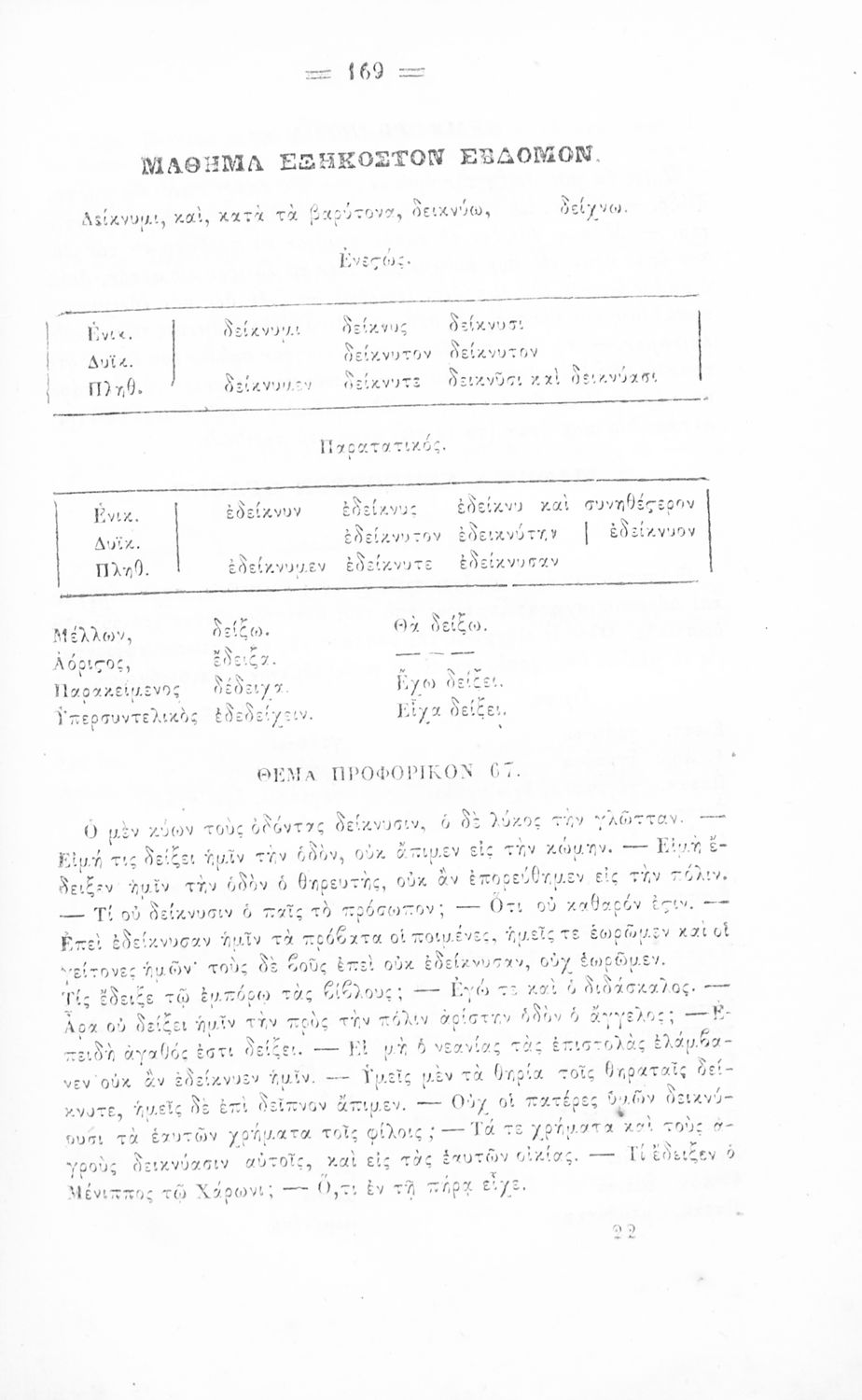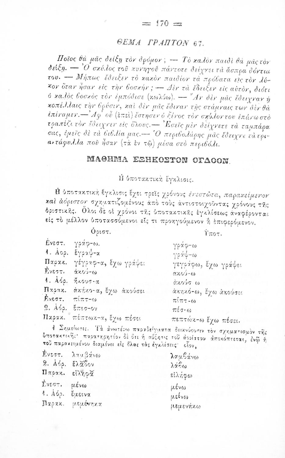 Βαθμίδα εκπαίδευσης: Δευτεροβάθμια Τάξη: Ελληνικό Σχολείο Μάθημα: Αρχαία Ελληνικά Γλώσσα: Καθαρεύουσα Παρουσίαση περιεχομένου: Σχολικό εγχειρίδιο Αρχαίων Ελληνικών για τα Ελληνικά Σχολεία και Παρθεναγωγεία που εστιάζει στα μέρη του λόγου και στην σύνταξή τους. |