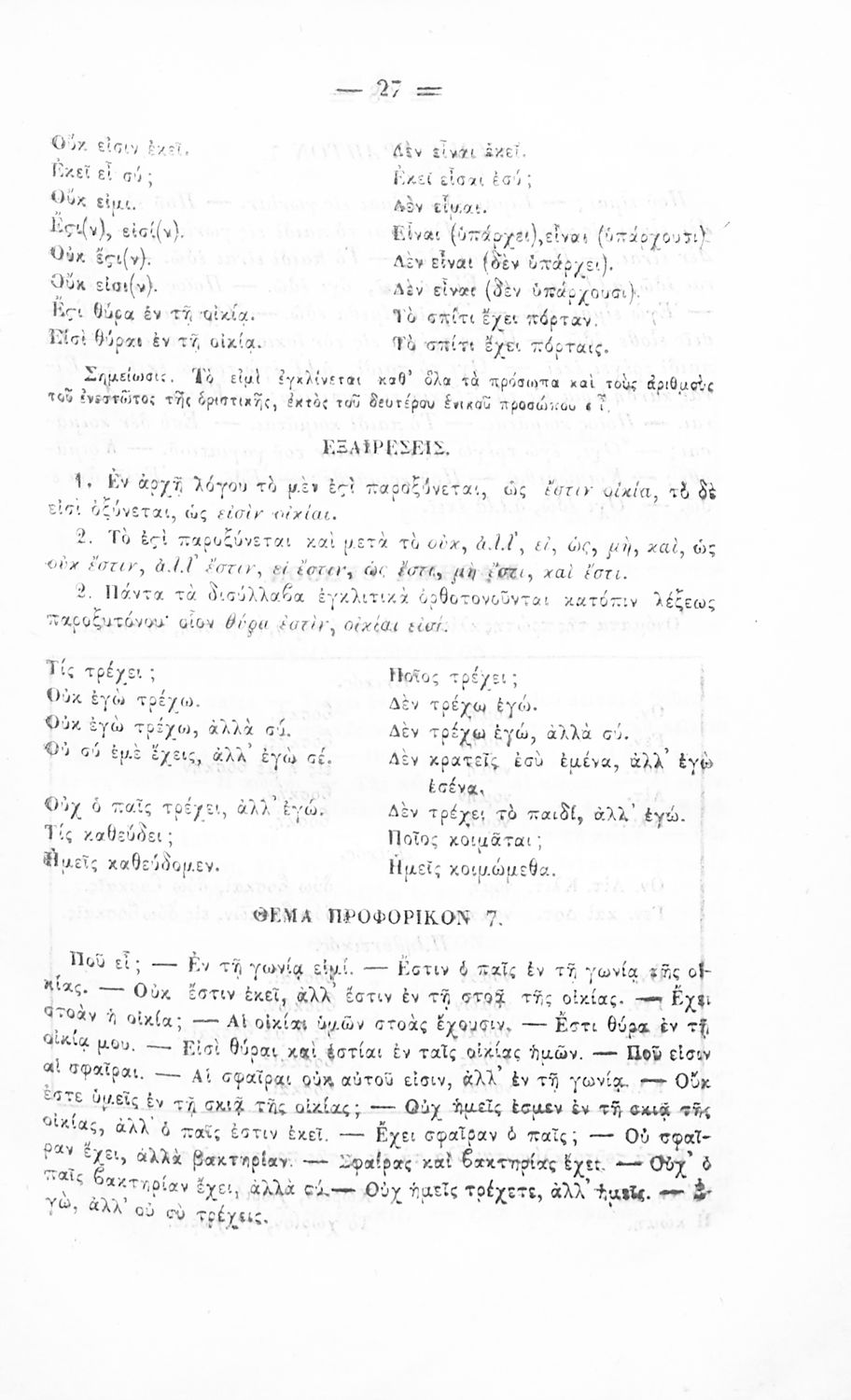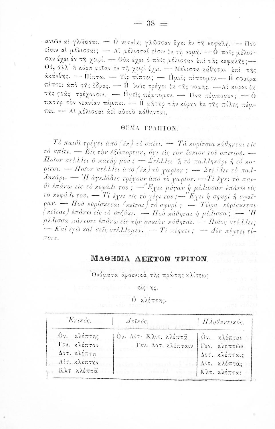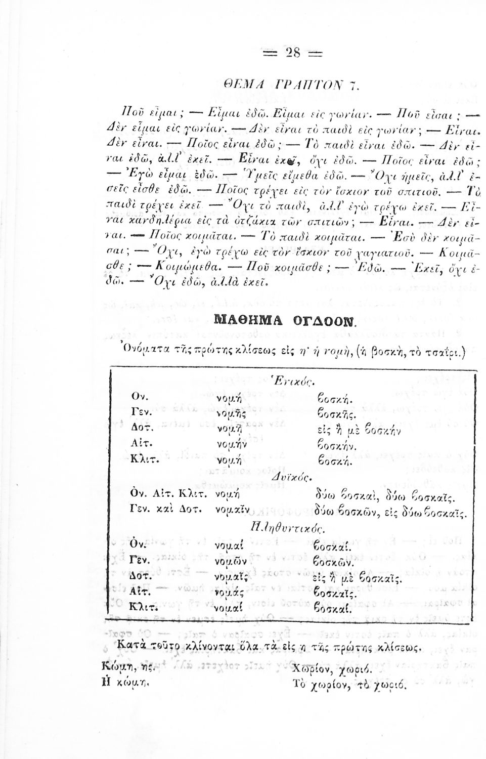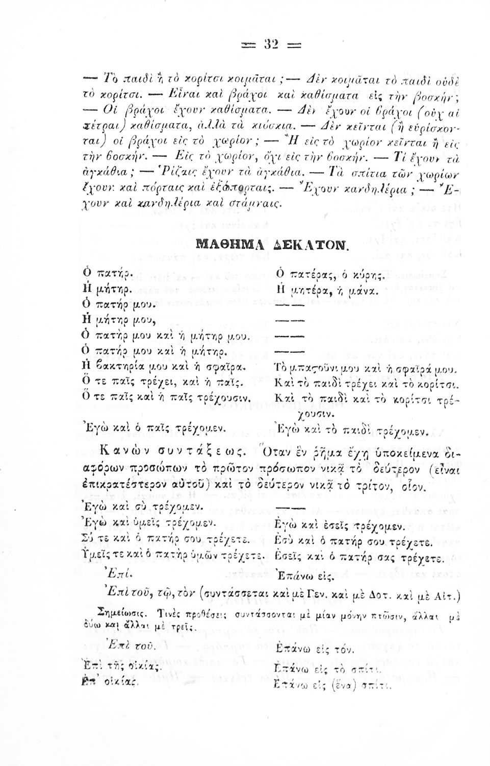 Σχολικό εγχειρίδιο Αρχαίων Ελληνικών για τα Ελληνικά Σχολεία και Παρθεναγωγεία που εστιάζει στα μέρη του λόγου και στην σύνταξή τους.