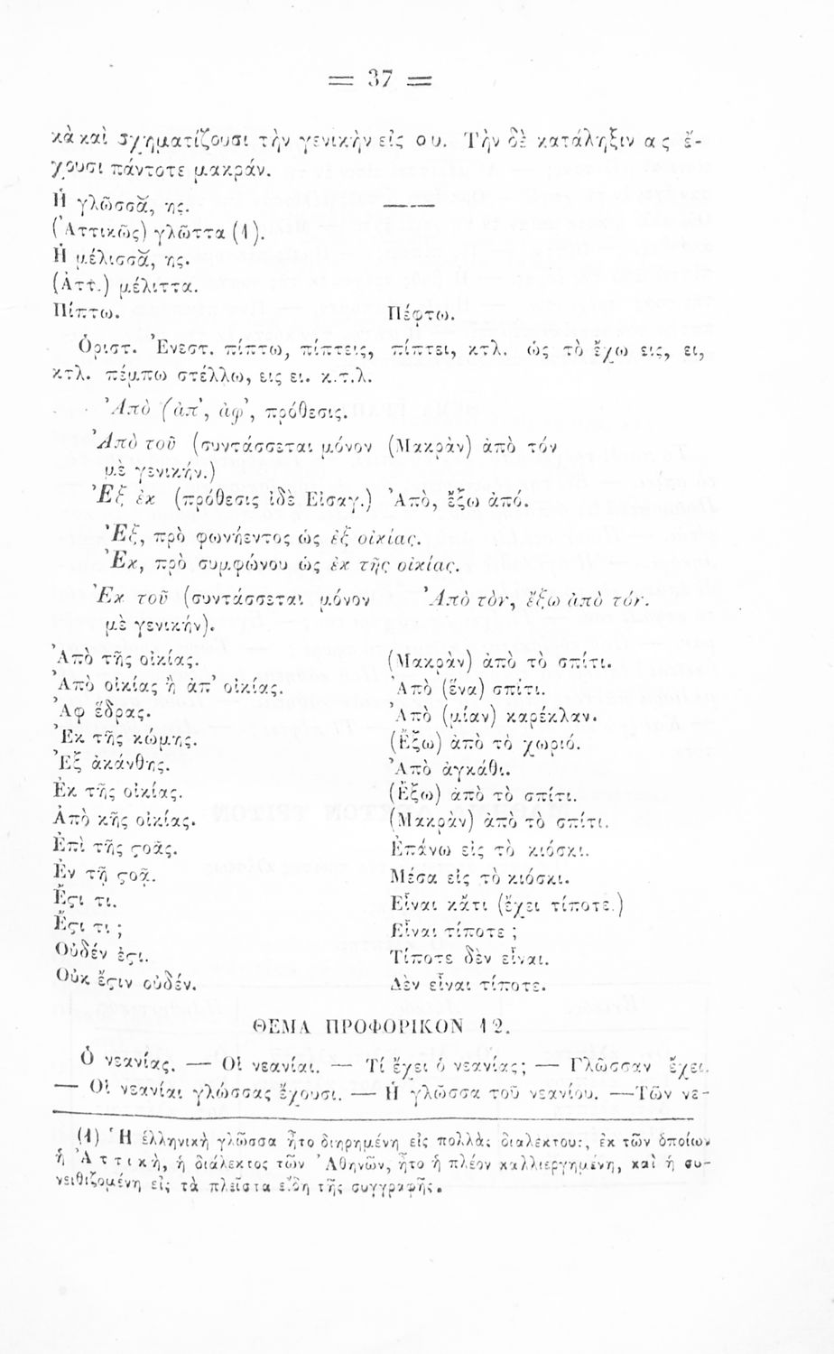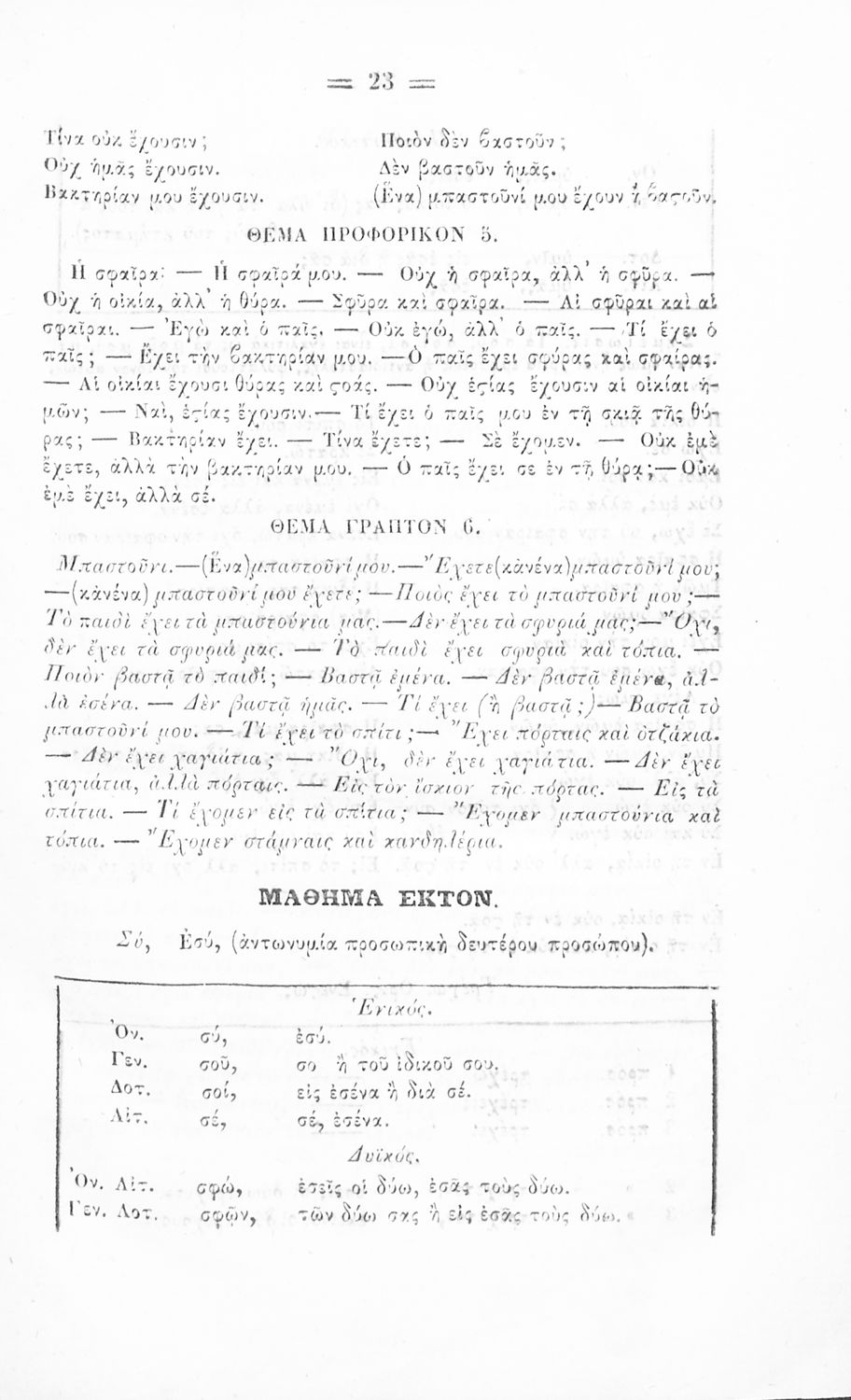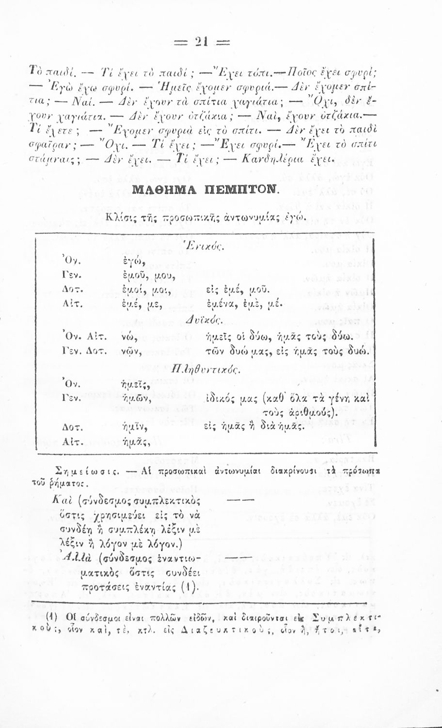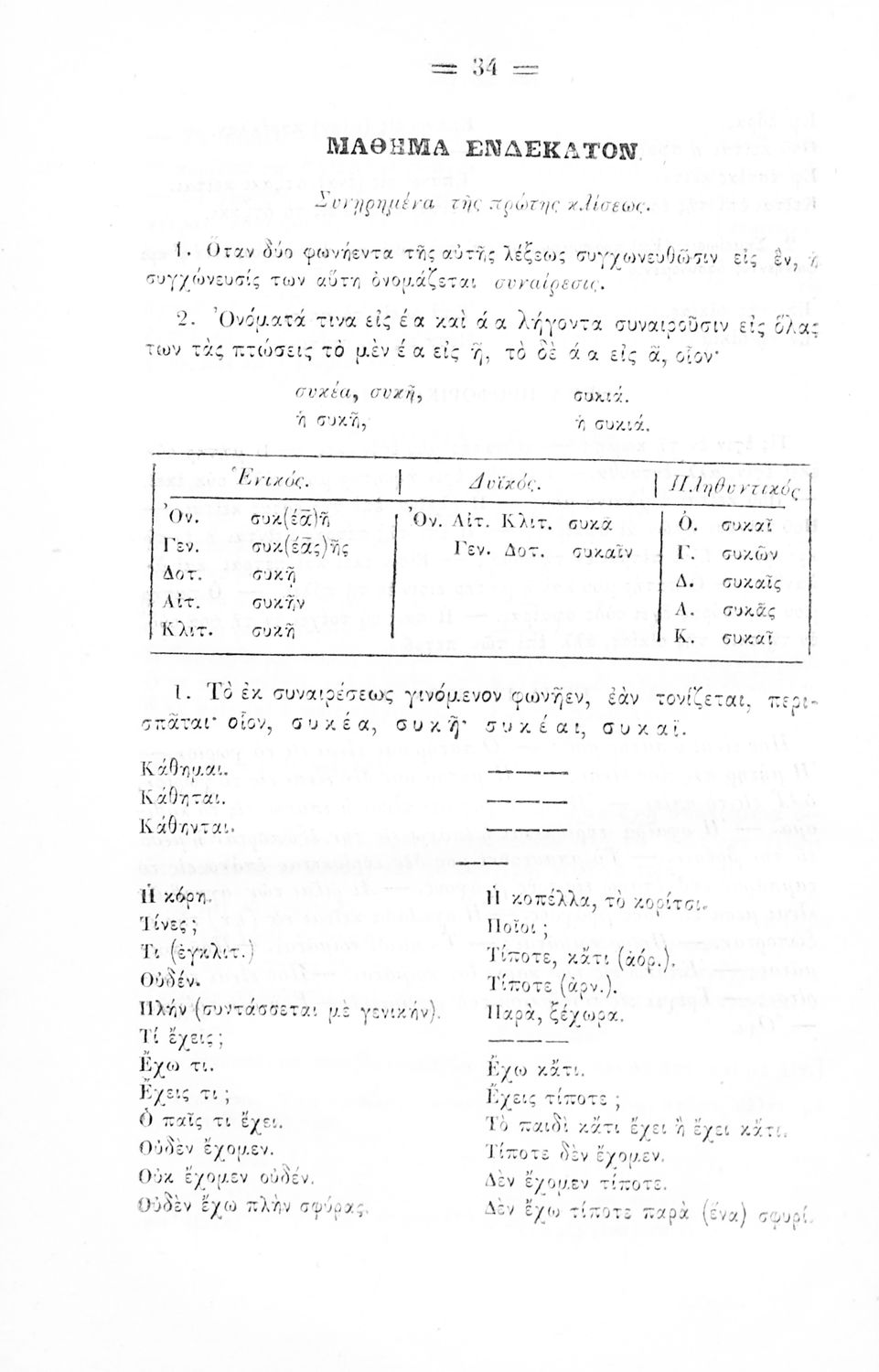 Σχολικό εγχειρίδιο Αρχαίων Ελληνικών για τα Ελληνικά Σχολεία και Παρθεναγωγεία που εστιάζει στα μέρη του λόγου και στην σύνταξή τους.