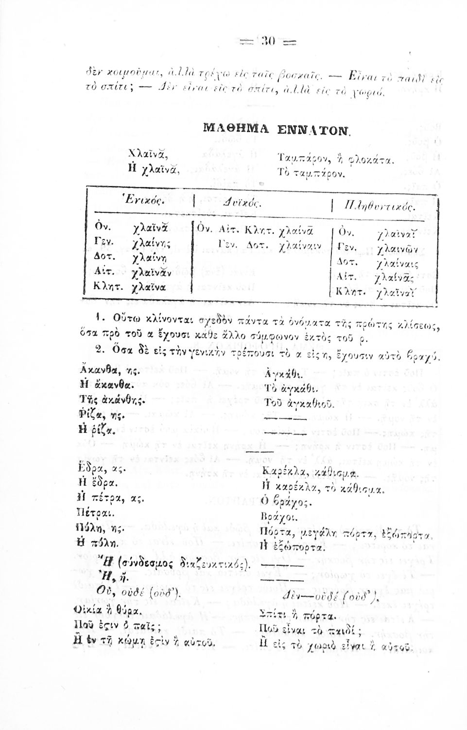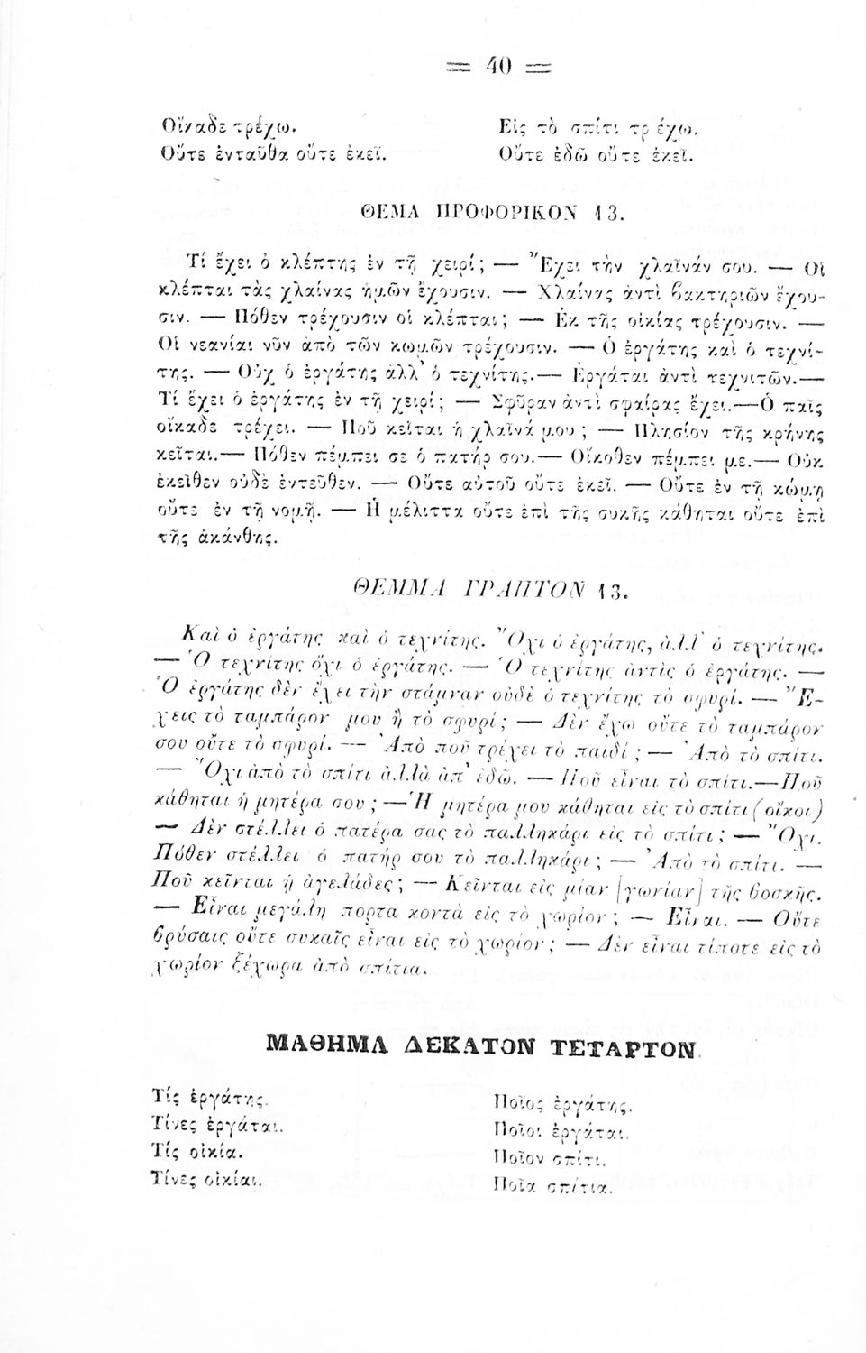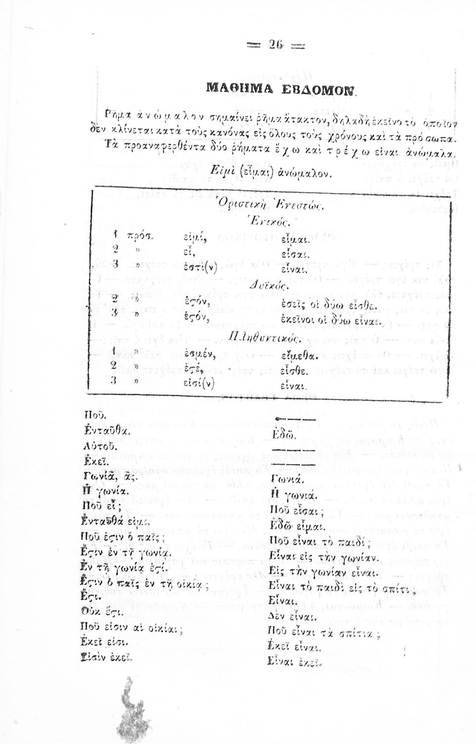 Βαθμίδα εκπαίδευσης: Δευτεροβάθμια Τάξη: Ελληνικό Σχολείο Μάθημα: Αρχαία Ελληνικά Γλώσσα: Καθαρεύουσα Παρουσίαση περιεχομένου: Σχολικό εγχειρίδιο Αρχαίων Ελληνικών για τα Ελληνικά Σχολεία και Παρθεναγωγεία που εστιάζει στα μέρη του λόγου και στην σύνταξή τους. |
