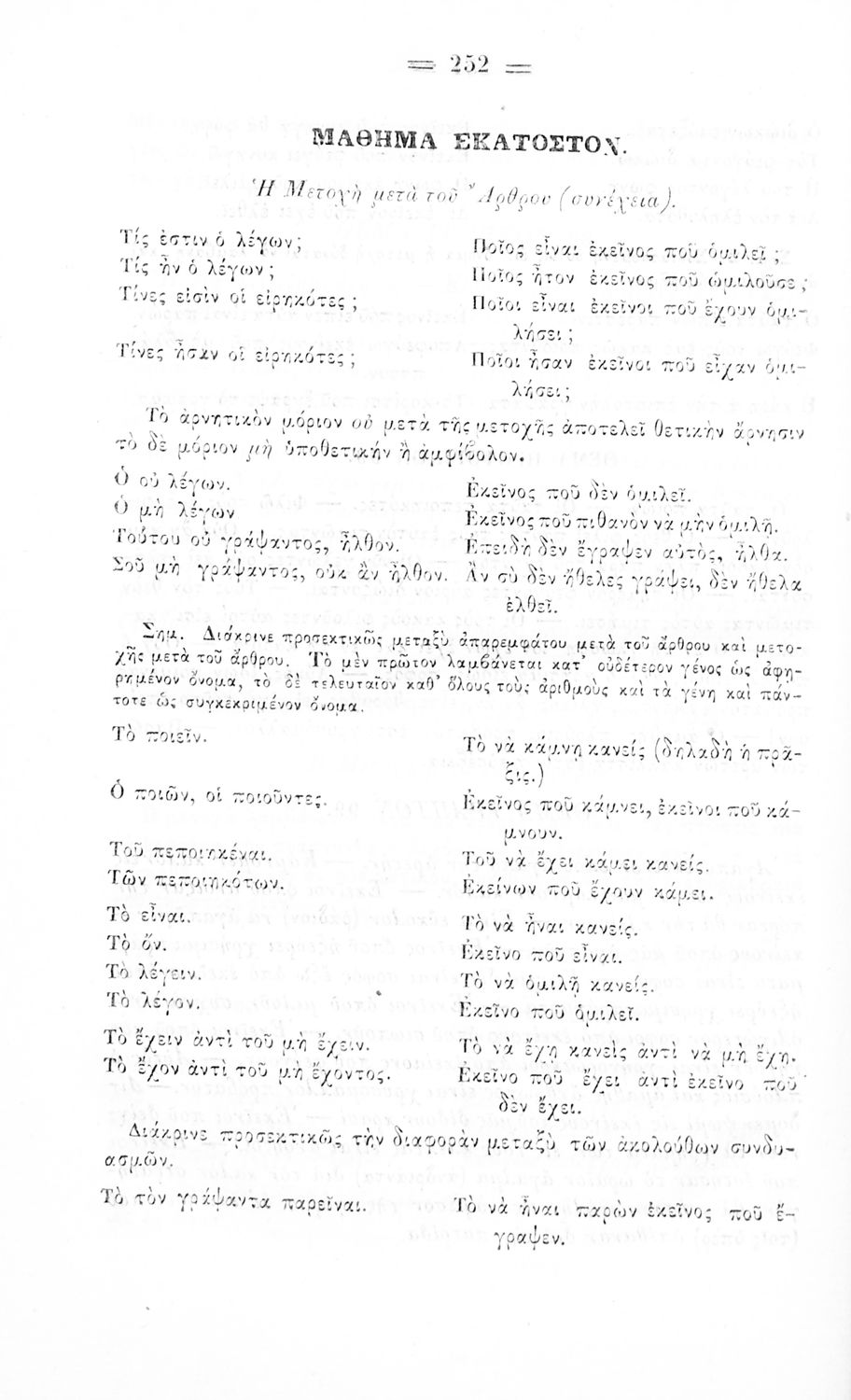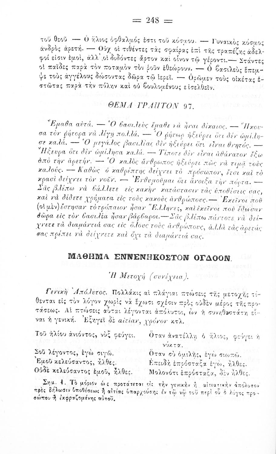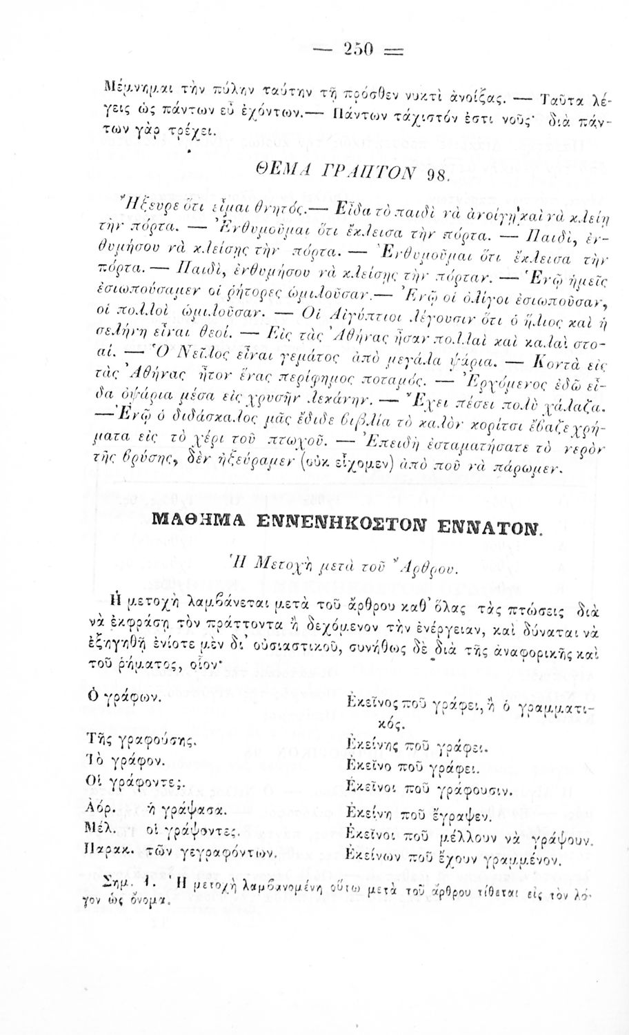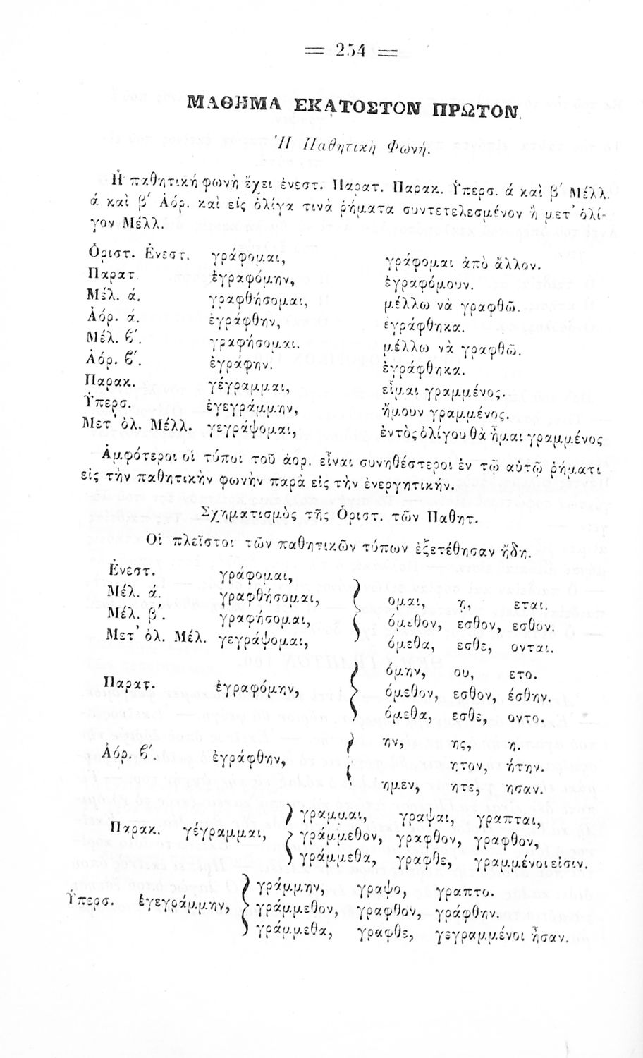 Σχολικό εγχειρίδιο Αρχαίων Ελληνικών για τα Ελληνικά Σχολεία και Παρθεναγωγεία που περιέχει τους κανόνες γραμματικής και είναι χωρισμένο σε φθογγολογικό, τυπολογικό και ετυμολογικό μέρος.