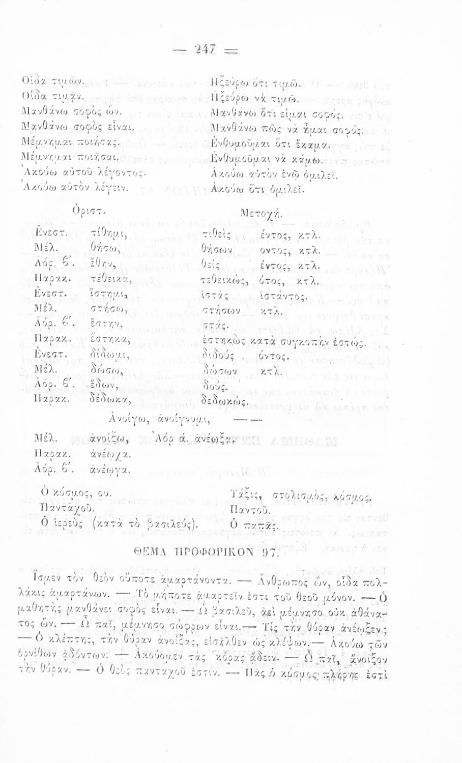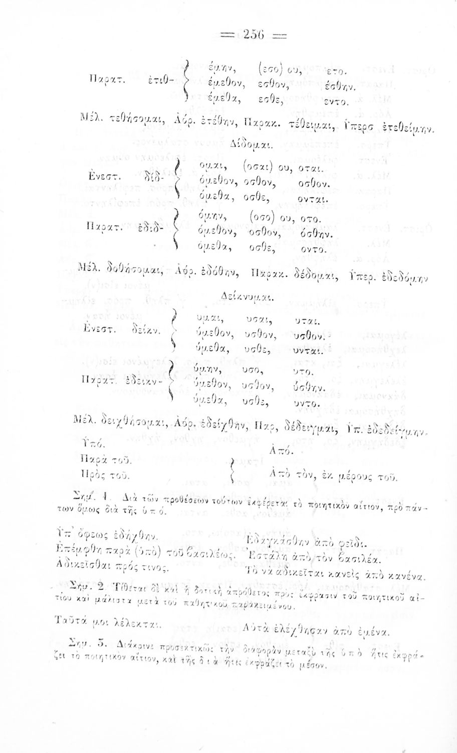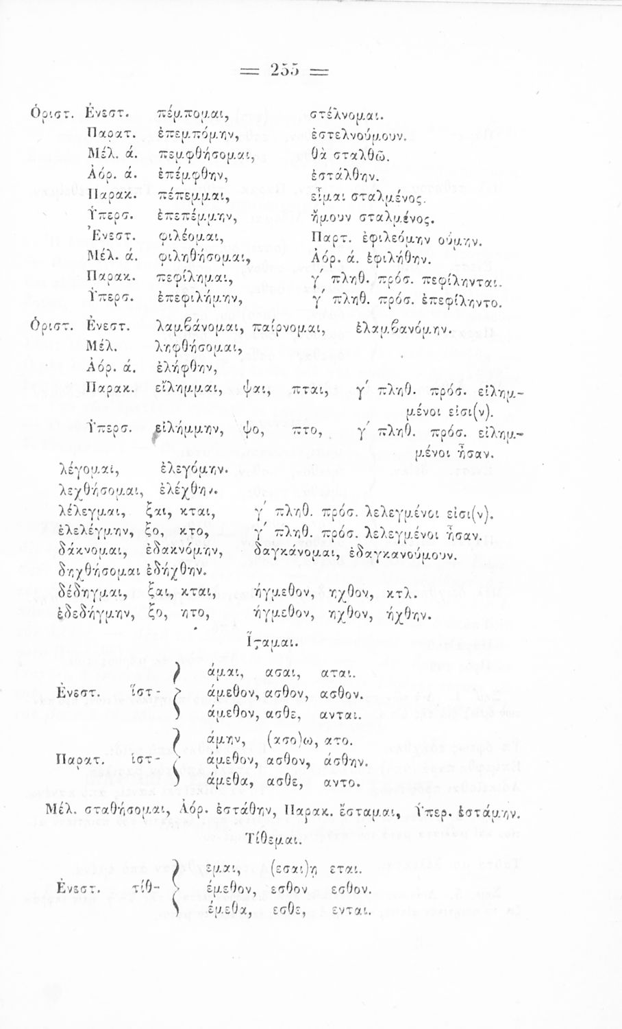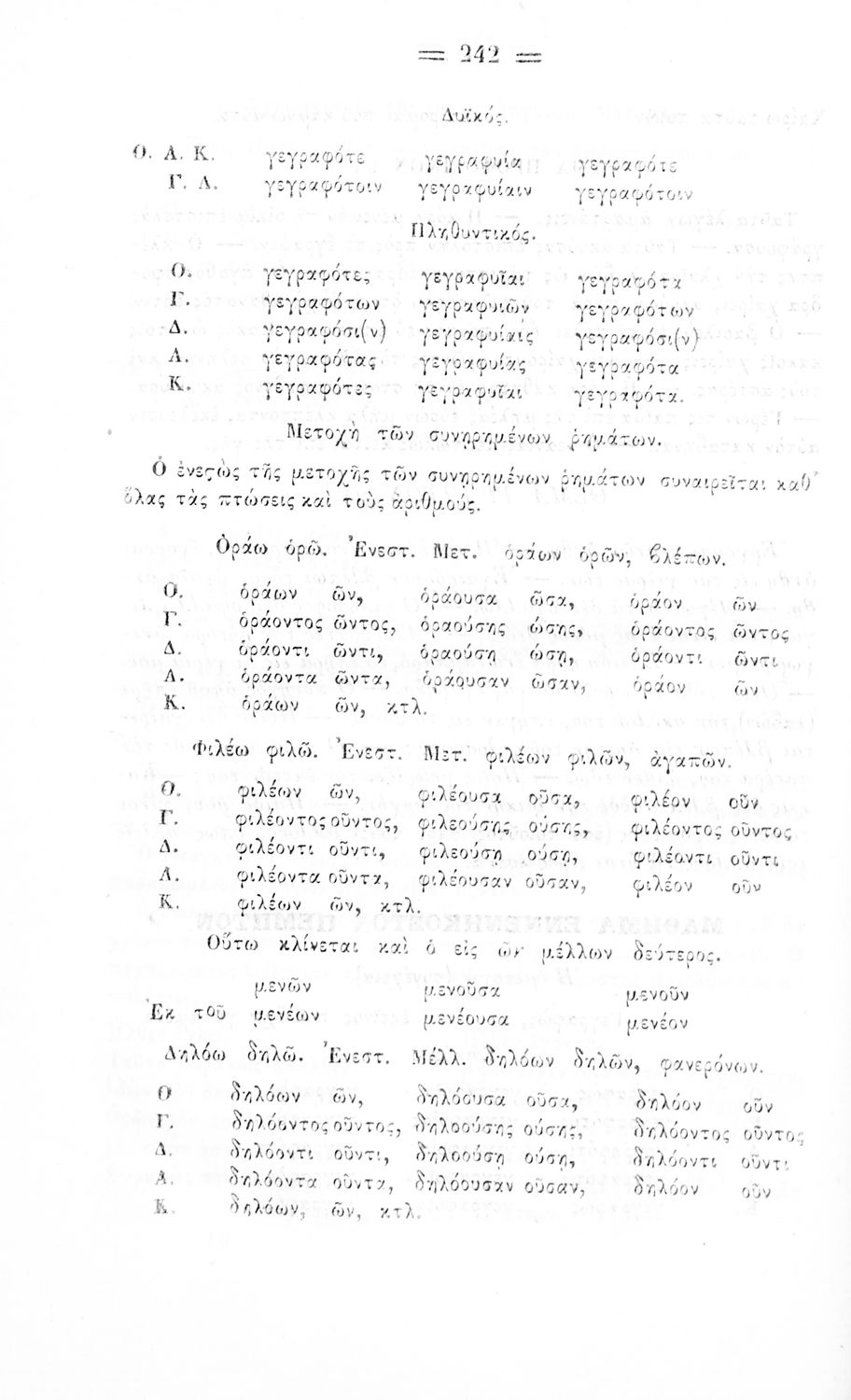 Μαθητικό βοήθημα Αρχαίων Ελληνικών για τα Ελληνικά Σχολεία, Παρθεναγωγεία και Γυμνάσια που περιλαμβάνει γραμματική της αρχαίας ελληνικής και κατάλογο ανωμάλων ρημάτων.