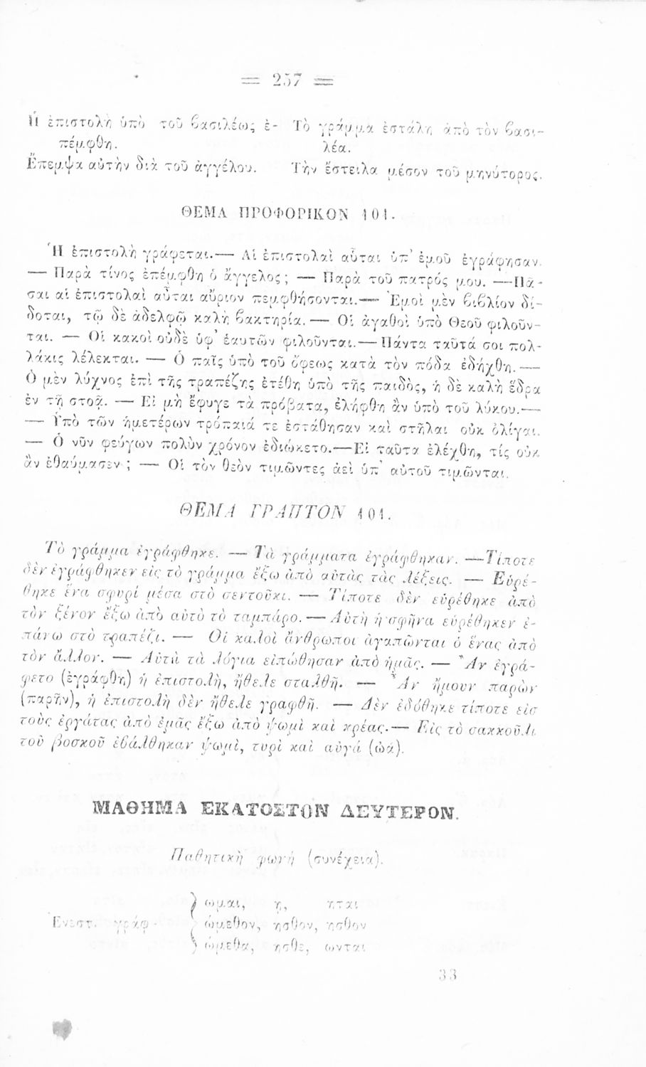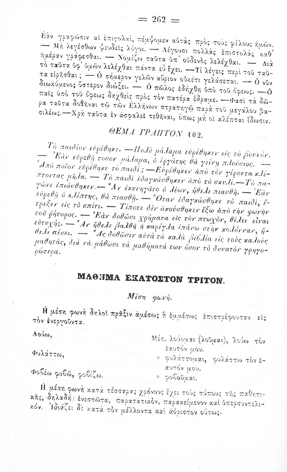 Σχολικό εγχειρίδιο Αρχαίων Ελληνικών για τα Ελληνικά Σχολεία, Παρθεναγωγεία και Γυμνάσια που περιέχει τους κανόνες γραμματικής και είναι χωρισμένο σε φθογγολογικό, τυπολογικό και ετυμολογικό μέρος.