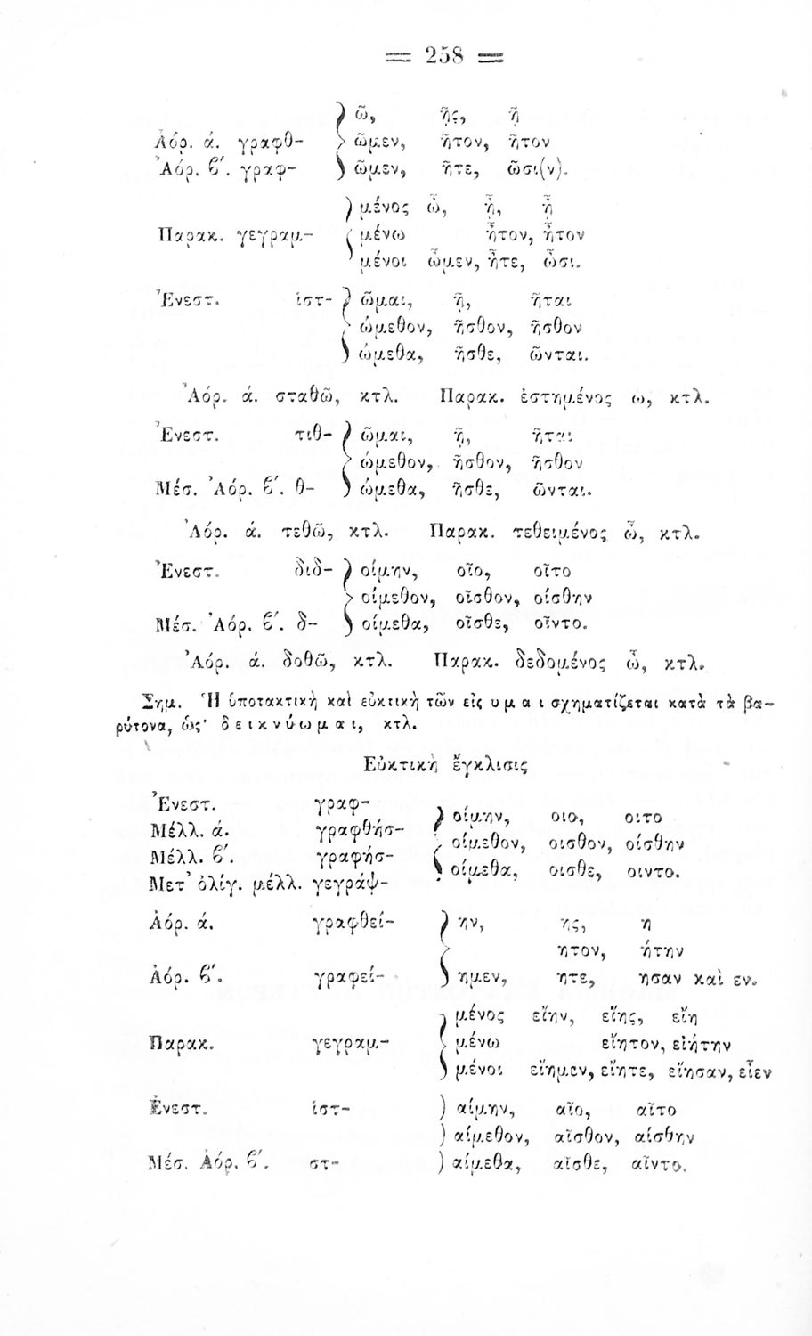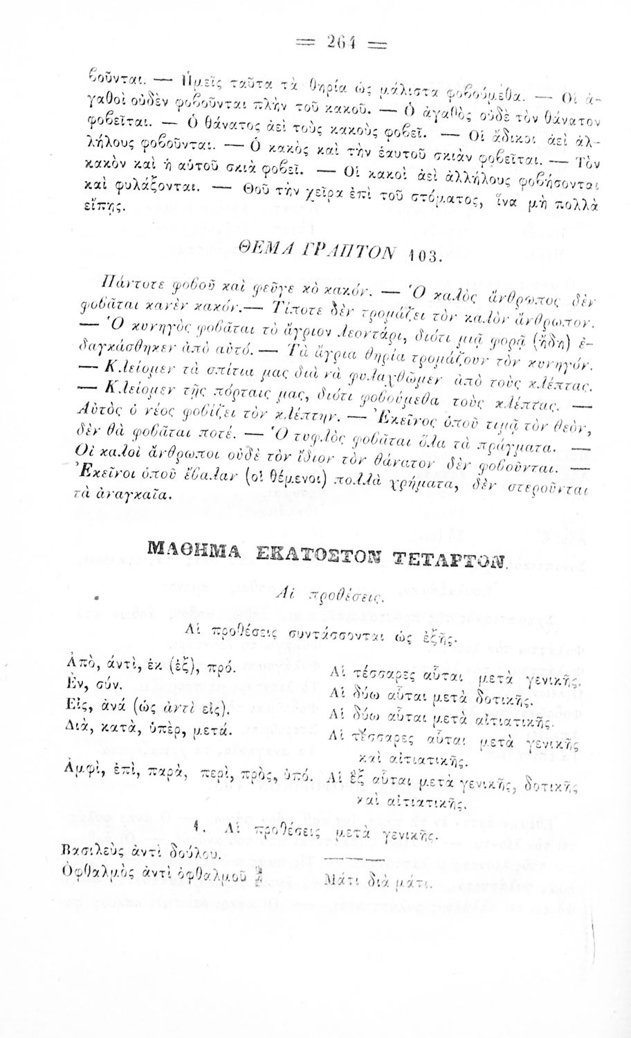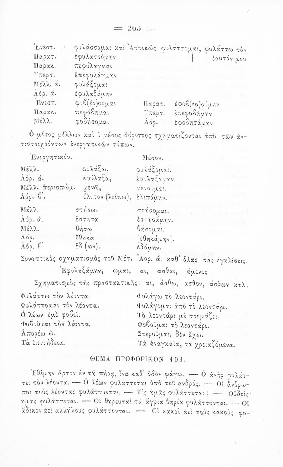 Σχολικό εγχειρίδιο Αρχαίων Ελληνικών για τα Ελληνικά Σχολεία και Παρθεναγωγεία που περιέχει τους κανόνες γραμματικής και είναι χωρισμένο σε φθογγολογικό, τυπολογικό και ετυμολογικό μέρος.