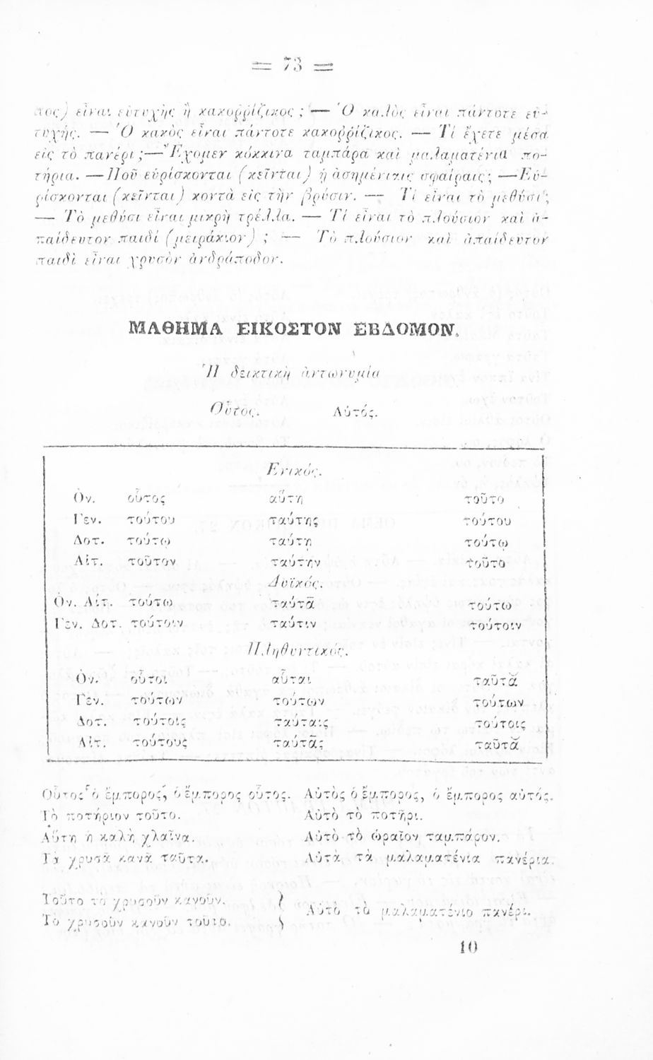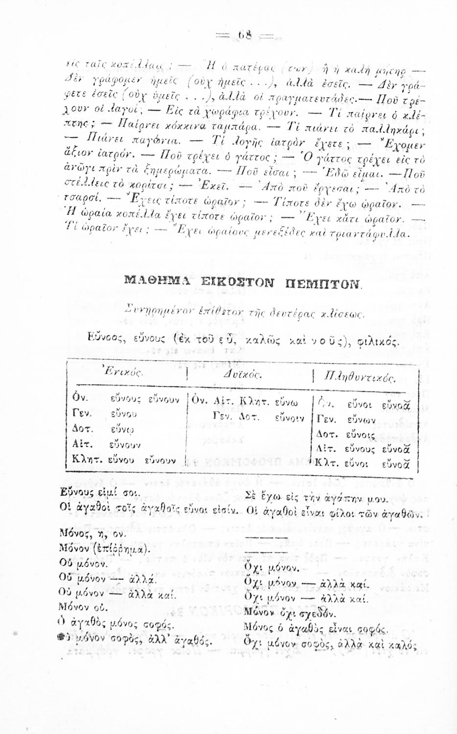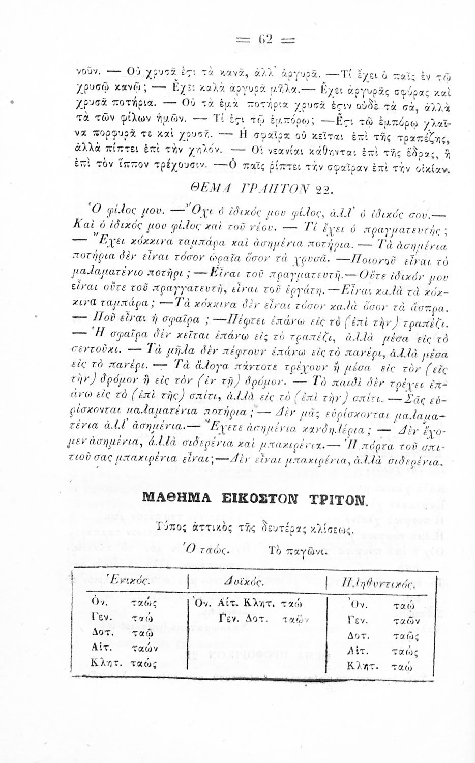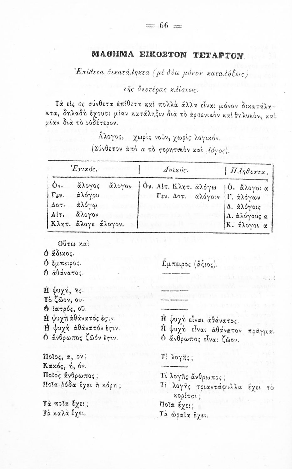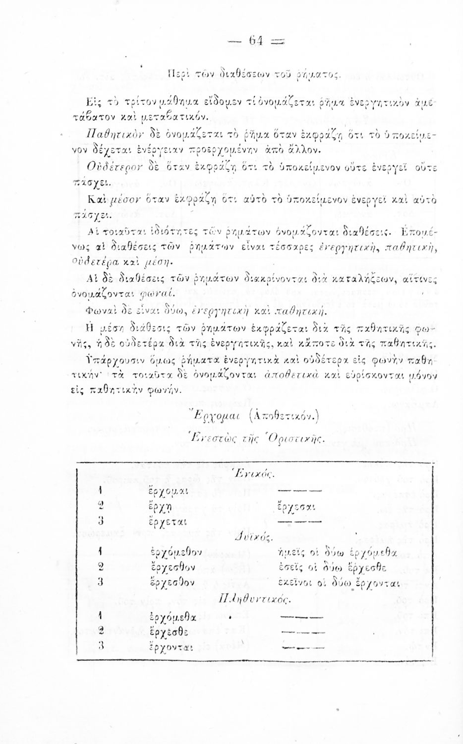 Σχολικό εγχειρίδιο Αρχαίων Ελληνικών για τα Ελληνικά Σχολεία και Παρθεναγωγεία που εστιάζει στα μέρη του λόγου και στην σύνταξή τους.