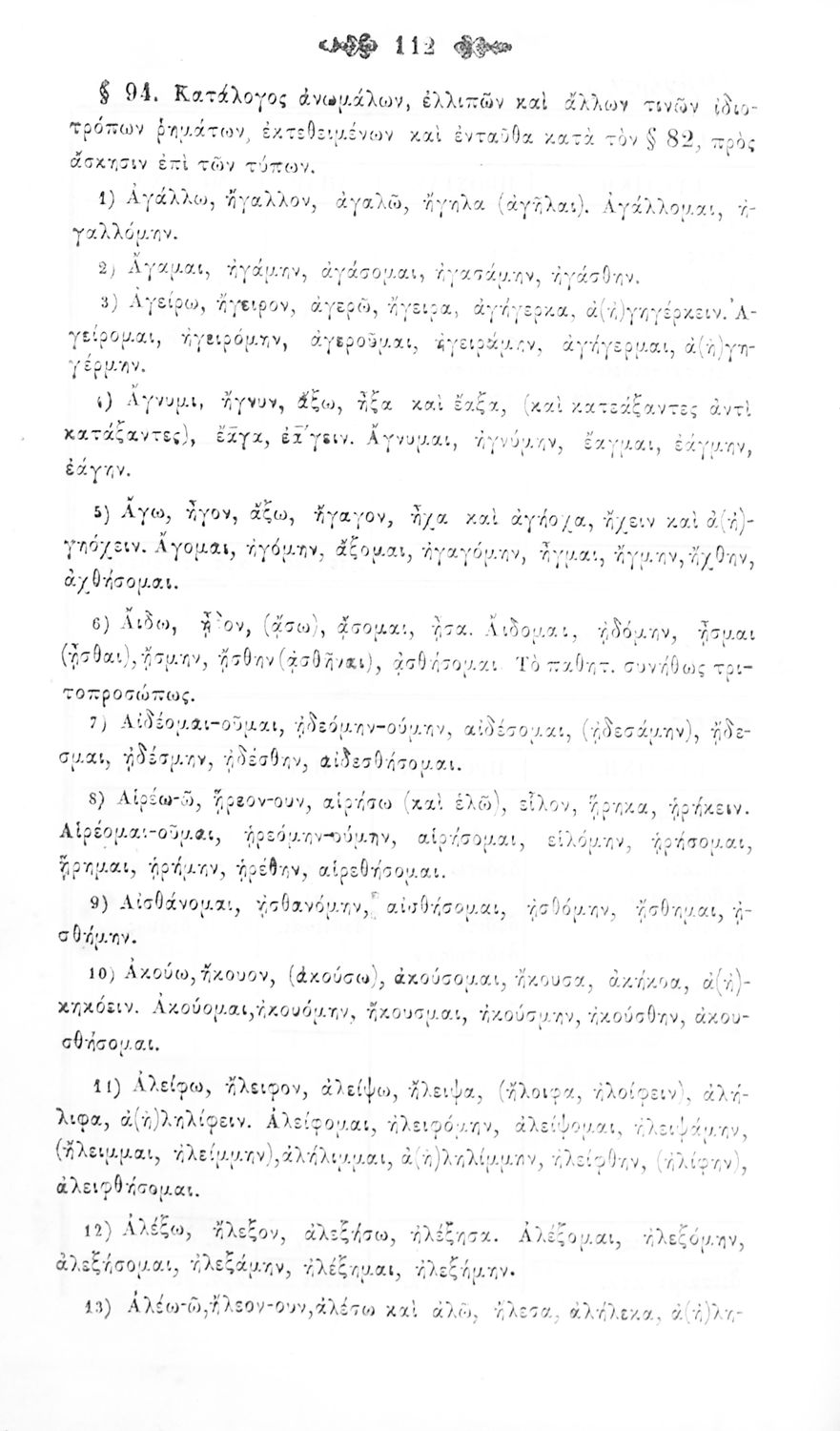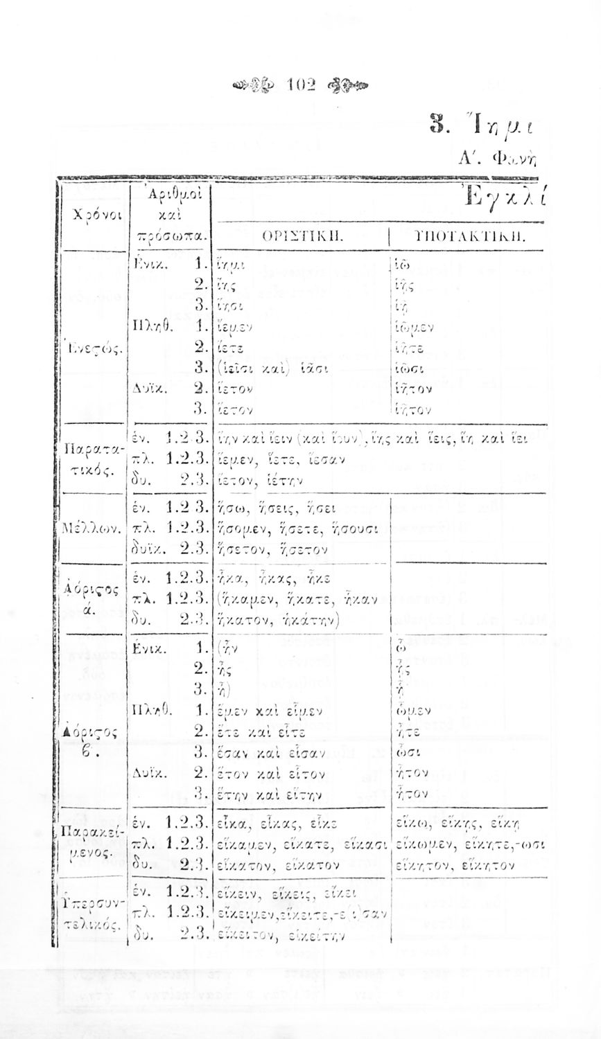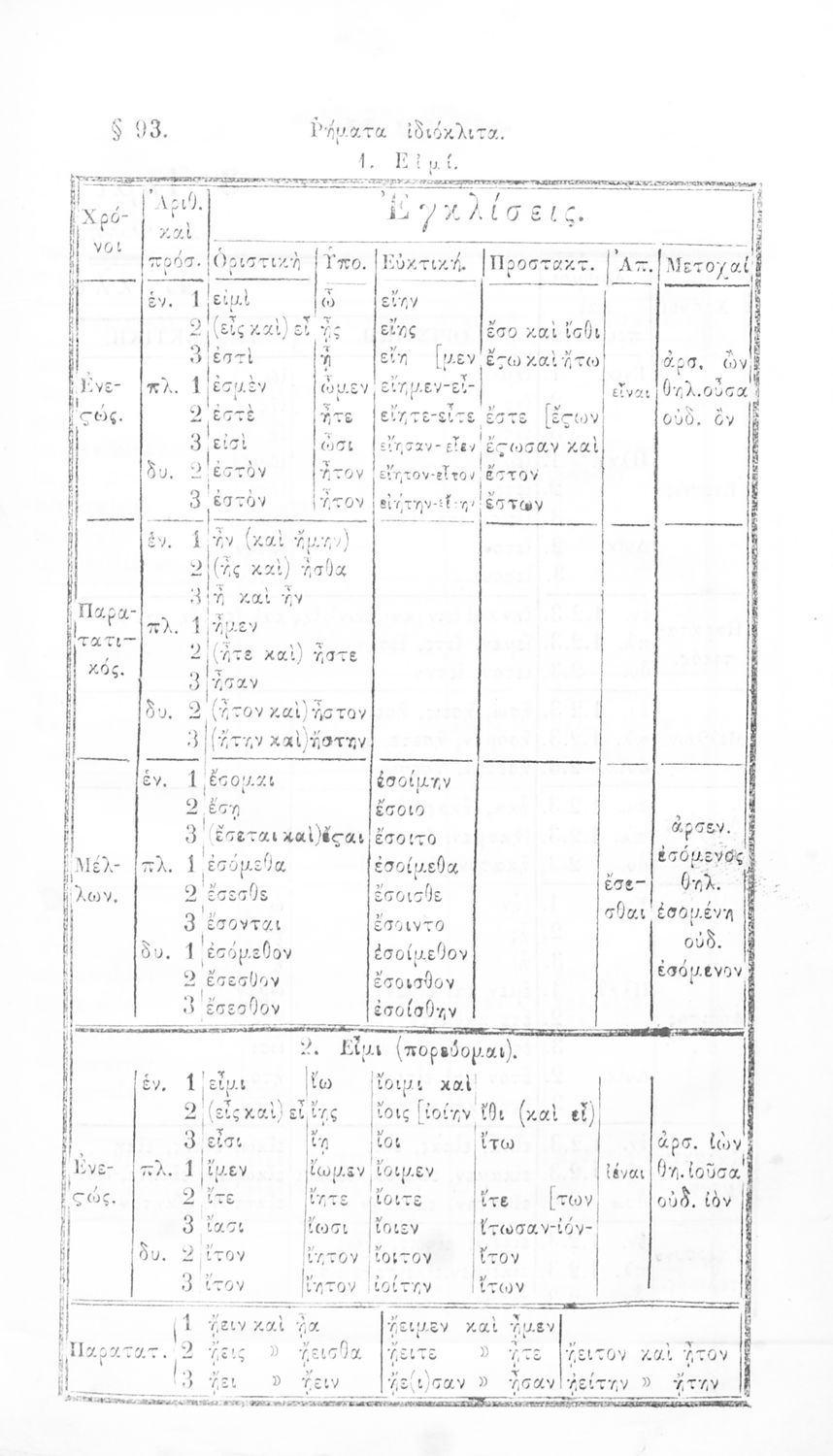 Μαθητικό βοήθημα Αρχαίων Ελληνικών για τα Ελληνικά Σχολεία, Παρθεναγωγεία και Γυμνάσια που περιλαμβάνει γραμματική της αρχαίας ελληνικής και κατάλογο ανωμάλων ρημάτων.