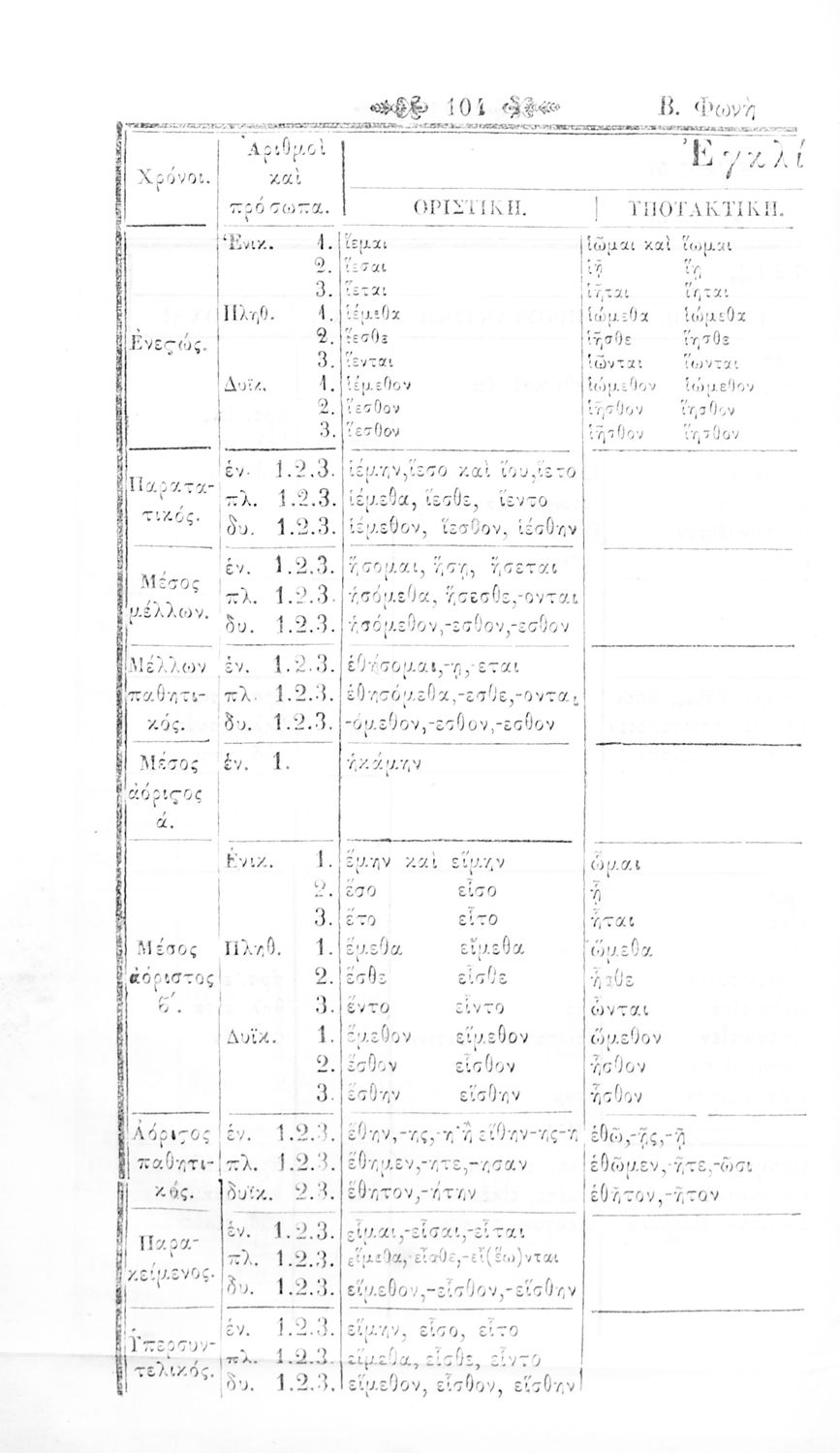 Σχολικό εγχειρίδιο Αρχαίων Ελληνικών για τα Ελληνικά Σχολεία, Παρθεναγωγεία και Γυμνάσια που περιέχει τους κανόνες γραμματικής και είναι χωρισμένο σε φθογγολογικό, τυπολογικό και ετυμολογικό μέρος.