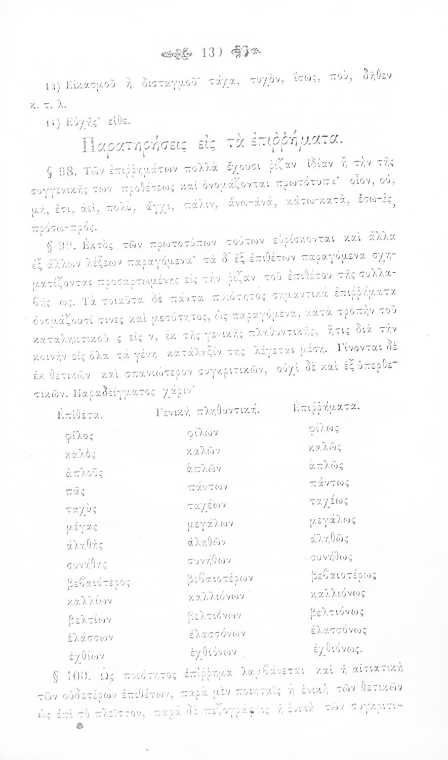 LDR 01074 2200193 4500 035 ## _a02-03110 040 ## _aΕλληνικό Λογοτεχνικό και Ιστορικό Αρχείο 041 ## _ael 100 ## _aΗλίας Σ. Σταθόπουλος 110 ## _a1858.15a 245 0# _aΓραμματική της αρχαίας ελληνικής γλώσσης 250 ## _a3η Έκδοση 260 ## _aΑθήνα _bΙω. Αγγελόπουλος _c1858 300 ## _a332 520 ## _aΣχολικό εγχειρίδιο Αρχαίων Ελληνικών που περιλαμβάνει τη γραμματική της αρχαίας ελληνικής και είναι χωρισμένο σε φθογγολογικό και τυπολογικό μέρος Περιέχει και κατάλογο ανωμάλων ρημάτων, ασκήσεις και σημειώσεις. 522 ## _aΕλλάδα 546 ## _aΚαθαρεύουσα 563 ## _aΣκληρό Εξώφυλλο 650 #4 _aΕπίθετα _aΕπιρρήματα _aΟυσιαστικά _aΡήματα
