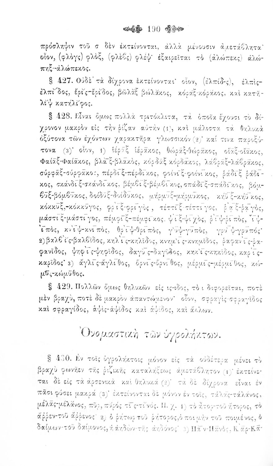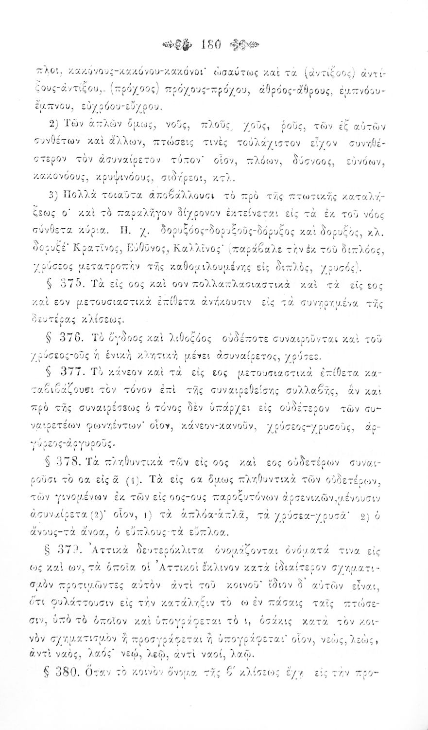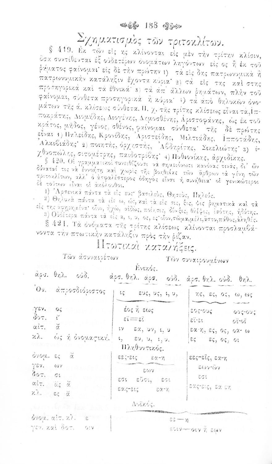 Σχολικό εγχειρίδιο Αρχαίων Ελληνικών για τα Ελληνικά Σχολεία, Παρθεναγωγεία και Γυμνάσια που περιέχει τους κανόνες γραμματικής και είναι χωρισμένο σε φθογγολογικό, τυπολογικό και ετυμολογικό μέρος.