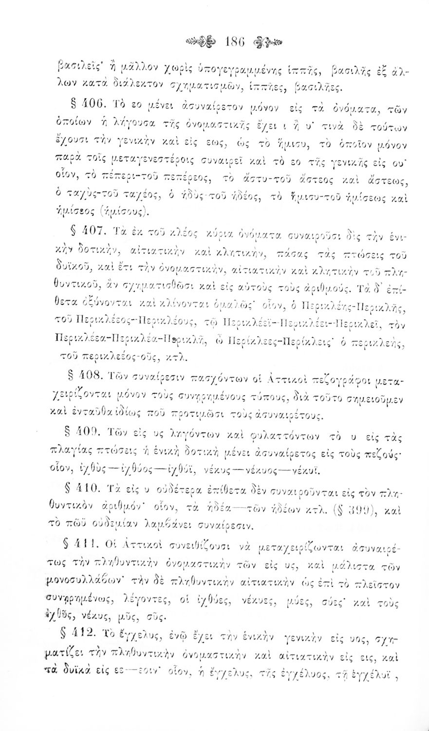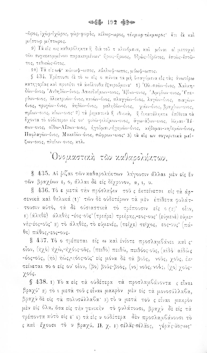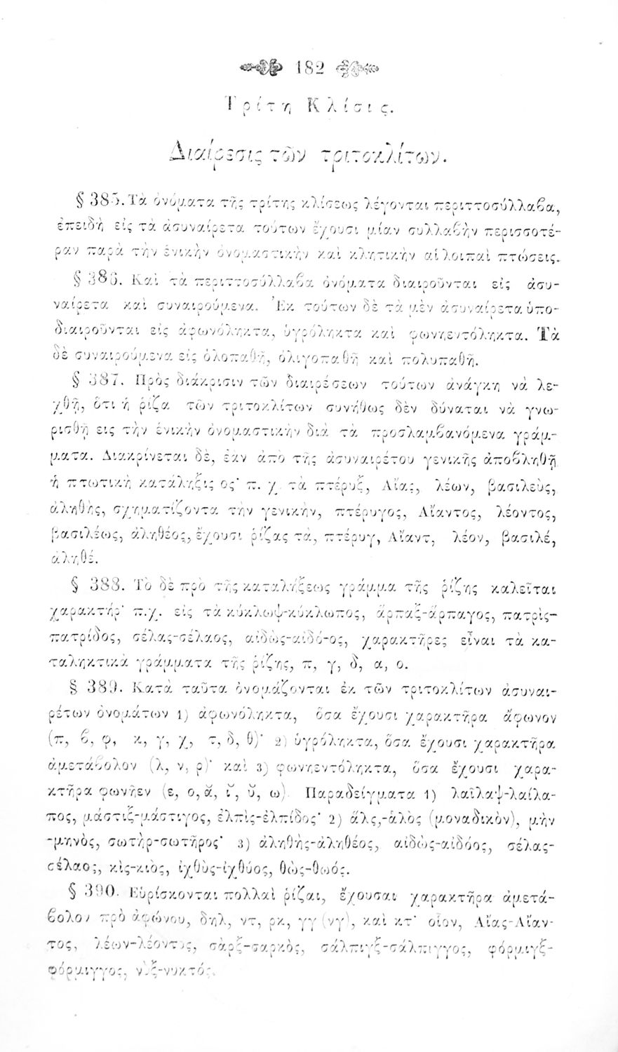 Σχολικό εγχειρίδιο Αρχαίων Ελληνικών για τα Ελληνικά Σχολεία και Παρθεναγωγεία που περιέχει τους κανόνες γραμματικής και είναι χωρισμένο σε φθογγολογικό, τυπολογικό και ετυμολογικό μέρος.