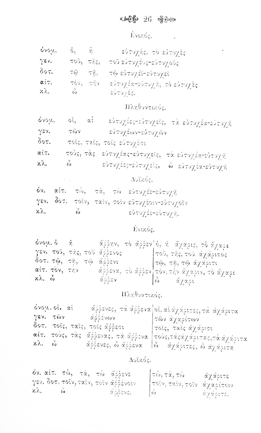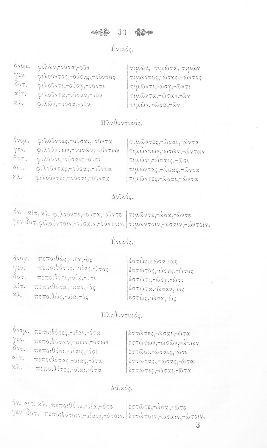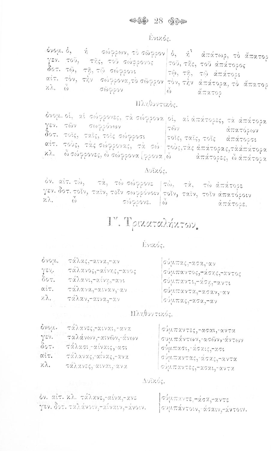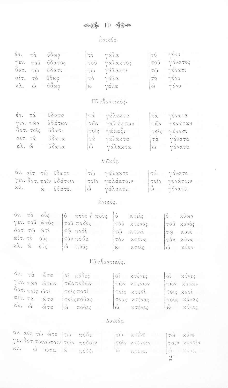 Σχολικό εγχειρίδιο Αρχαίων Ελληνικών για τα Ελληνικά Σχολεία και Παρθεναγωγεία που περιέχει τους κανόνες γραμματικής και είναι χωρισμένο σε φθογγολογικό, τυπολογικό και ετυμολογικό μέρος.