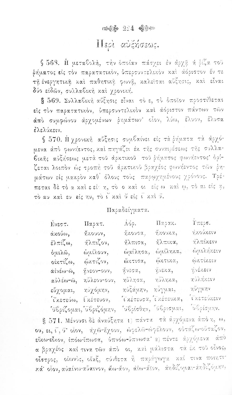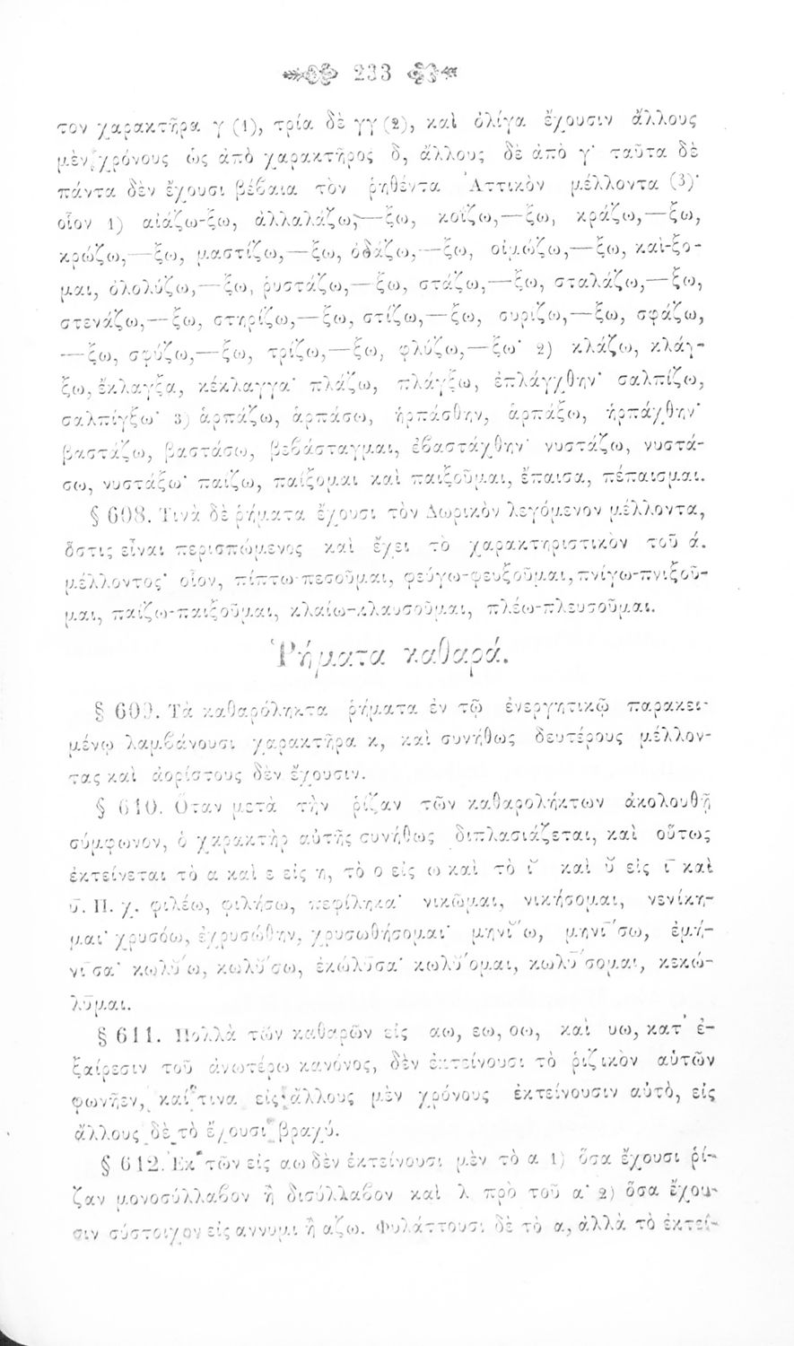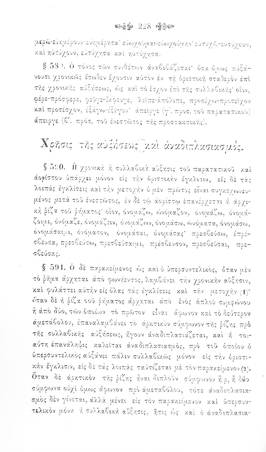 Σχολικό εγχειρίδιο Αρχαίων Ελληνικών για τα Ελληνικά Σχολεία και Παρθεναγωγεία που περιέχει τους κανόνες γραμματικής και είναι χωρισμένο σε φθογγολογικό, τυπολογικό και ετυμολογικό μέρος.