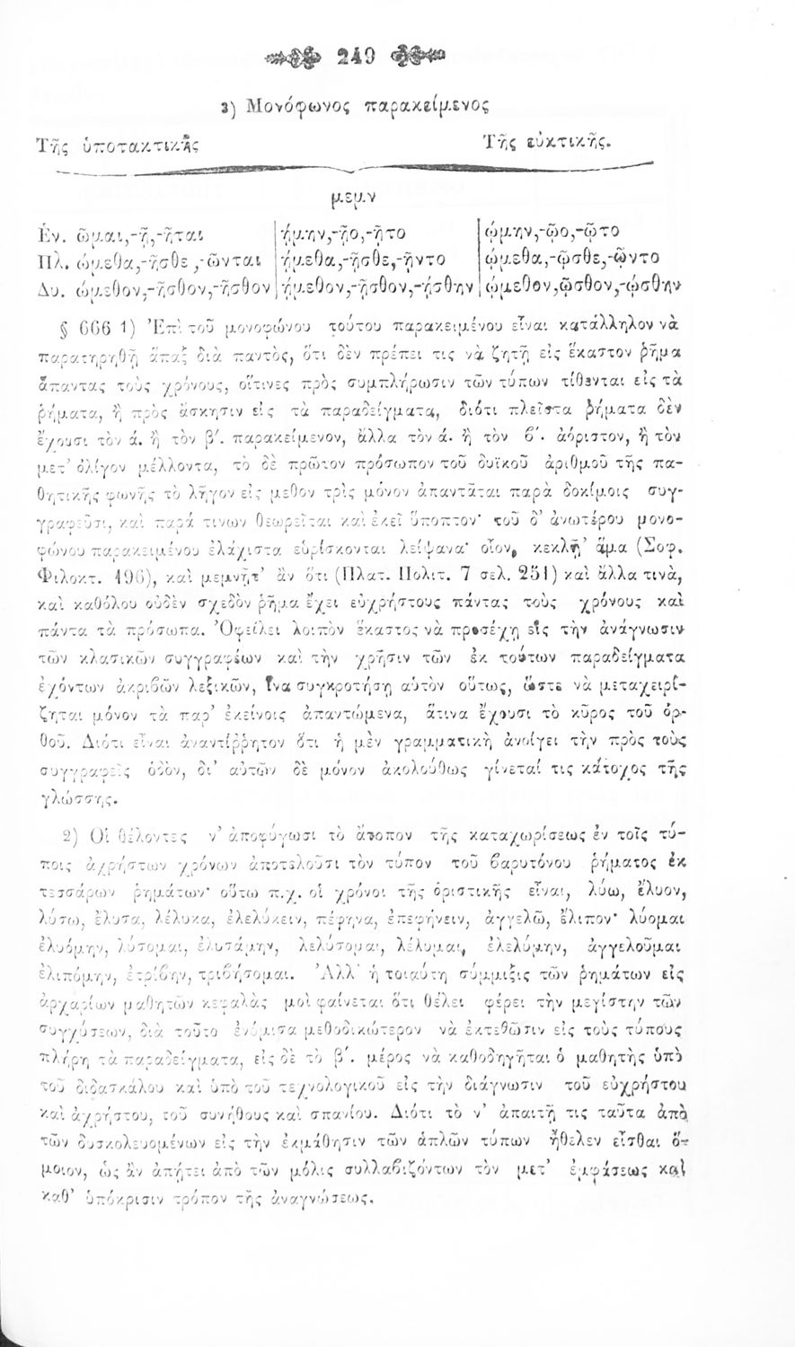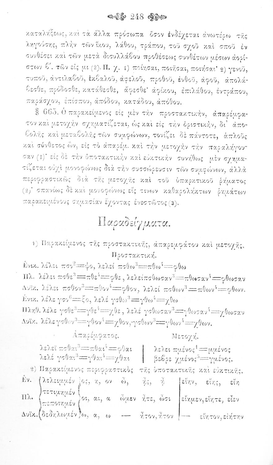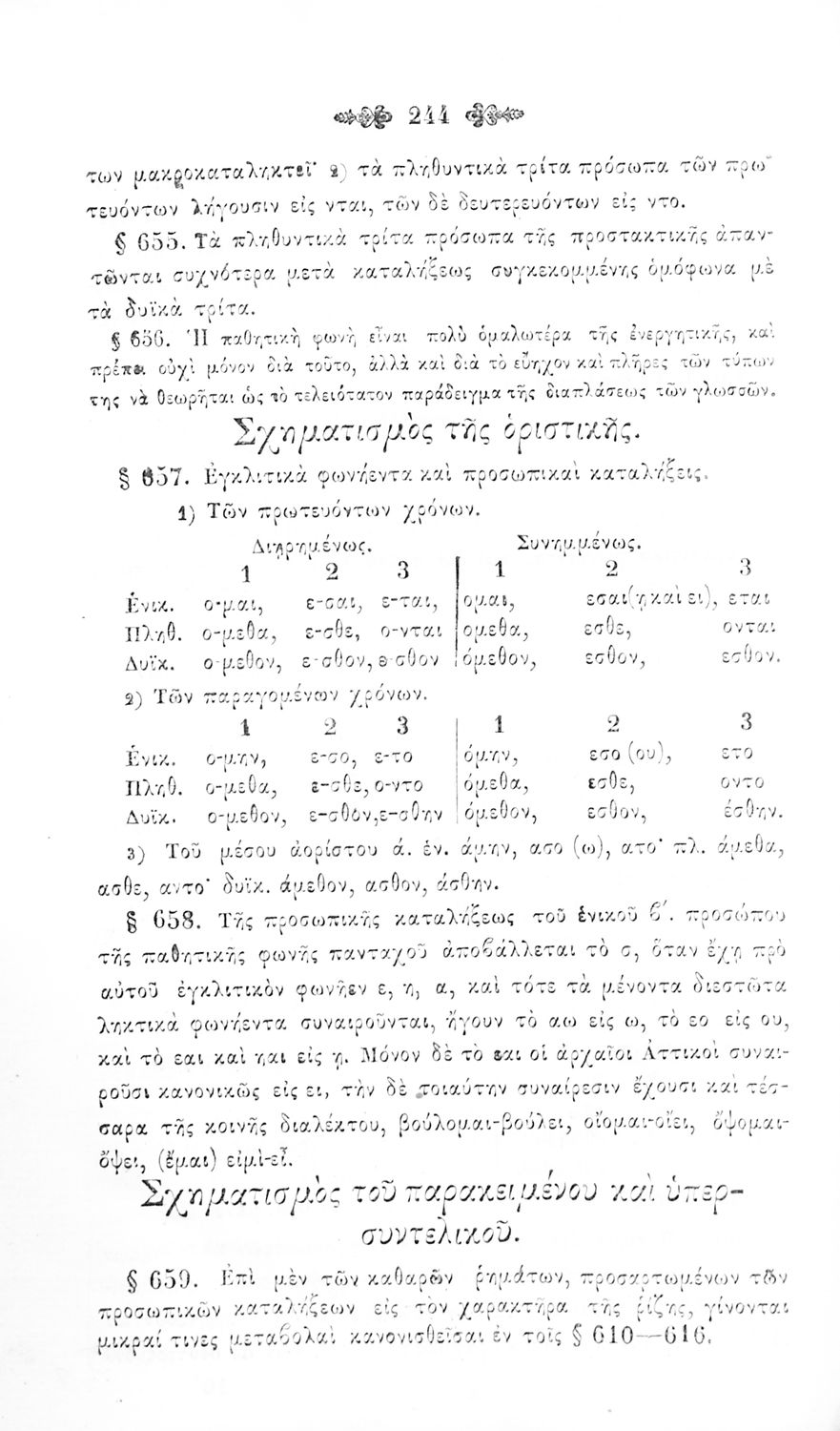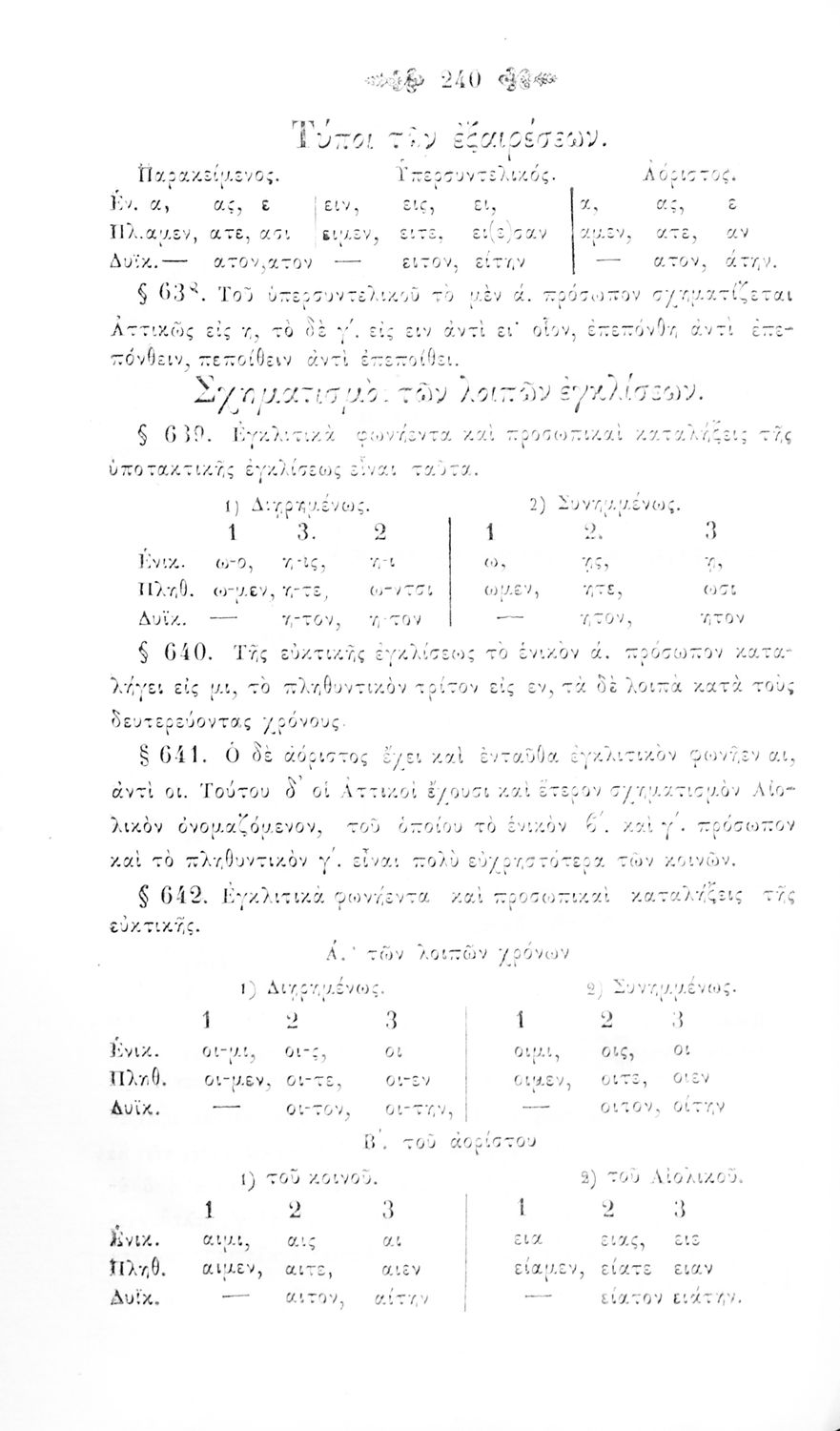 Σχολικό εγχειρίδιο Αρχαίων Ελληνικών για τα Ελληνικά Σχολεία, Παρθεναγωγεία και Γυμνάσια που περιέχει τους κανόνες γραμματικής και είναι χωρισμένο σε φθογγολογικό, τυπολογικό και ετυμολογικό μέρος.