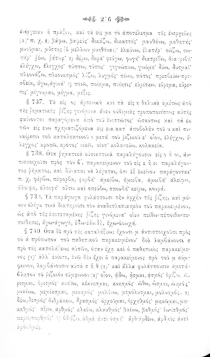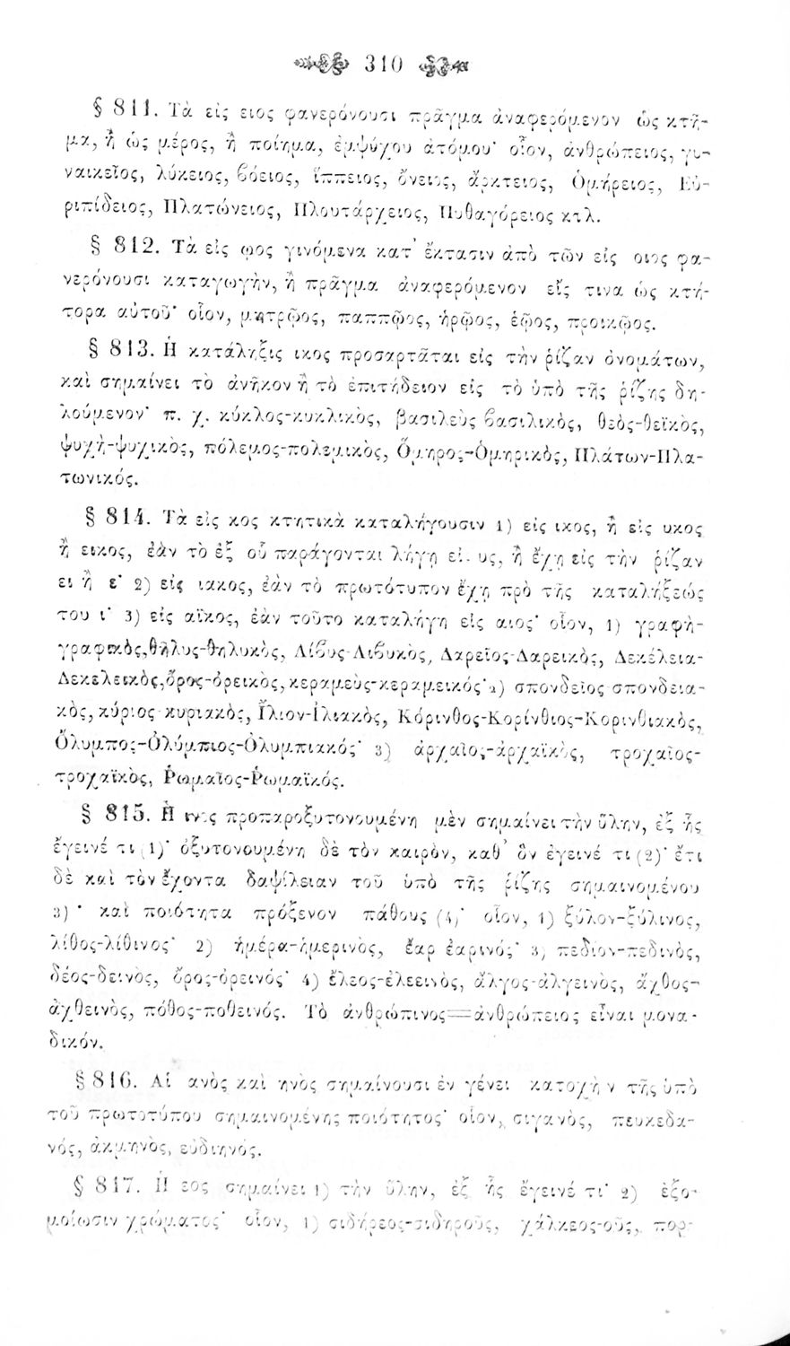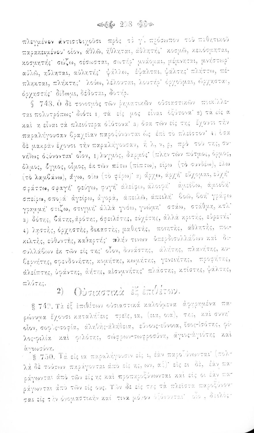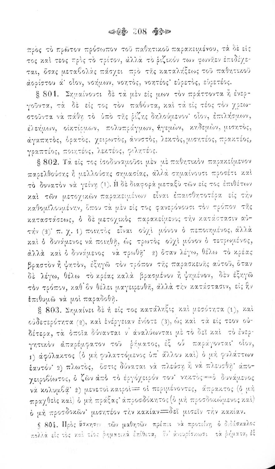 Σχολικό εγχειρίδιο Αρχαίων Ελληνικών για τα Ελληνικά Σχολεία και Παρθεναγωγεία που περιέχει τους κανόνες γραμματικής και είναι χωρισμένο σε φθογγολογικό, τυπολογικό και ετυμολογικό μέρος.