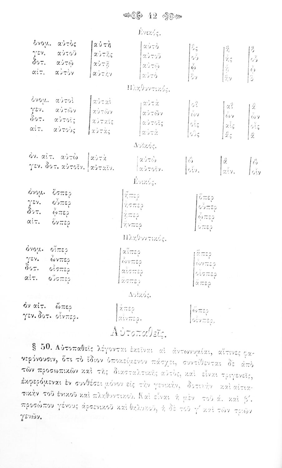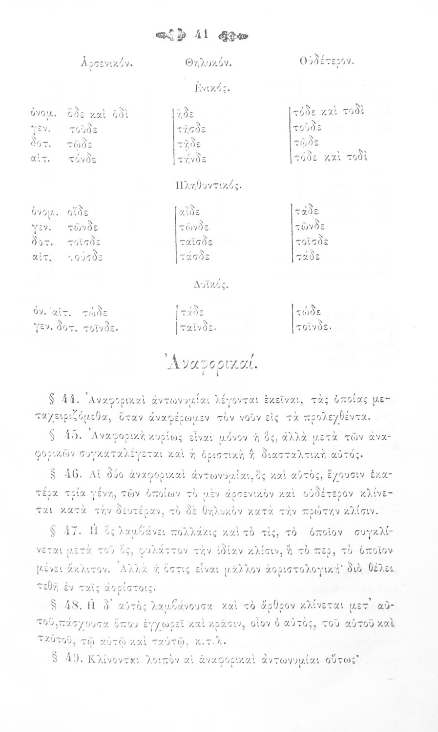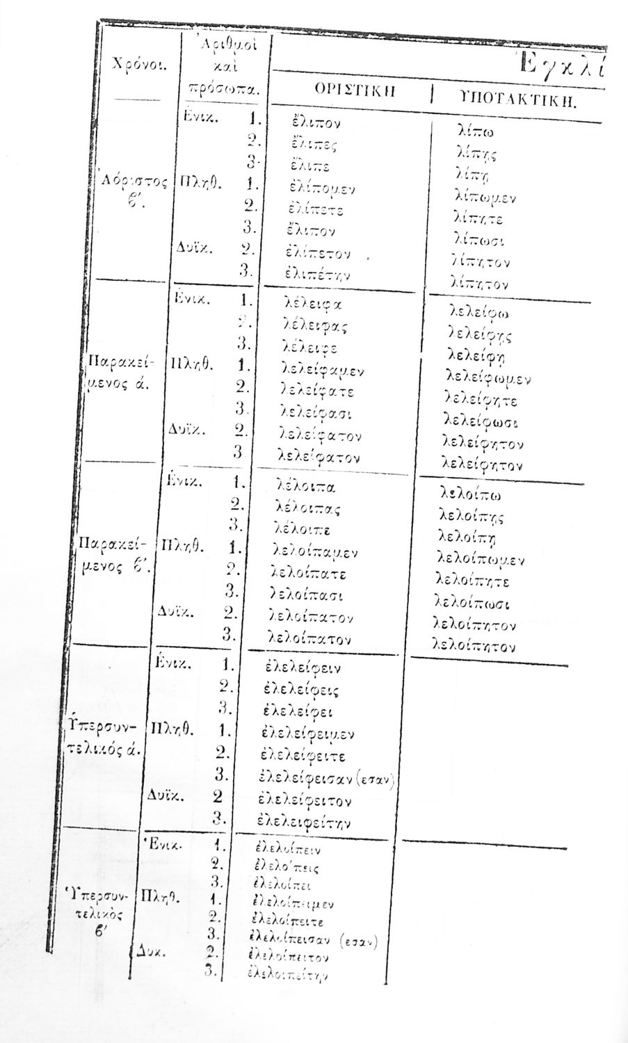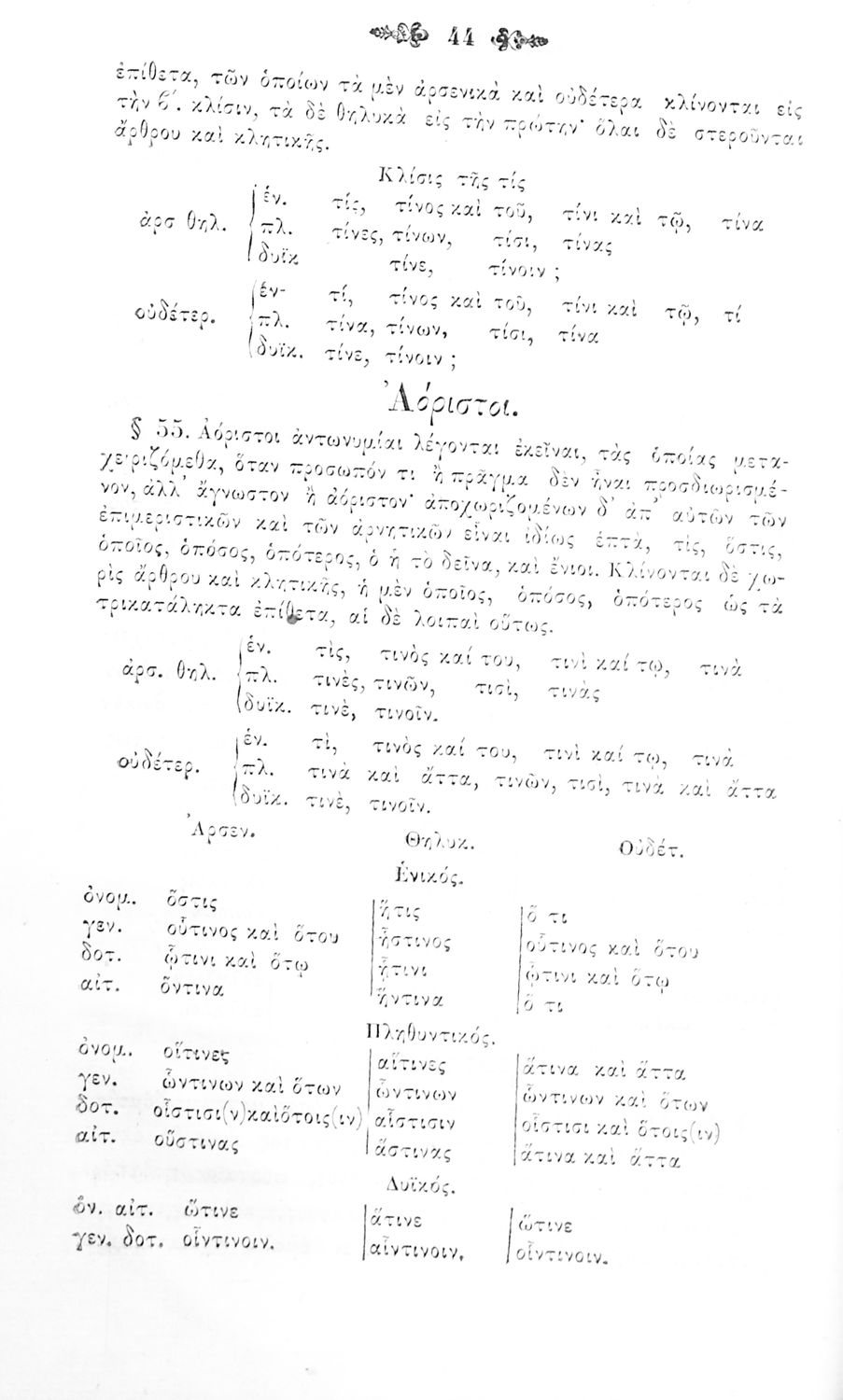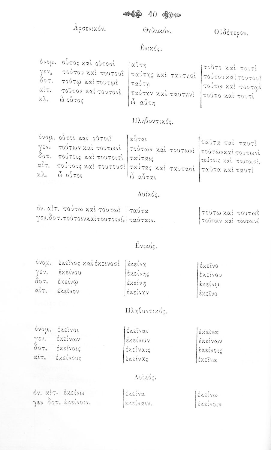 Σχολικό εγχειρίδιο Αρχαίων Ελληνικών που περιλαμβάνει τη γραμματική της αρχαίας ελληνικής και είναι χωρισμένο σε φθογγολογικό και τυπολογικό μέρος Περιέχει και κατάλογο ανωμάλων ρημάτων, ασκήσεις και σημειώσεις.