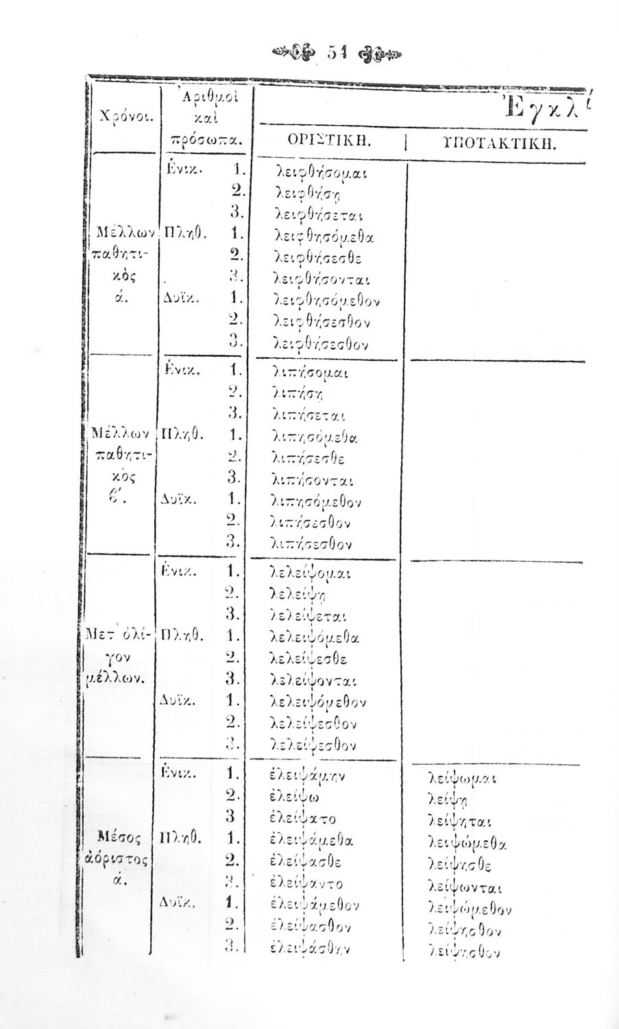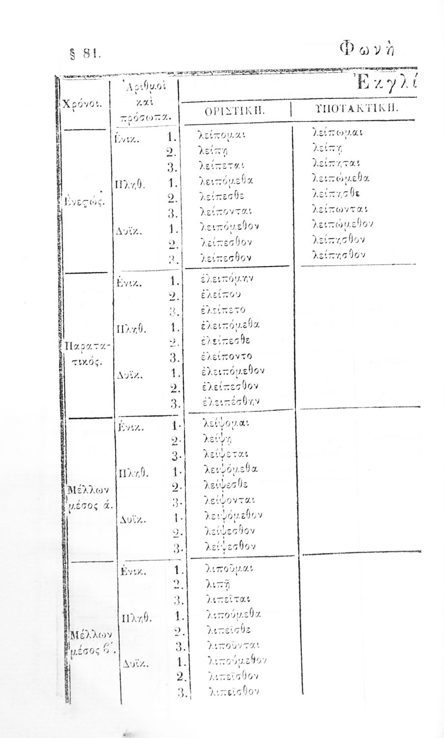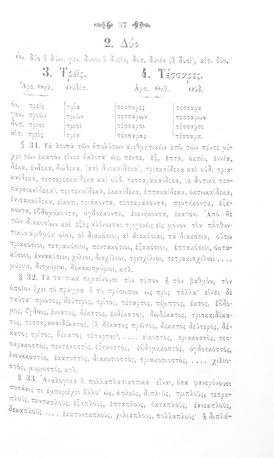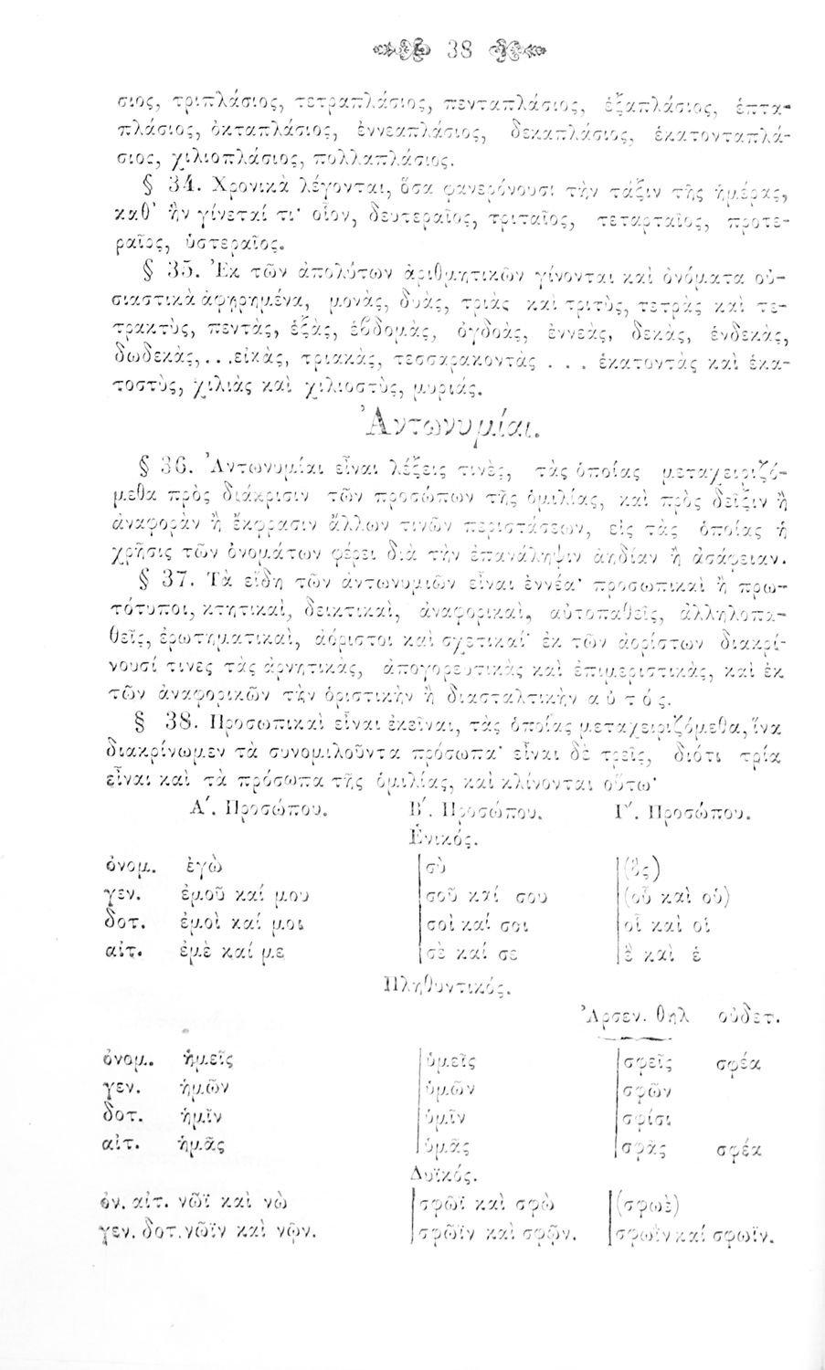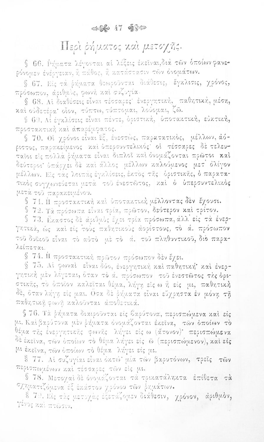 Σχολικό εγχειρίδιο Αρχαίων Ελληνικών που περιλαμβάνει τη γραμματική της αρχαίας ελληνικής και είναι χωρισμένο σε φθογγολογικό και τυπολογικό μέρος Περιέχει και κατάλογο ανωμάλων ρημάτων, ασκήσεις και σημειώσεις.