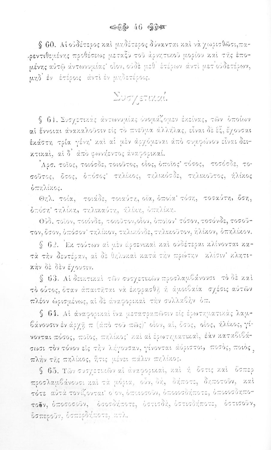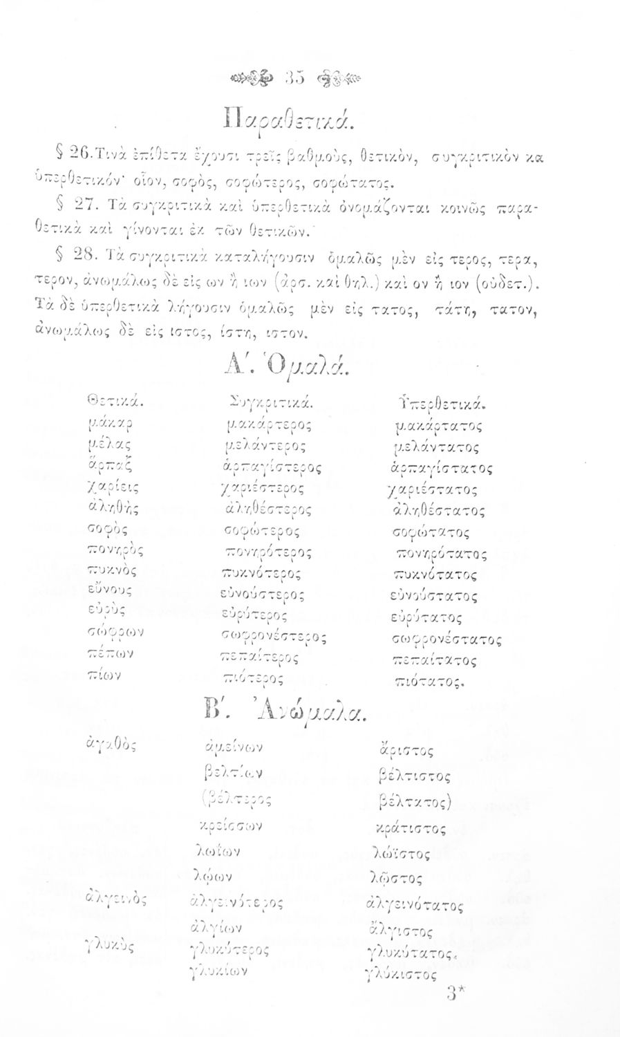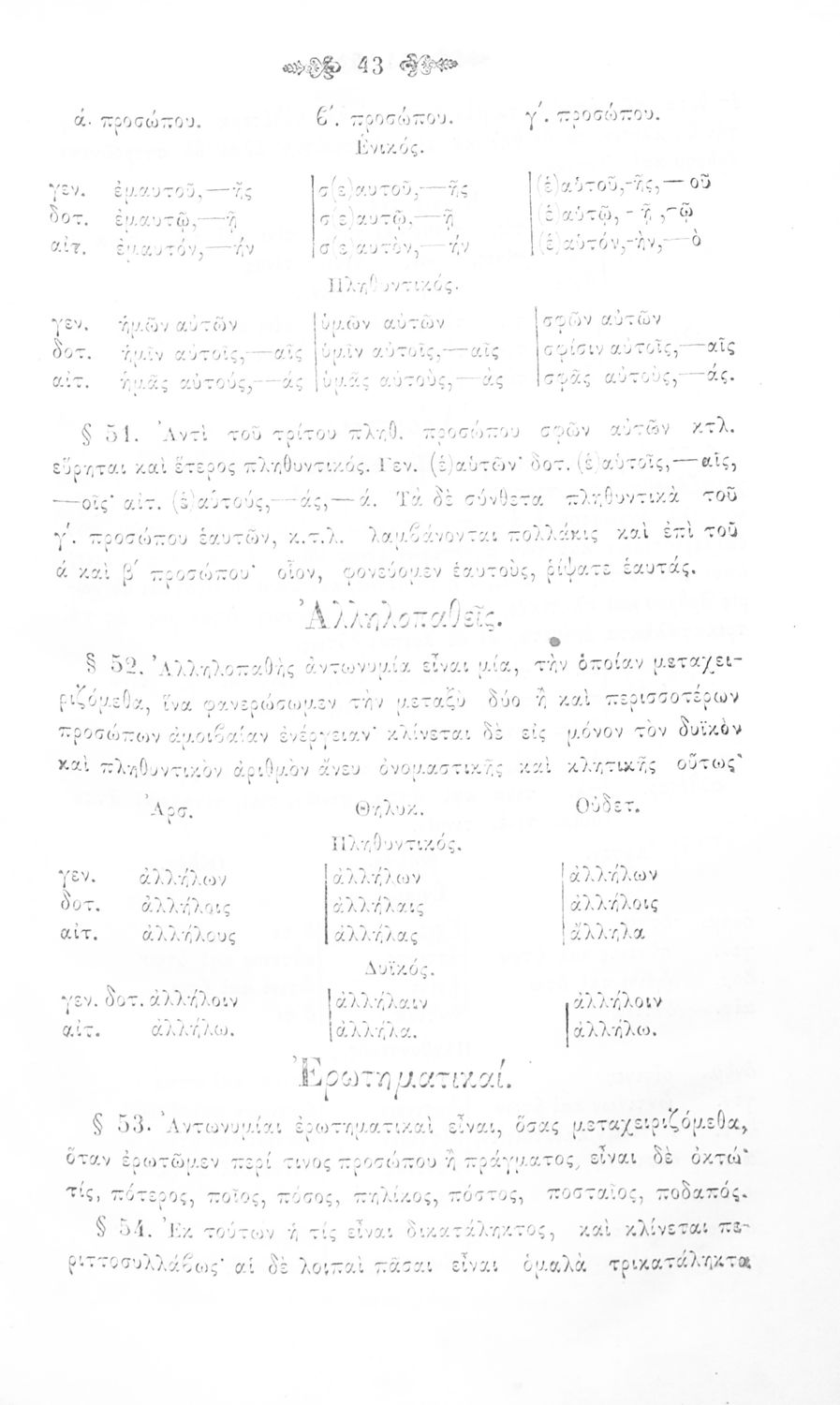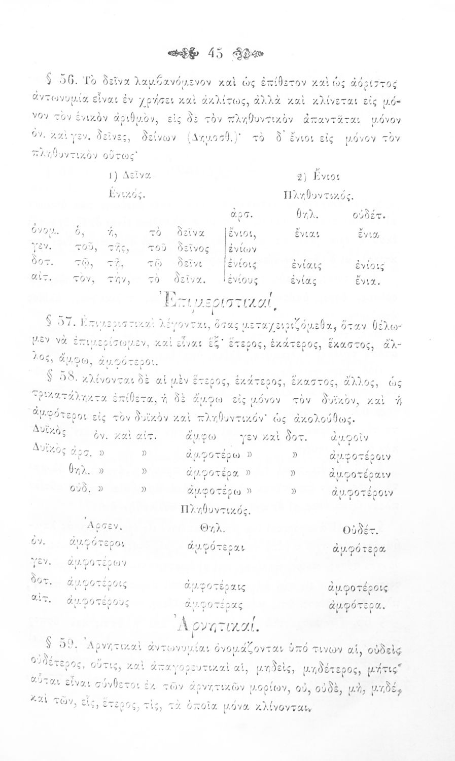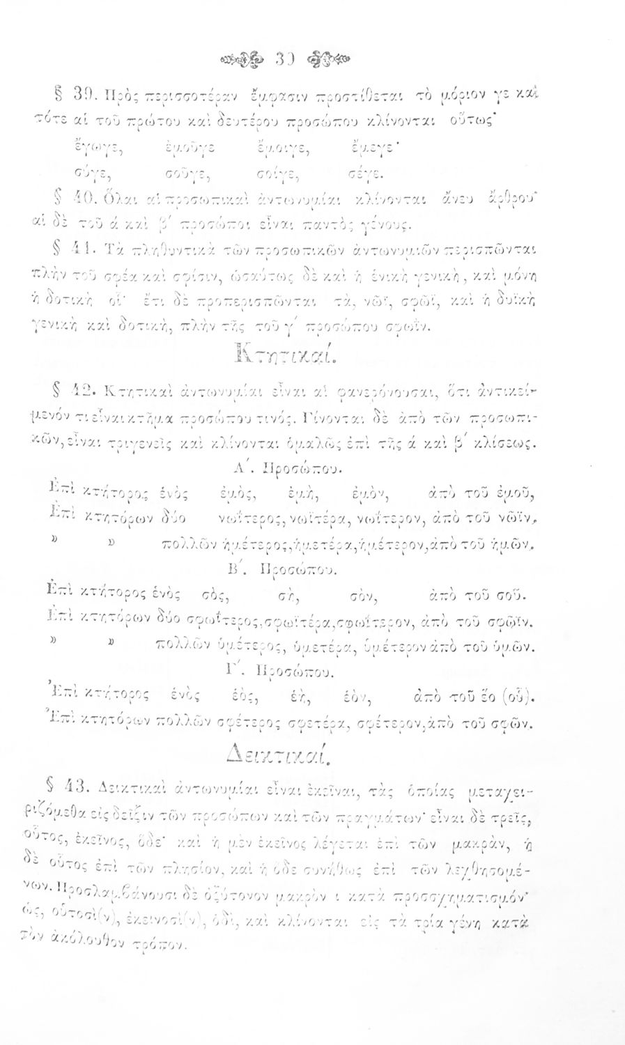 Σχολικό εγχειρίδιο Αρχαίων Ελληνικών που περιλαμβάνει τη γραμματική της αρχαίας ελληνικής και είναι χωρισμένο σε φθογγολογικό και τυπολογικό μέρος Περιέχει και κατάλογο ανωμάλων ρημάτων, ασκήσεις και σημειώσεις.
