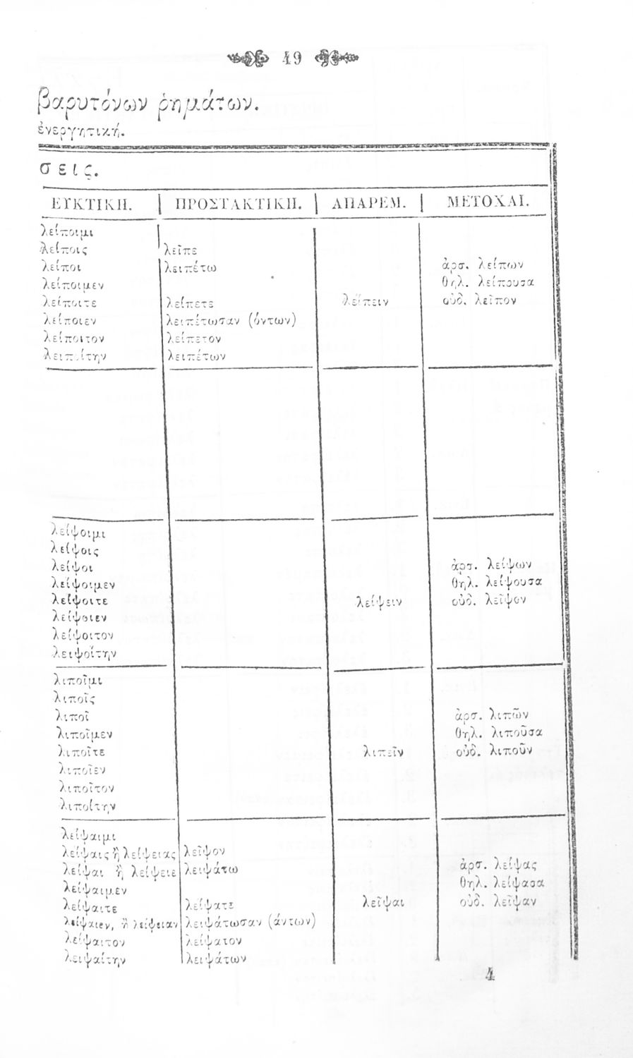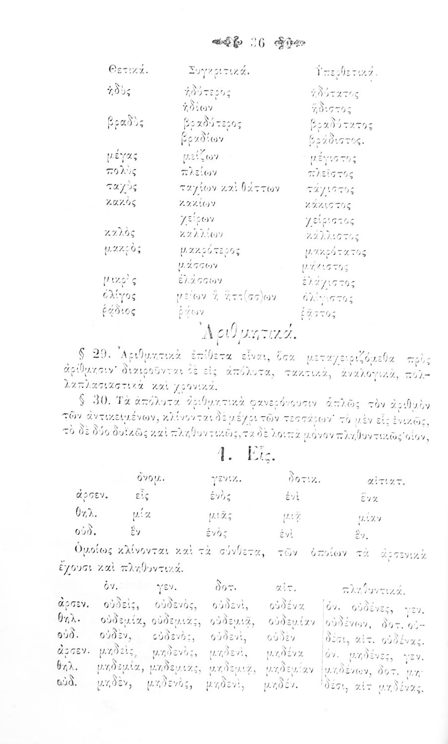 Βαθμίδα εκπαίδευσης: Δευτεροβάθμια Μάθημα: Αρχαία Ελληνικά Γλώσσα: Καθαρεύουσα Παρουσίαση περιεχομένου: Σχολικό εγχειρίδιο Αρχαίων Ελληνικών που περιλαμβάνει τη γραμματική της αρχαίας ελληνικής και είναι χωρισμένο σε φθογγολογικό και τυπολογικό μέρος Περιέχει και κατάλογο ανωμάλων ρημάτων, ασκήσεις και σημειώσεις. |