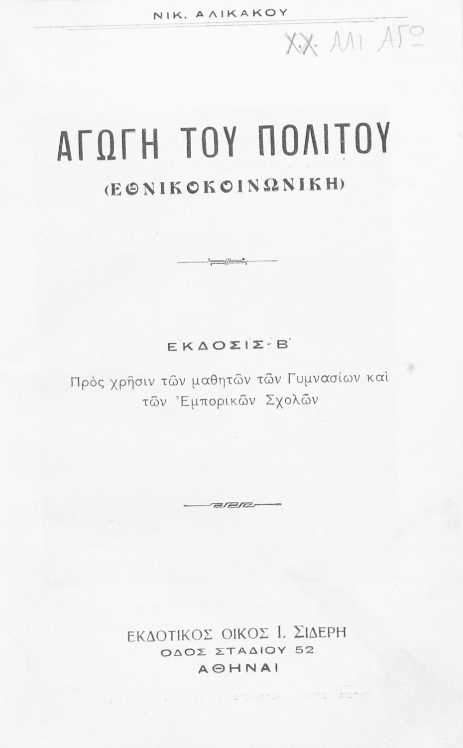 Τίτλος: Αγωγή του Πολίτου (Εθνοκοινωνική), Προς χρήσιν των μαθητών των Γυμνασίων και των Εμπορικών Σχολών