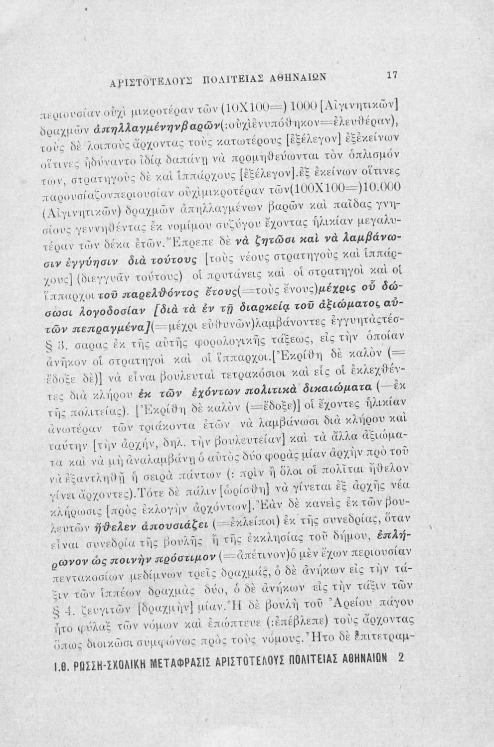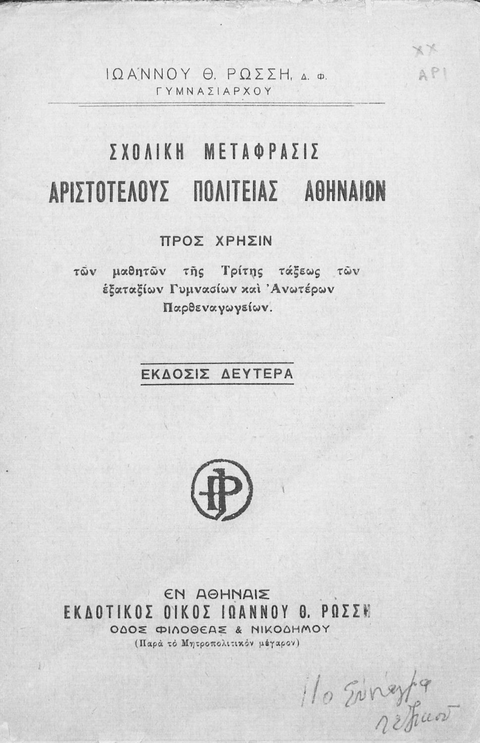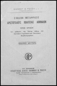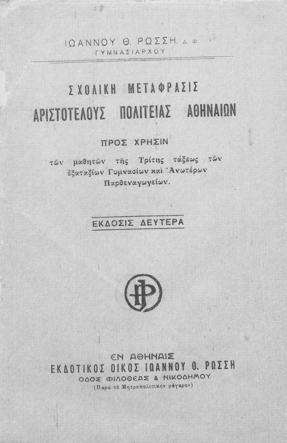 Κωδικός αναγνώρισης: 02-03156 Τίτλος: Σχολική μετάφρασις Αριστοτέλους Πολιτείας Αθηναίων προς χρήσιν των μαθητών της τρίτης τάξεως των Εξαταξίων Γυμνασίων και Ανωτέρων Παρθεναγωγείων Συγγραφέας: Ιωάννης Θ. Ρώσσης (μετάφραση) Μέγεθος και υπόστρωμα: Μαθητικό βοήθημα, μαλακό εξώφυλλο, 48 σελίδες. |