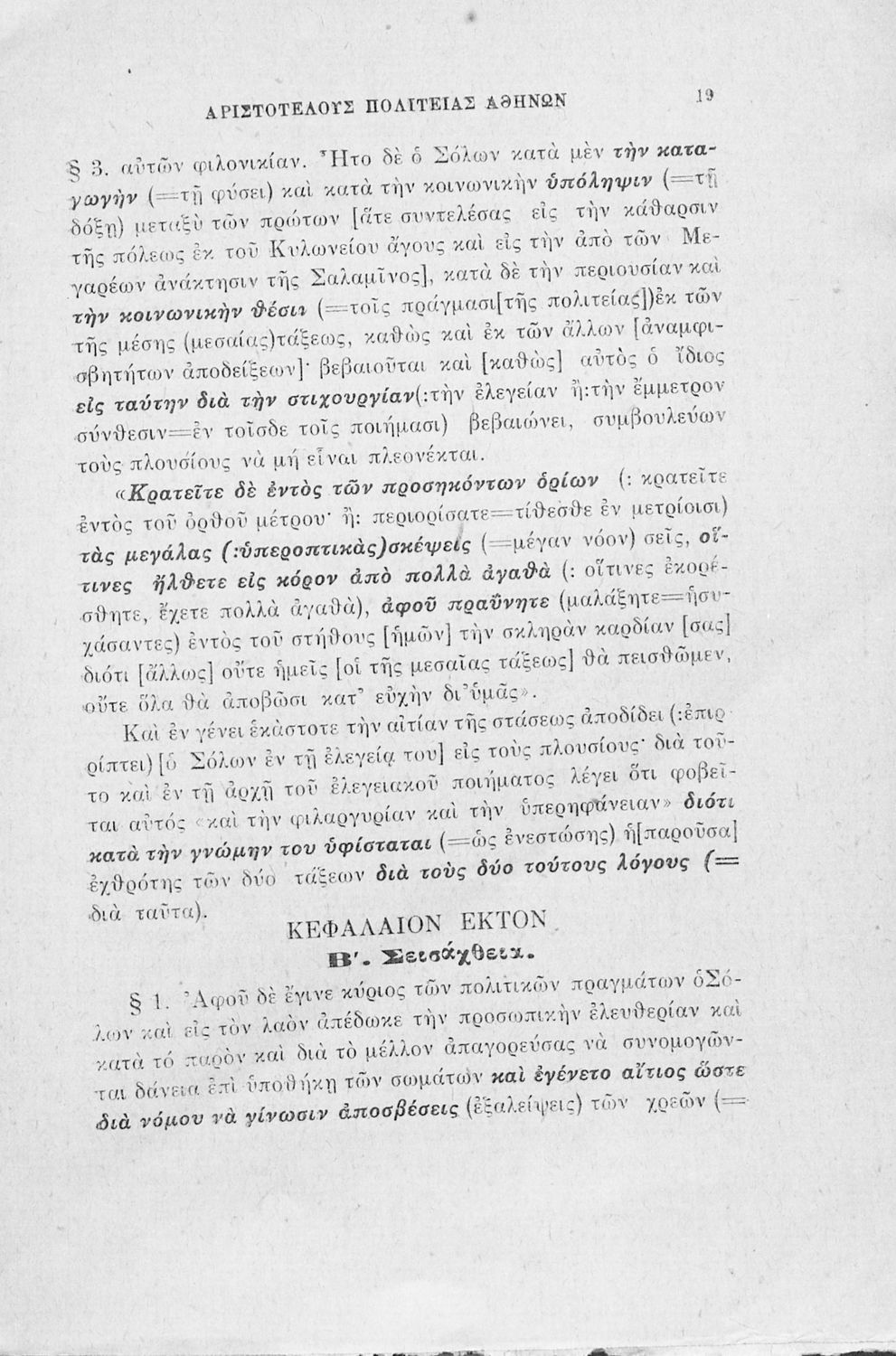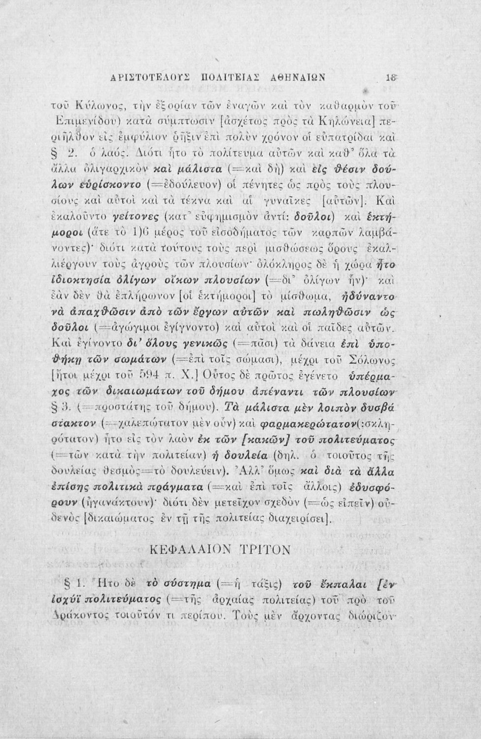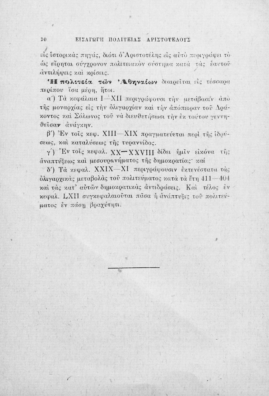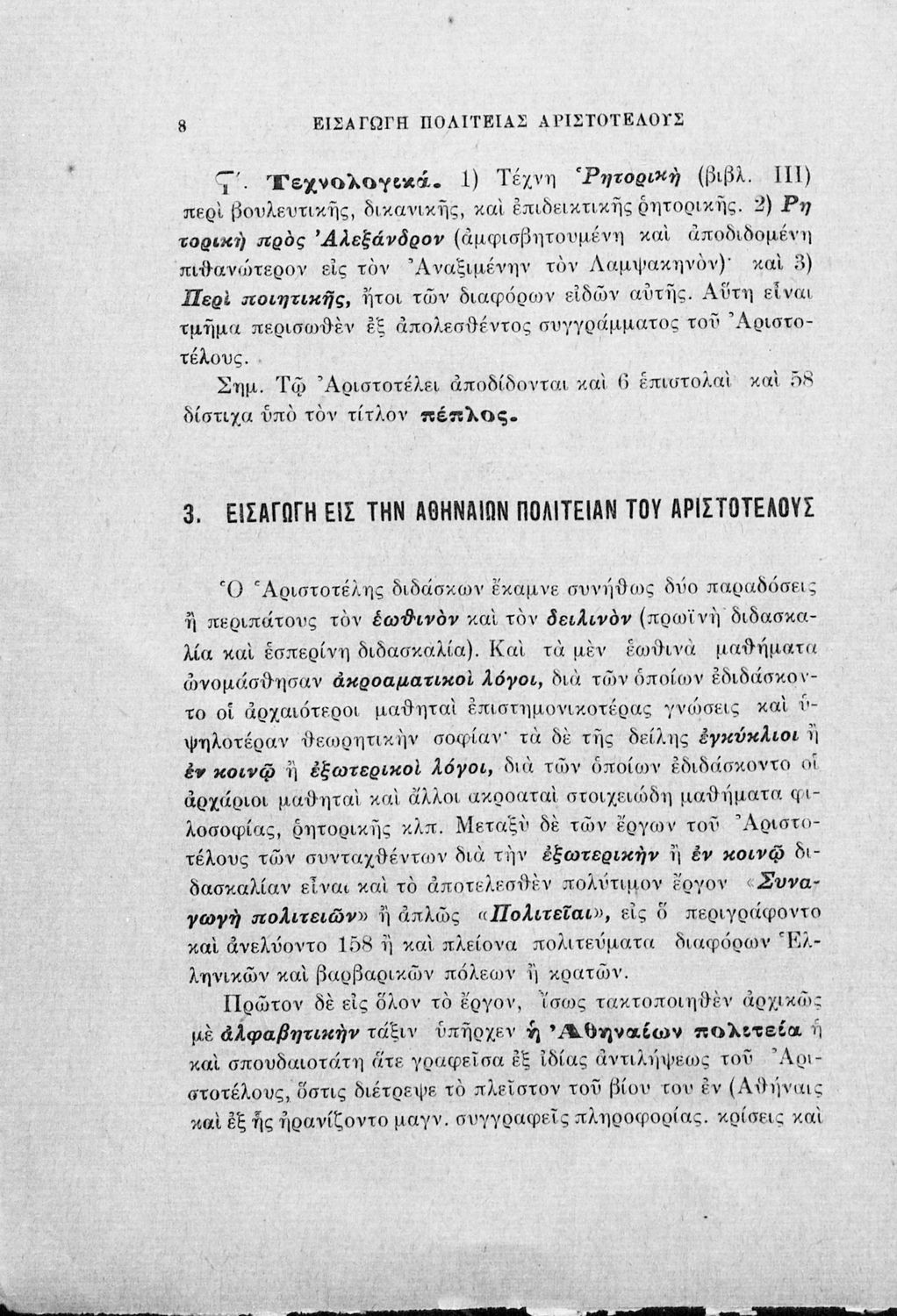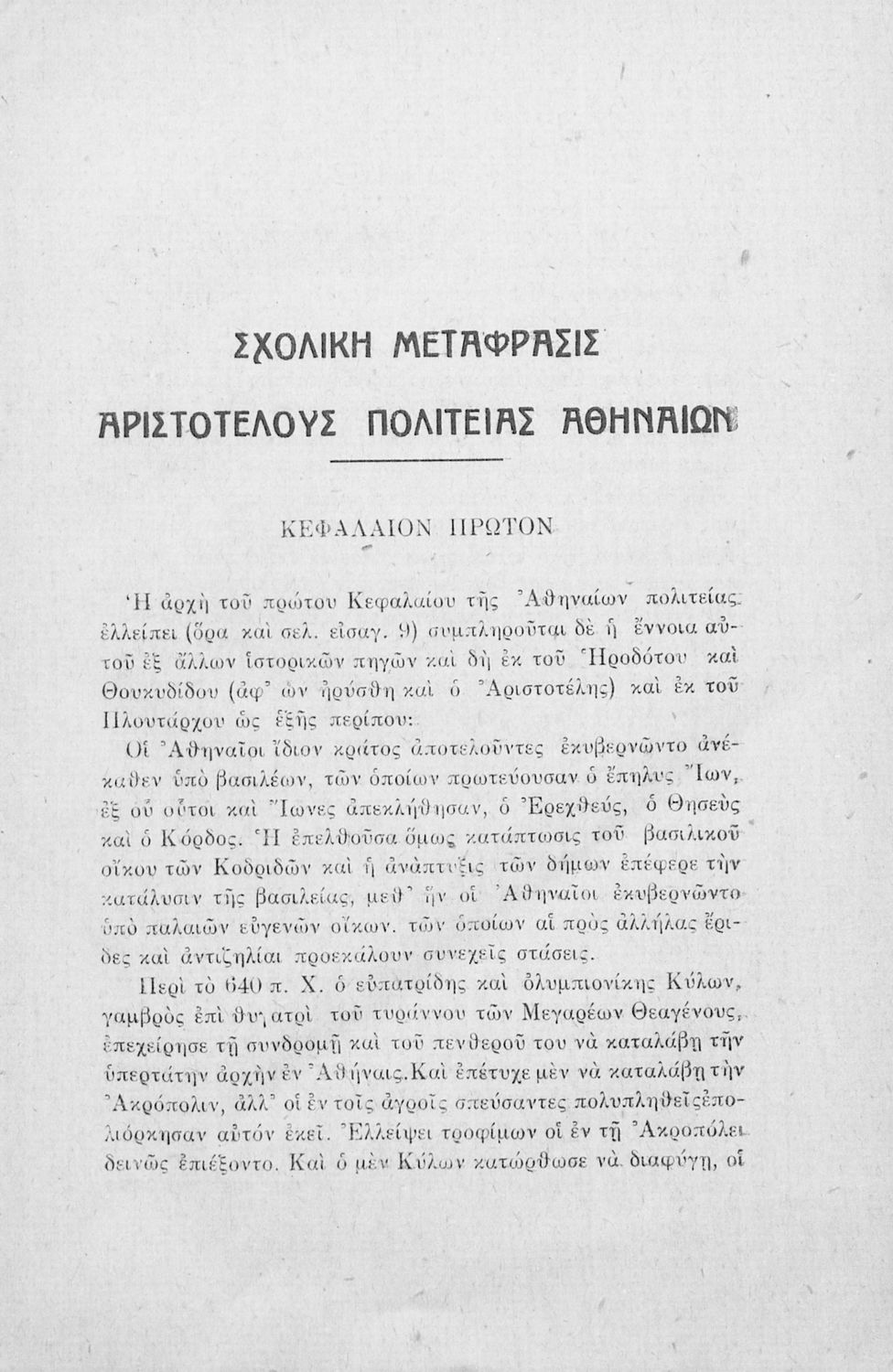 Μαθητικό βοήθημα Αρχαίων Ελληνικών Γ΄ Γυμνασίου που περιλαμβάνει εισαγωγή στη ζωή και το έργο του Αριστοτέλη και μετάφραση της Αθηναίων Πολιτείας.