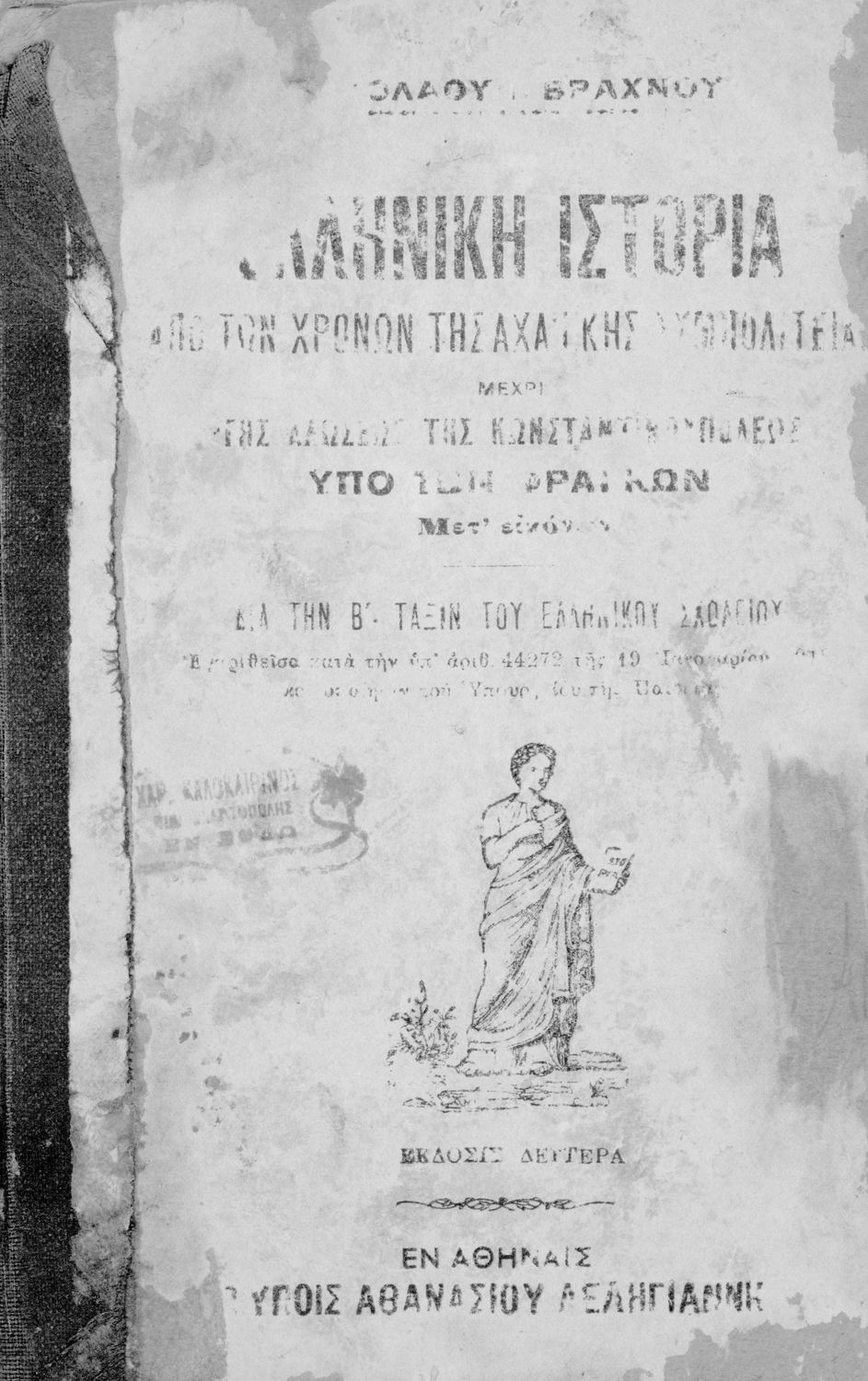 Κωδικός αναγνώρισης: 02-03168 Τίτλος: Ελληνική ιστορία από των χρόνων της αχαϊκής συμπολιτείας μέχρι της αλώσεως της Κωνσταντινουπόλεως υπό των Φράγκων μετ' εικόνων δια την Β΄ τάξιν του Ελληνικού Σχολείου Συγγραφέας: Νικόλαος Ι. Βραχνός Μέγεθος και υπόστρωμα: Σχολικό εγχειρίδιο, σκληρό εξώφυλλο, 148 σελίδες. Σκίτσα (ασπρόμαυρα). |