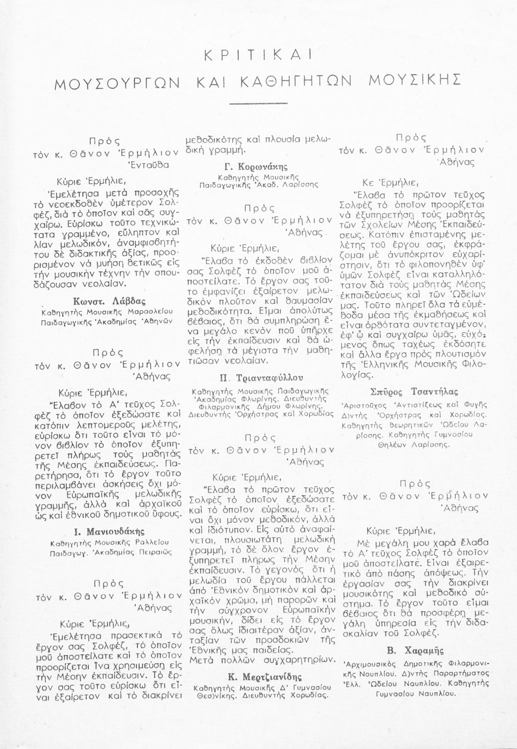 Μαθητικό βοήθημα για τις τάξεις του Γυμνασίου, των Παιδαγωγικών Ακαδημιών και Εκκλησιαστικών Σχολών για το μάθημα της Μουσικής. Το εγχειρίδιο αποτελείται από παρτιτούρες με νότες για την καλύτερη εκμάθηση του μαθήματος της μουσικής. Δίνονται παραδείγματα για το μέτρο, τις παύσεις, τα μουσικά διαστήματα κ.α.