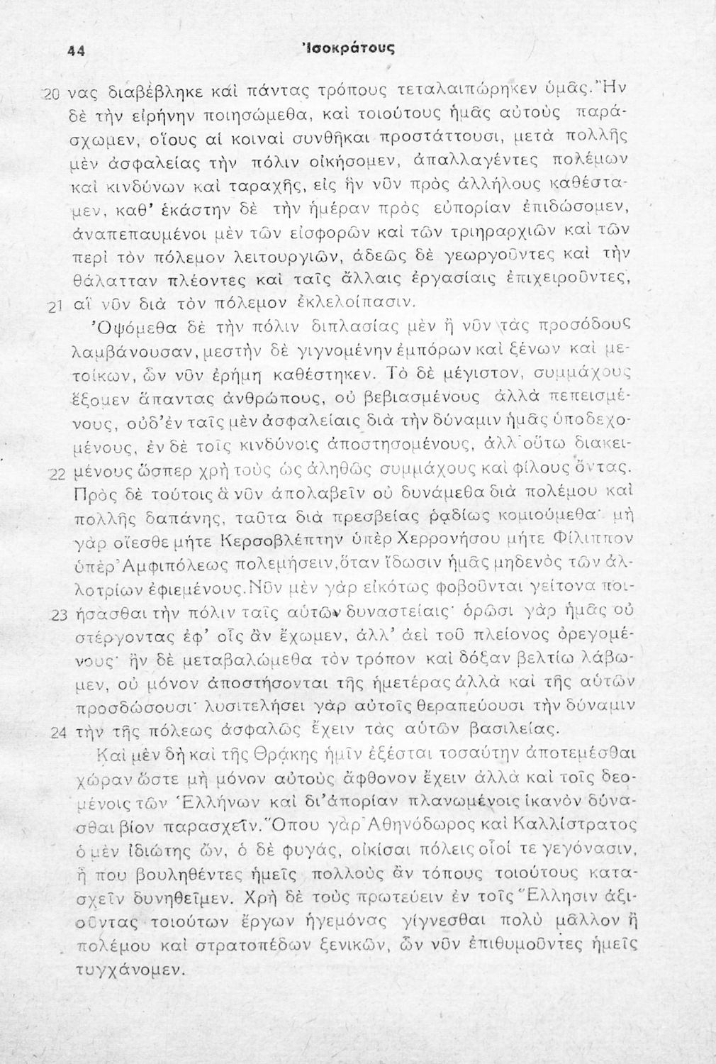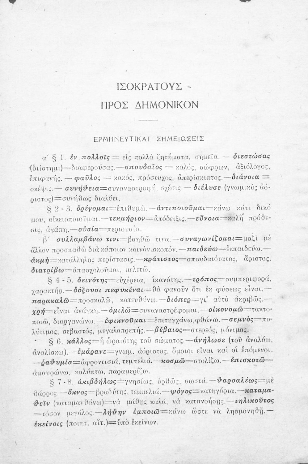 520 ## _aΜαθητικό βοήθημα Αρχαίων Ελληνικών Ε΄ Γυμνασίου που περιλαμβάνει τους Λόγους του Ισοκράτη Προς Δημόνικον, προς Νικοκλέα, Ευαγόρας, Περί Ειρήνης, εισαγωγή στη ζωή και το έργο του και στη ρητορική, και ερμηνευτικές σημειώσεις.