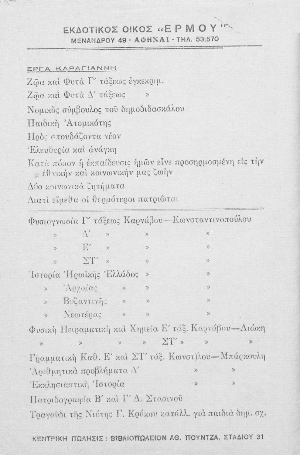 Κωδικός αναγνώρισης: 02-03253 Τίτλος: Ζώα και φυτά δια την τετάρτην τάξιν του Δημοτικού Σχολείου Συγγραφέας: Ν. Α. Καραγιάννης Μέγεθος και υπόστρωμα: Μαθητικό βοήθημα, μαλακό εξώφυλλο, 76 σελίδες. Σκίτσα (ασπρόμαυρα). |