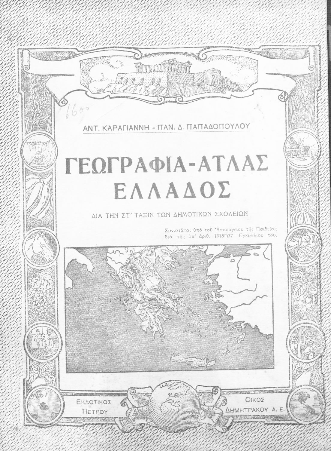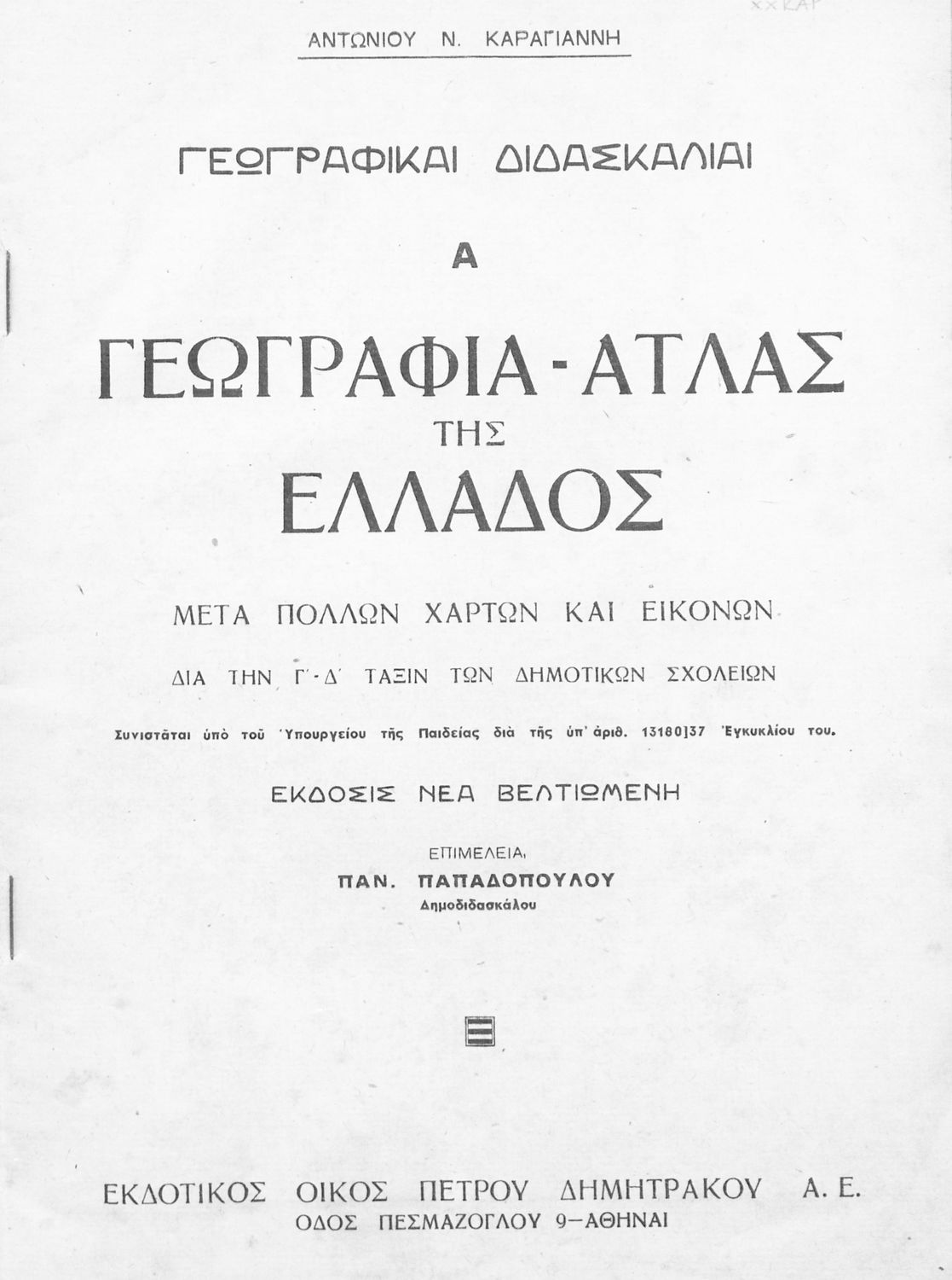 Κωδικός αναγνώρισης: 02-03255 Τίτλος: Γεωγραφικαί Διδασκαλίαι Α΄ Γεωγραφία - Άτλας της Ελλάδος μετά πολλών χαρτών και εικόνων διά την Γ΄ - Δ΄ τάξιν των Δημοτικών Σχολείων Συγγραφέας: Αντώνης Ν. Καραγιάννης, Παν. Παπαδόπουλος (επιμ.) Μέγεθος και υπόστρωμα: Μαθητικό βοήθημα, μαλακό εξώφυλλο, 60 σελίδες. Εικόνες (ασπρόμαυρες), χάρτες (ασπρόμαυροι). |