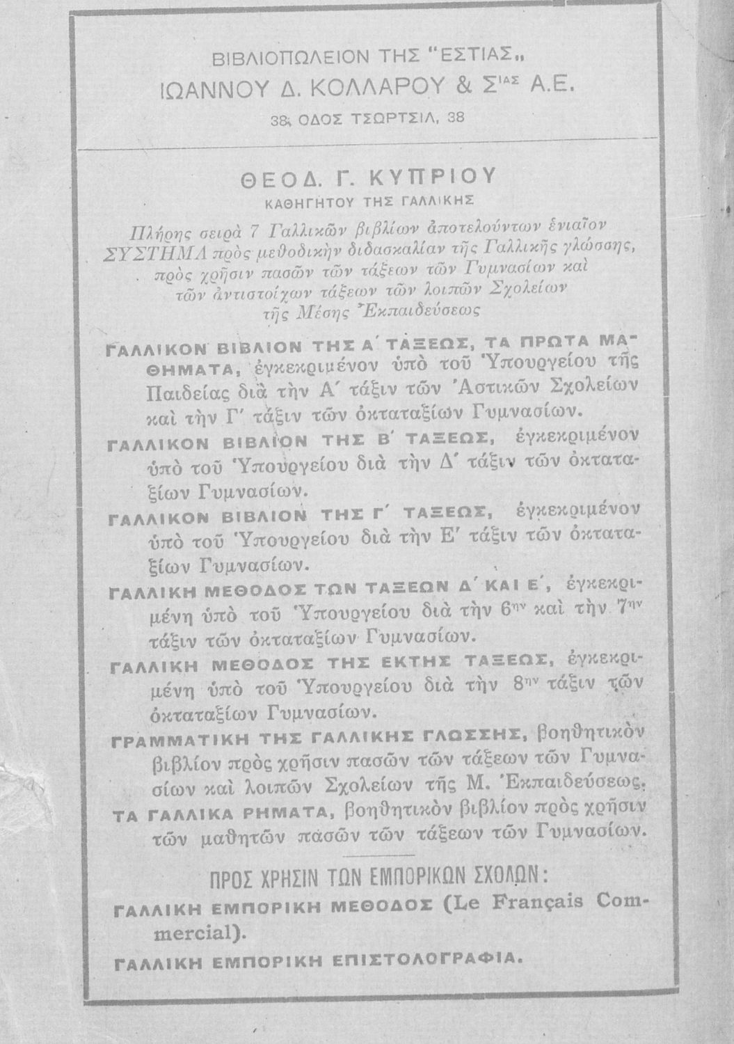 Τίτλος: Γαλλική μέθοδος των τάξεων Δ΄ και Ε΄, εγκεκριμένη υπό του Υπουργείου της Παιδείας δια την έκτην και την έβδομην τάξιν των οκταταξίων Γυμνασίων και τας αντιστοίχους τάξεις των λοιπών σχολείων της Μέσης εκπαιδεύσεως