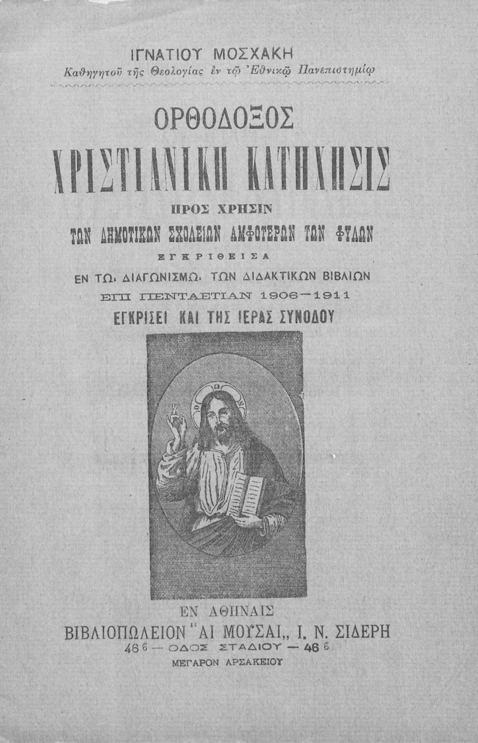 Κωδικός αναγνώρισης: 02-03305 Τίτλος: Ορθόδοξος χριστιανική κατήχησις προς χρήσιν των Δημοτικών Σχολείων αμφοτέρων των φύλων Συγγραφέας: Ιγνάτιος Μοσχάκης Μέγεθος και υπόστρωμα: Σχολικό εγχειρίδιο, μαλακό εξώφυλλο, 52 σελίδες. |