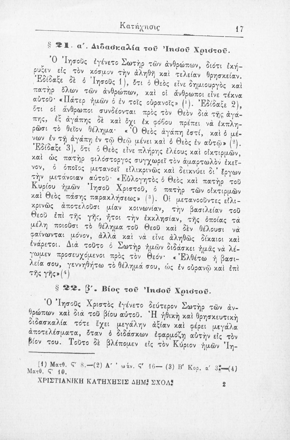 Βαθμίδα εκπαίδευσης: Πρωτοβάθμια Τάξη: Δ' Δημοτικού Μάθημα: Θρησκευτικά Γλώσσα: Καθαρεύουσα Παρουσίαση περιεχομένου: Σχολικό εγχειρίδιο Θρησκευτικών Δ΄ Δημοτικού περιλαμβάνει εισαγωγή στο Χριστιανισμό και εστιάζει στο δογματικό, ηθικό και το λειτουργικό μέρος της ορθόδοξης χριστιανικής κατήχησης. |