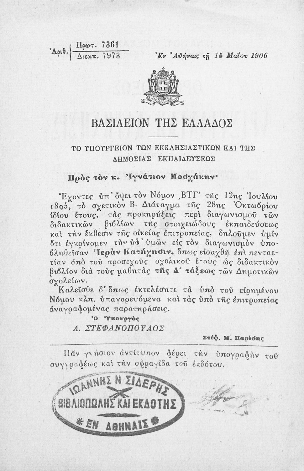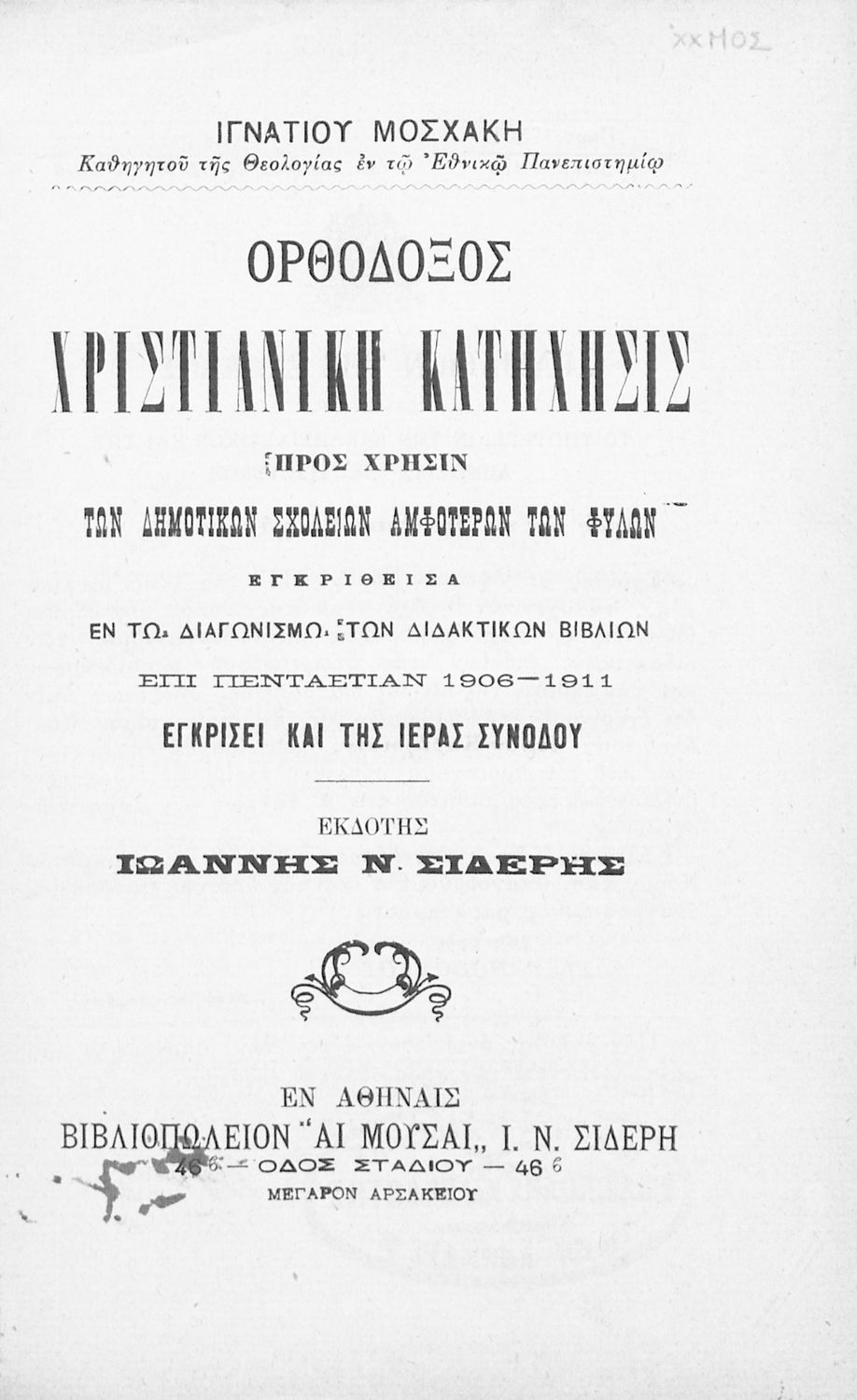 Εκδότης: Ιωάννης Ν. Σιδέρης Τόπος έκδοσης: Αθήνα Υπουργική απόφαση / Σύμβαση: 7361/13-5-1906 Έτος έγκρισης: 1906 |