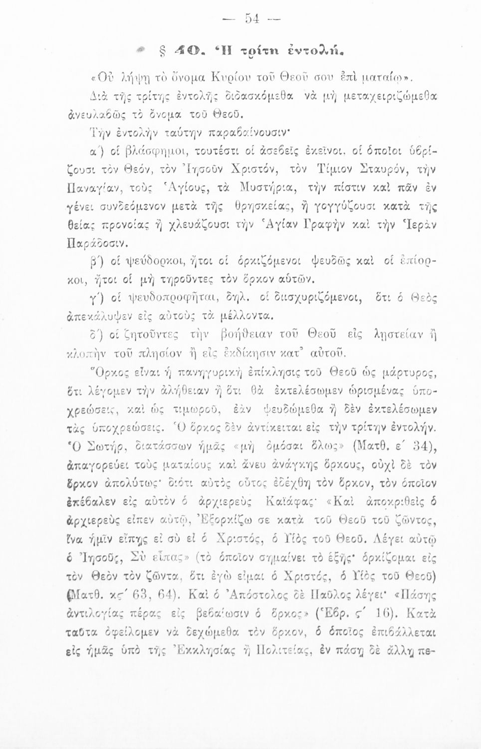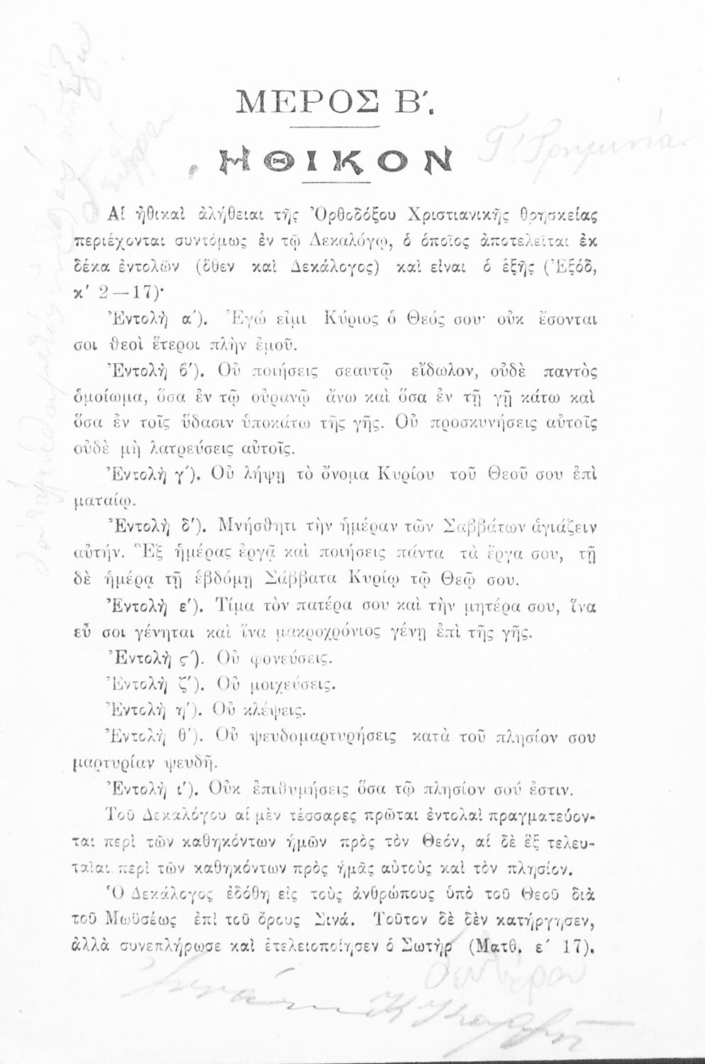 Σχολικό εγχειρίδιο Θρησκευτικών για τα Ελληνικά Σχολεία και Παρθεναγωγεία που εστιάζει σε θέματα χριστιανικής ηθικής και σε δογματικά και ηθικά ζητήματα της ορθόδοξης κατήχησης.