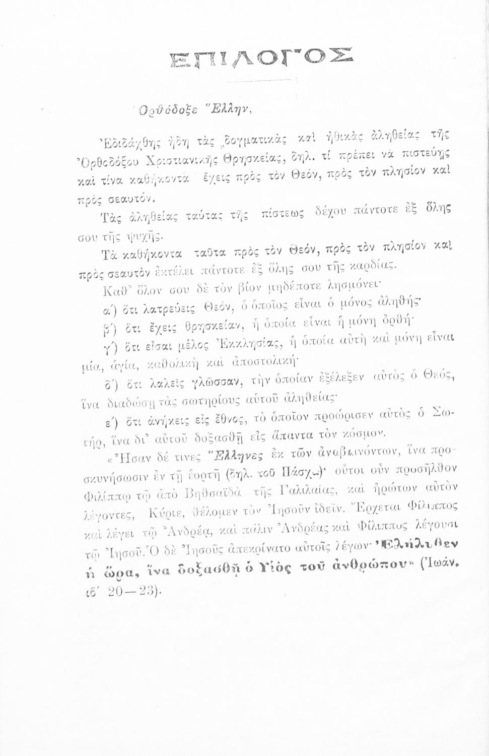 Βαθμίδα εκπαίδευσης: Δευτεροβάθμια Τάξη: Ελληνικό Σχολείο / Παρθεναγωγείο Μάθημα: Θρησκευτικά Γλώσσα: Καθαρεύουσα Παρουσίαση περιεχομένου: Σχολικό εγχειρίδιο Θρησκευτικών για τα Ελληνικά Σχολεία και Παρθεναγωγεία που περιλαμβάνει εισαγωγή στην Παλαιά και Καινή Διαθήκη και πραγματεύεται δογματικά και ηθικά ζητήματα της ορθόδοξης κατήχησης. Είχε εγκριθεί από την Ιερά Σύνοδο. |