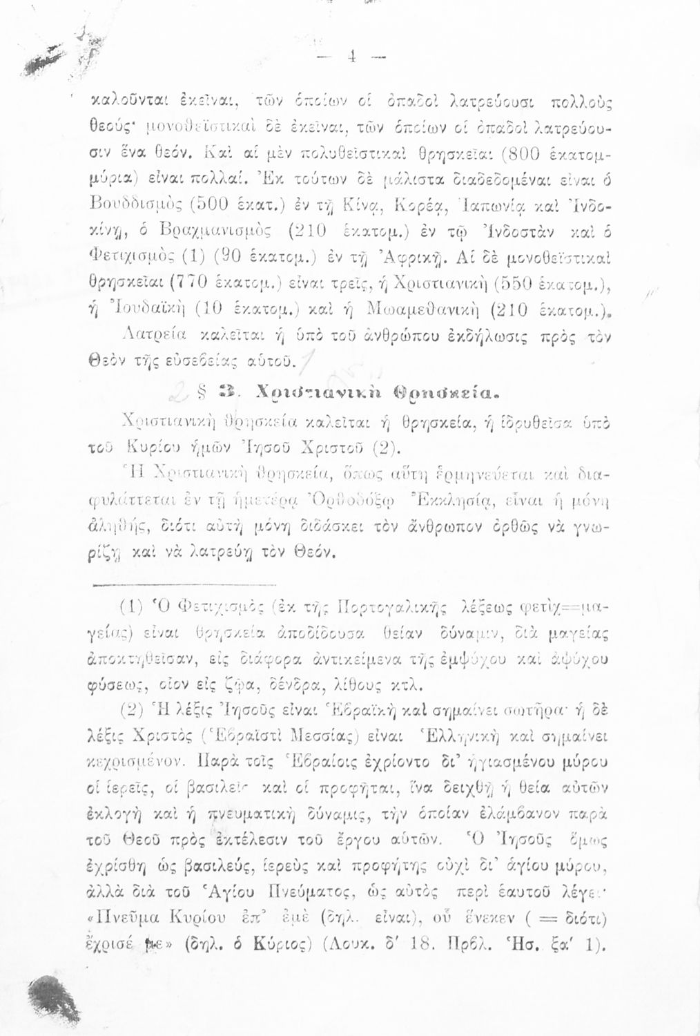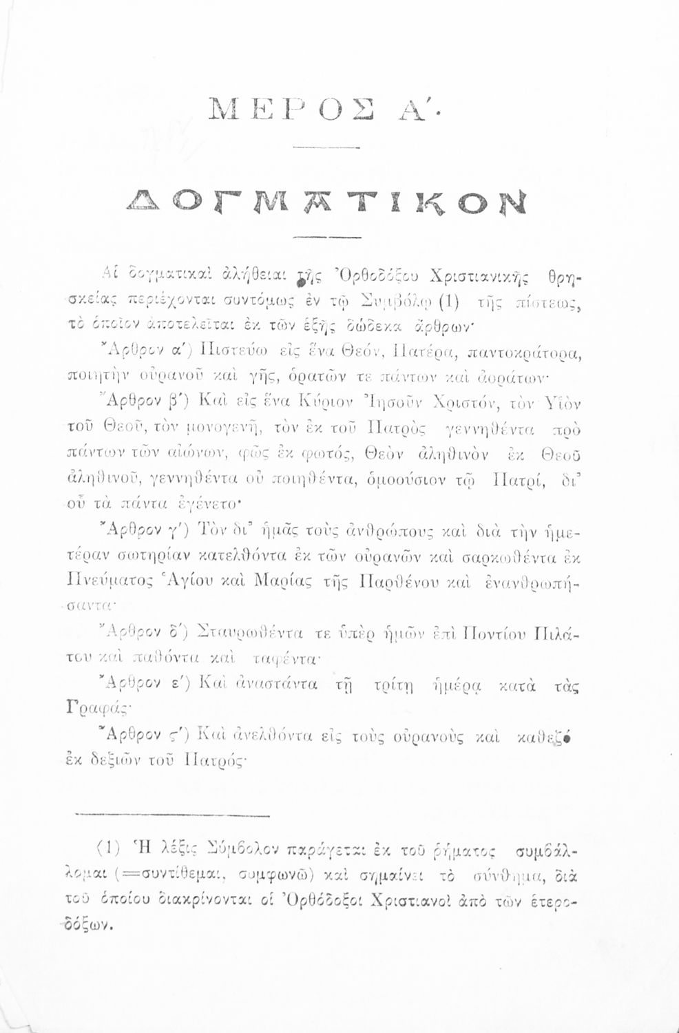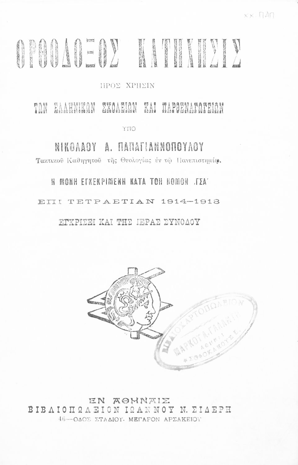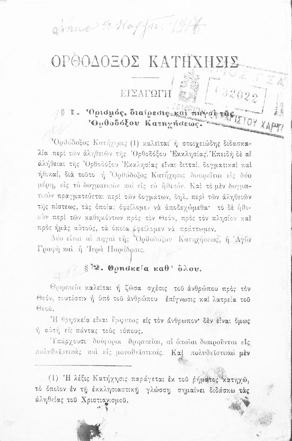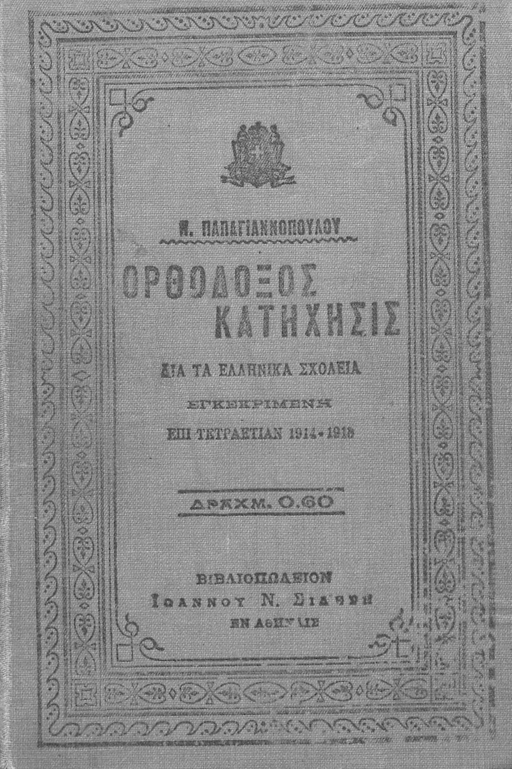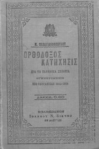 Βαθμίδα εκπαίδευσης: Δευτεροβάθμια Τάξη: Ελληνικό Σχολείο / Παρθεναγωγείο Μάθημα: Θρησκευτικά Γλώσσα: Καθαρεύουσα Παρουσίαση περιεχομένου: Σχολικό εγχειρίδιο Θρησκευτικών για τα Ελληνικά Σχολεία και Παρθεναγωγεία που περιλαμβάνει εισαγωγή στην Παλαιά και Καινή Διαθήκη και πραγματεύεται δογματικά και ηθικά ζητήματα της ορθόδοξης κατήχησης. Είχε εγκριθεί από την Ιερά Σύνοδο. |