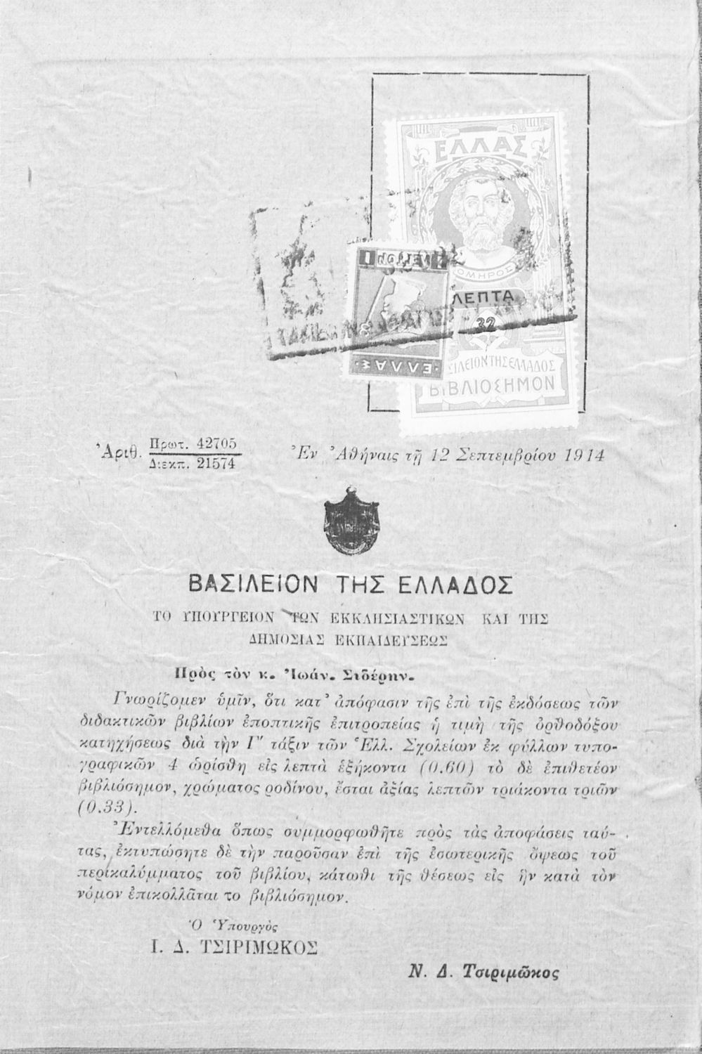 Εκδότης: Ιωάννης Ν. Σιδέρης Τόπος έκδοσης: Αθήνα Υπουργική απόφαση / Σύμβαση: 42765/12-9-1914 Έτος έγκρισης: 1914 |