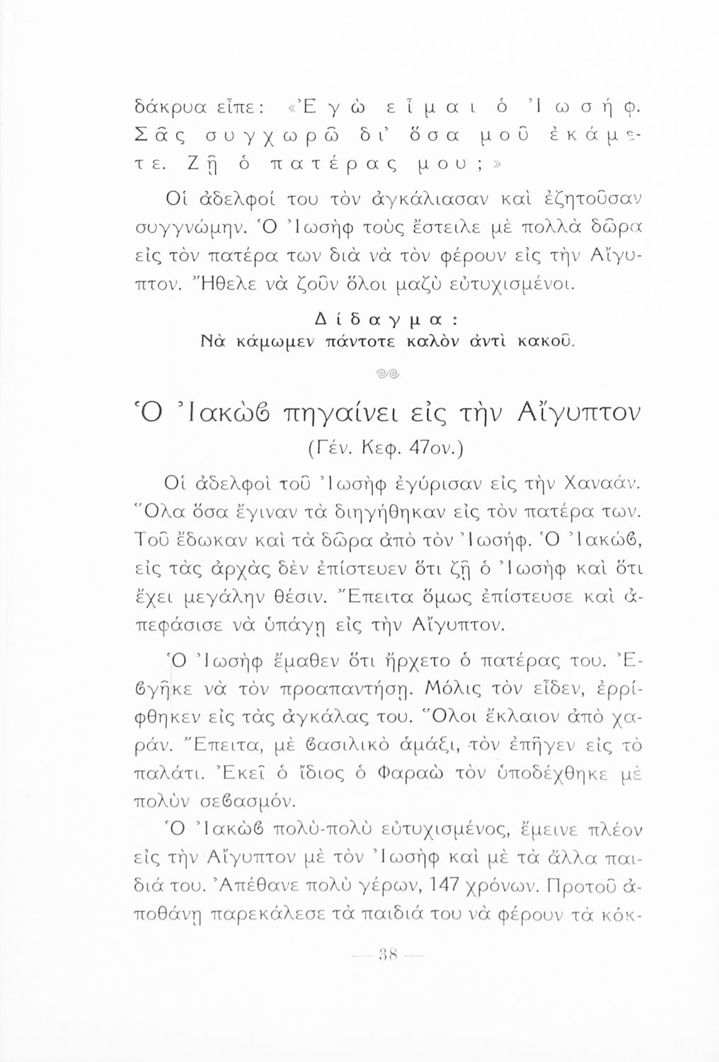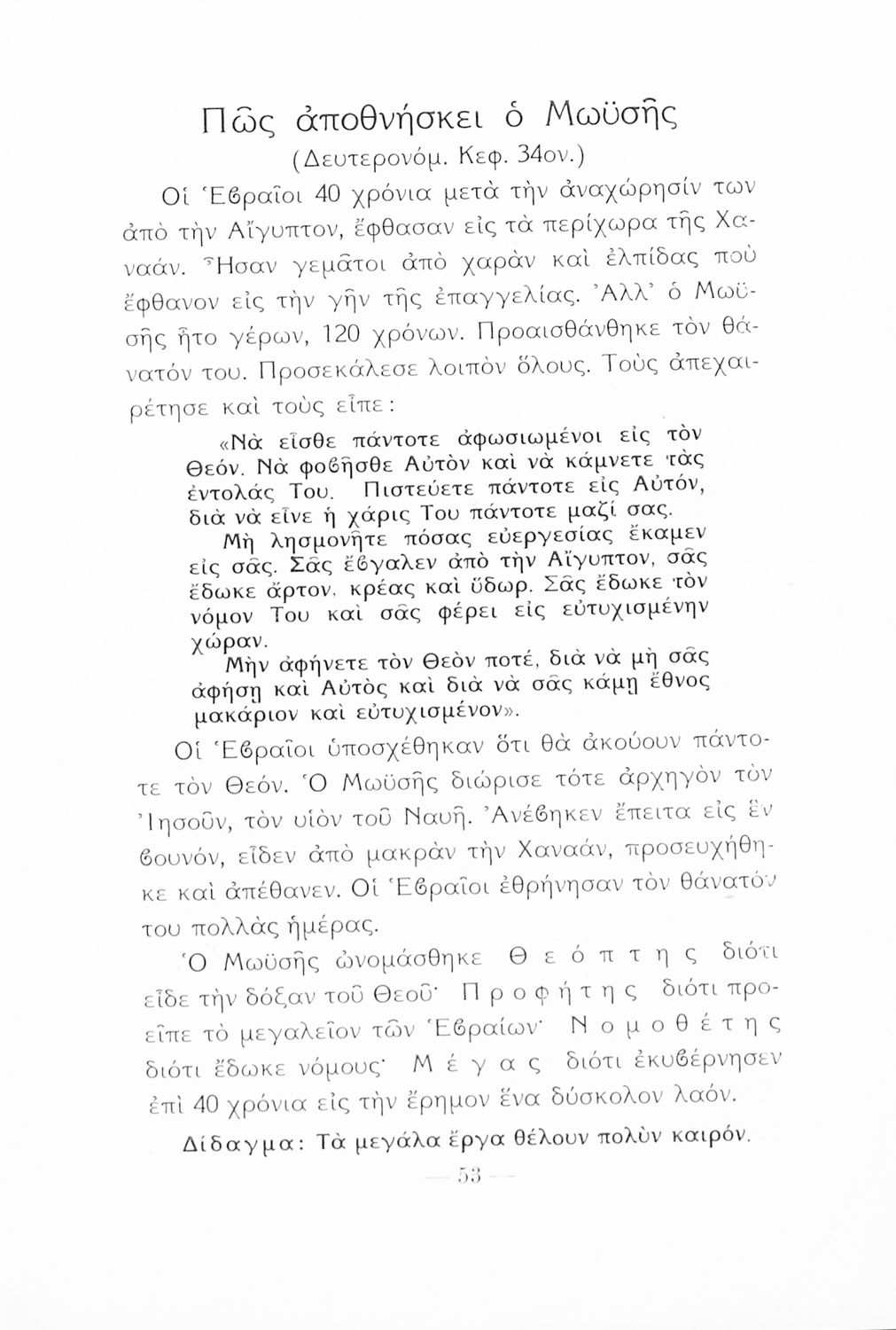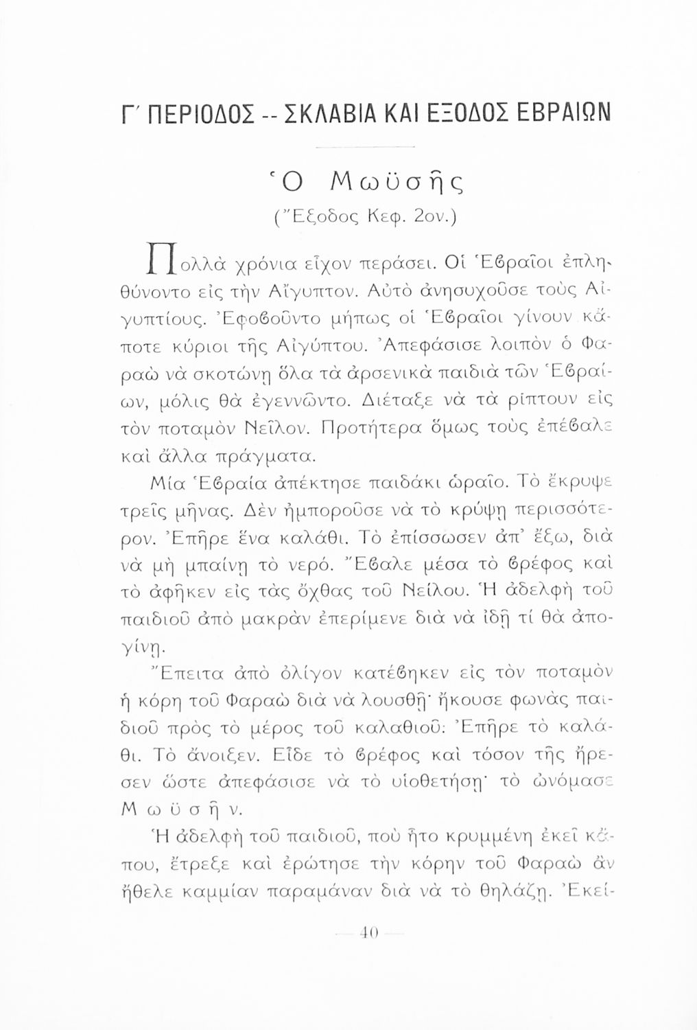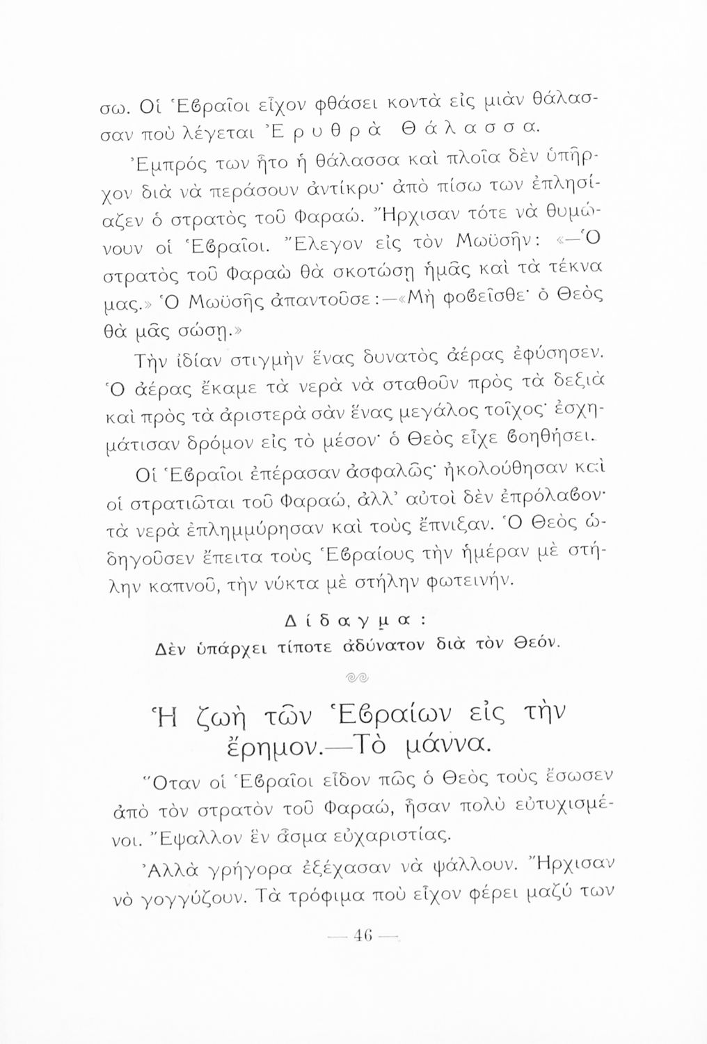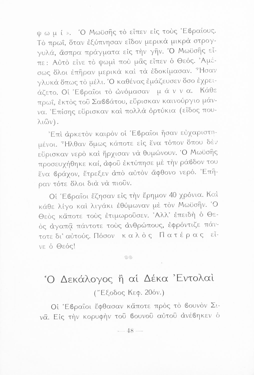 Σχολικό εγχειρίδιο Θρησκευτικών για τα Δημοτικά και Ελληνικά Σχολεία που περιλαμβάνει την ιστορία της Παλαιάς και της Καινής Διαθήκης από την δημιουργία του κόσμου μέχρι και την ανάληψη του Ιησού Χριστού.