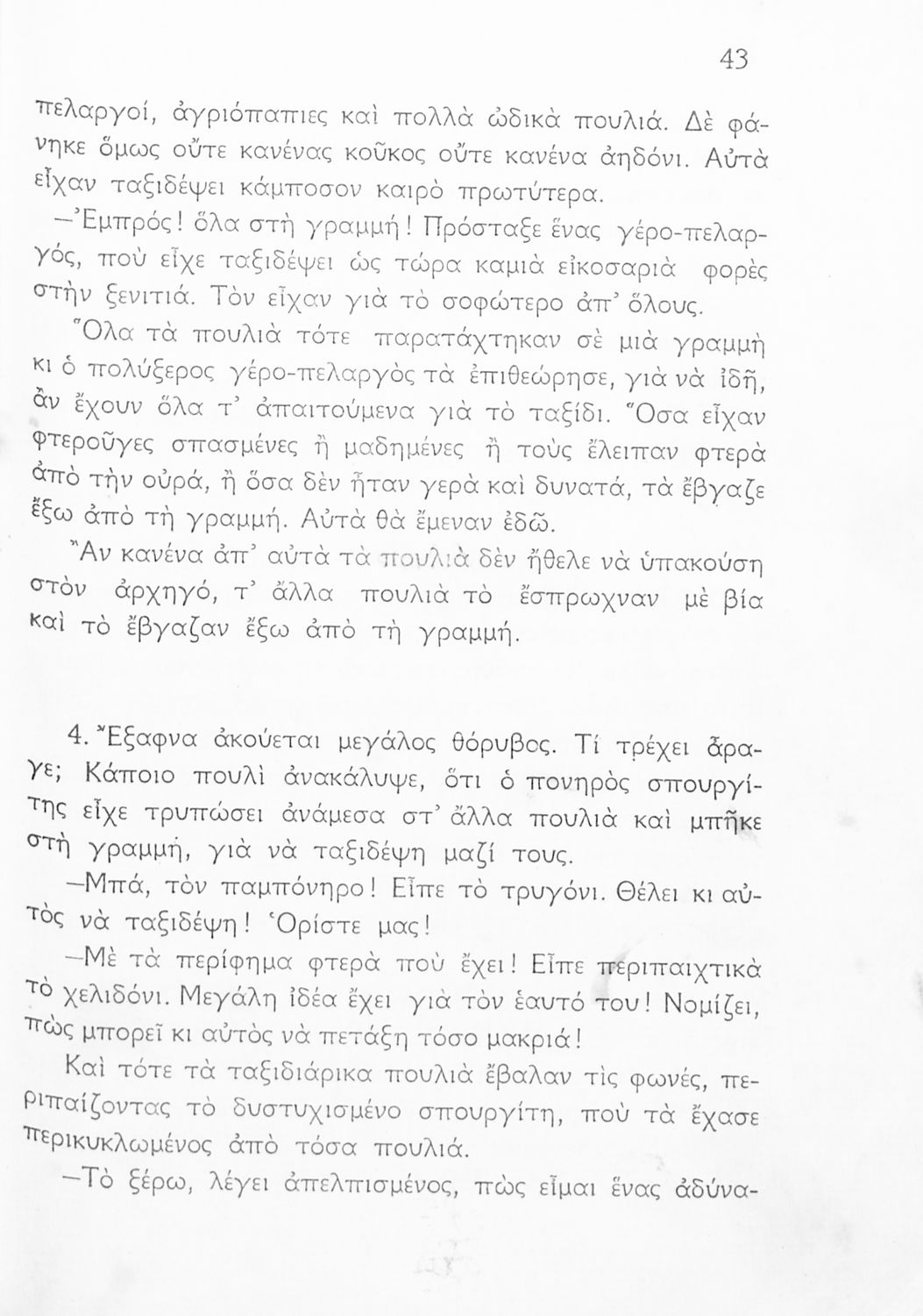 Αναγνωστικό Γ΄ Δημοτικού που περιλαμβάνει ποιήματα και πεζά εμπνευσμένα από τη ζωή της υπαίθρου, την οικογενειακή και κοινωνική ζωή και το εθνικό παρελθόν. Αποτυπώνει τις ιδεολογικές προκείμενες του μεταξικού καθεστώτος τόσο όσον αφορά το περιεχόμενο (“Ο στρατός περνά”, “4η Αυγούστου” και “Ύμνος της Εθνικής Νεολαίας”) όσο και την εικονογράφηση καθώς το εξώφυλλο του βιβλίου κοσμείται από τον χαρακτηριστικό φασιστικό χαιρετισμό δύο παιδιών.