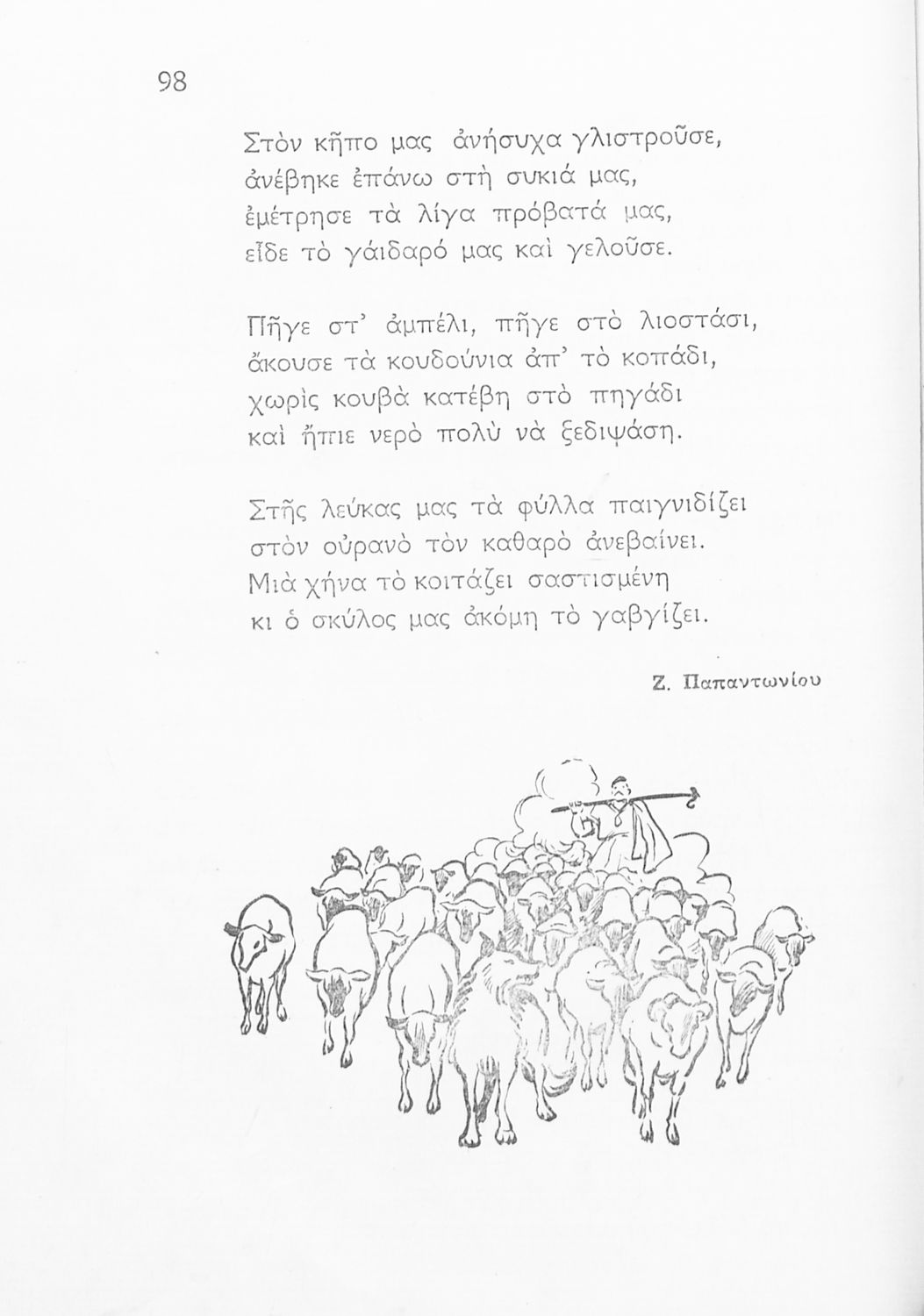 Αναγνωστικό Γ΄ Δημοτικού που περιλαμβάνει ποιήματα και πεζά εμπνευσμένα από τη ζωή της υπαίθρου, την οικογενειακή και κοινωνική ζωή και το εθνικό παρελθόν. Αποτυπώνει τις ιδεολογικές προκείμενες του μεταξικού καθεστώτος τόσο όσον αφορά το περιεχόμενο (“Ο στρατός περνά”, “4η Αυγούστου” και “Ύμνος της Εθνικής Νεολαίας”) όσο και την εικονογράφηση καθώς το εξώφυλλο του βιβλίου κοσμείται από τον χαρακτηριστικό φασιστικό χαιρετισμό δύο παιδιών.