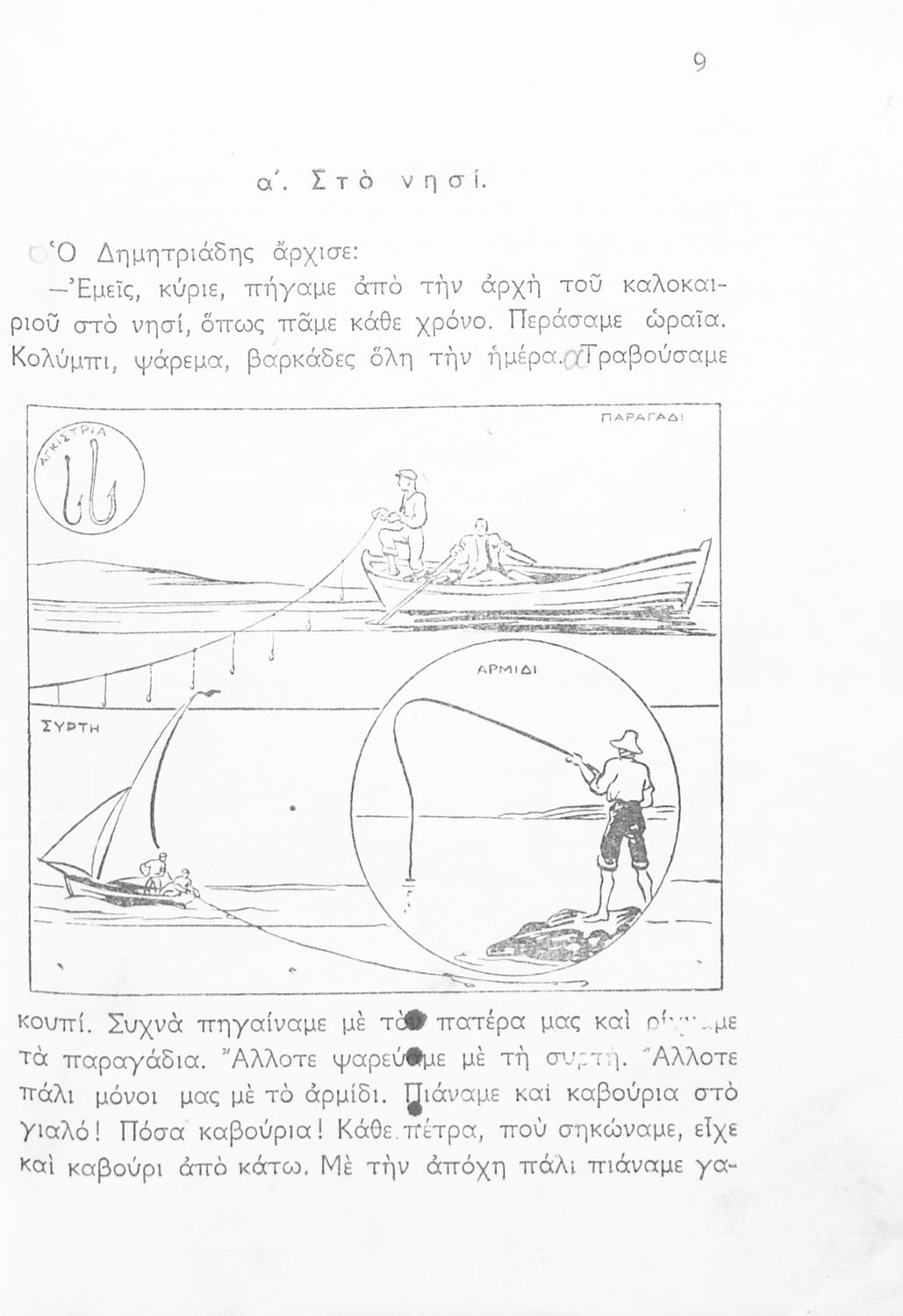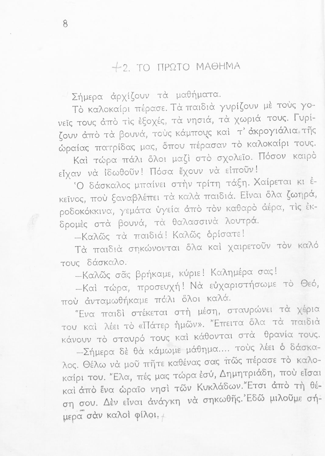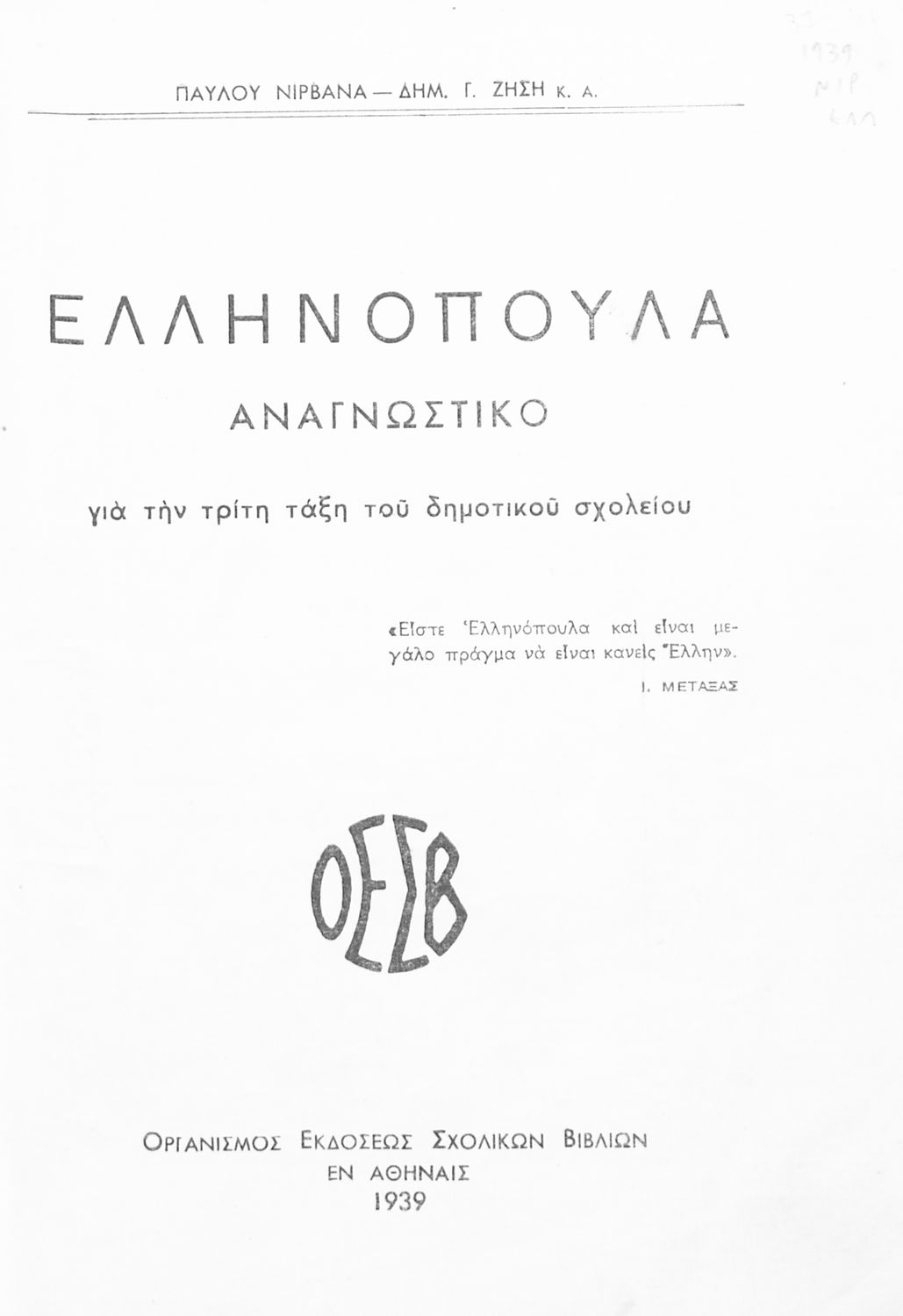 Βαθμίδα εκπαίδευσης: Πρωτοβάθμια Τάξη: Γ' Δημοτικού Μάθημα: Νέα Ελληνικά Γλώσσα: Δημοτική Παρουσίαση περιεχομένου: Αναγνωστικό Γ΄ Δημοτικού που περιλαμβάνει ποιήματα και πεζά εμπνευσμένα από τη ζωή της υπαίθρου, την οικογενειακή και κοινωνική ζωή και το εθνικό παρελθόν. Αποτυπώνει τις ιδεολογικές προκείμενες του μεταξικού καθεστώτος τόσο όσον αφορά το περιεχόμενο (“Ο στρατός περνά”, “4η Αυγούστου” και “Ύμνος της Εθνικής Νεολαίας”) όσο και την εικονογράφηση καθώς το εξώφυλλο του βιβλίου κοσμείται από τον χαρακτηριστικό φασιστικό χαιρετισμό δύο παιδιών. |